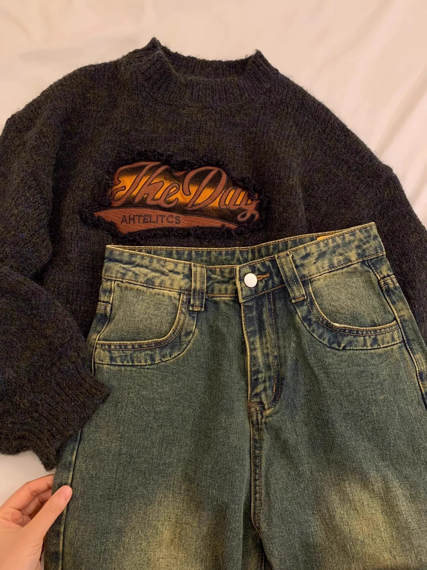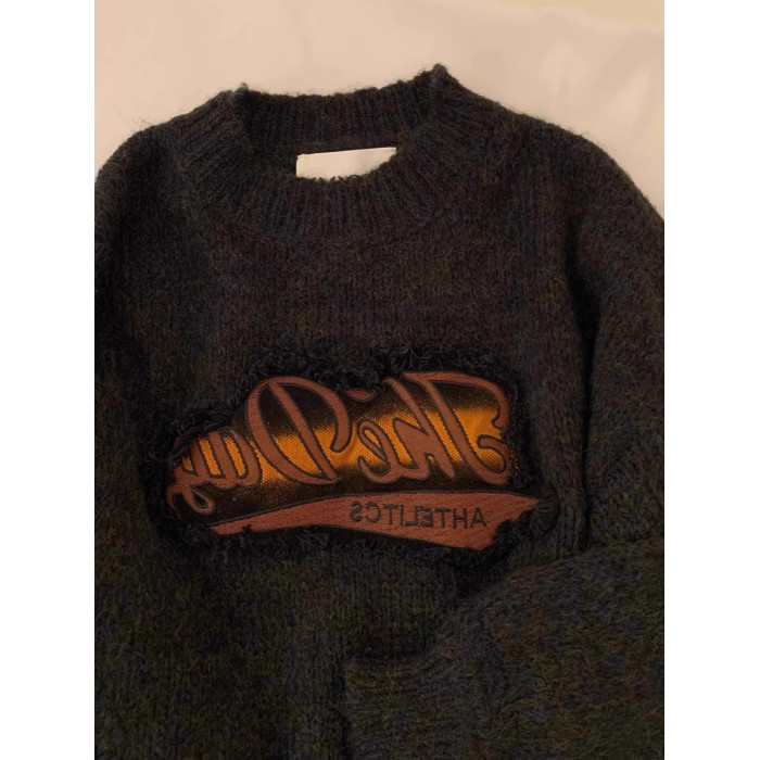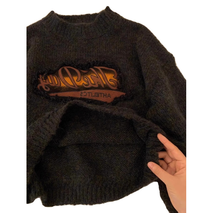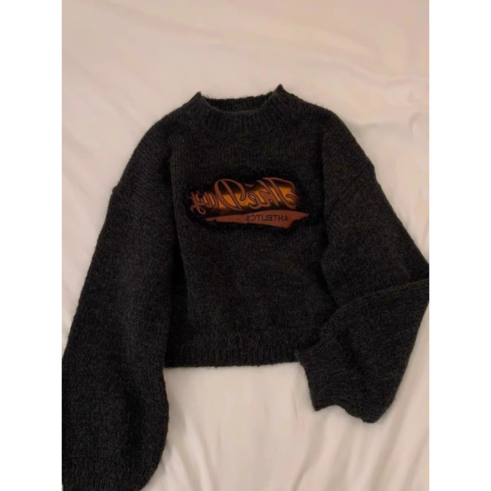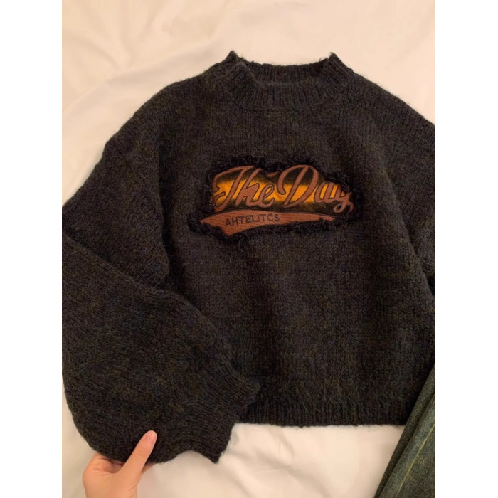 美式復古短款針織毛衣女秋冬季浣熊絨設計感小衆正肩寬松加厚外穿