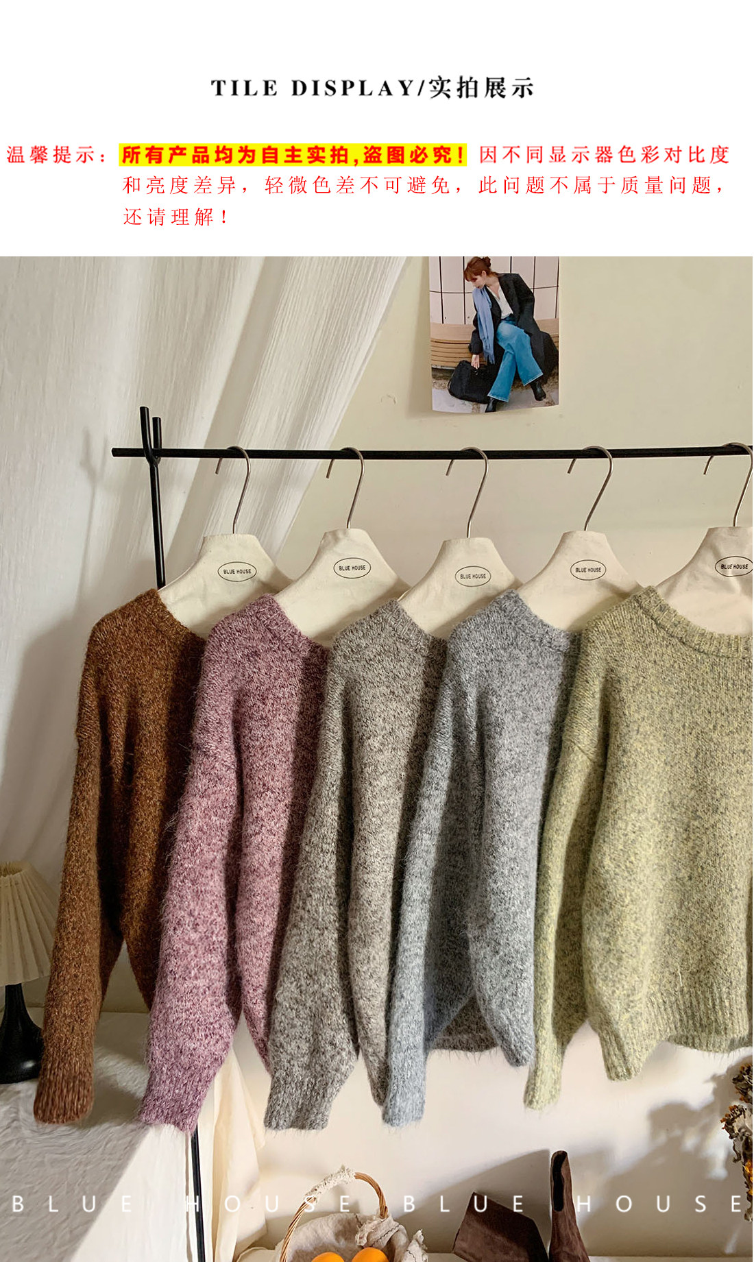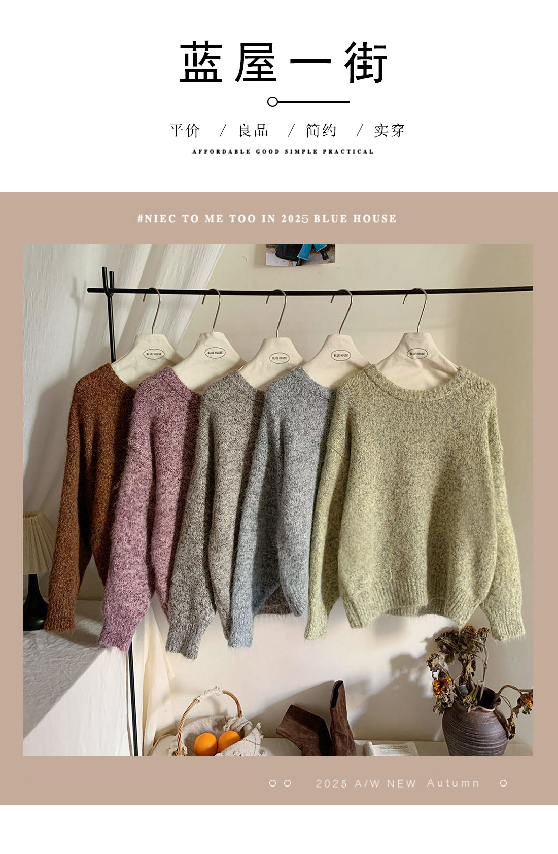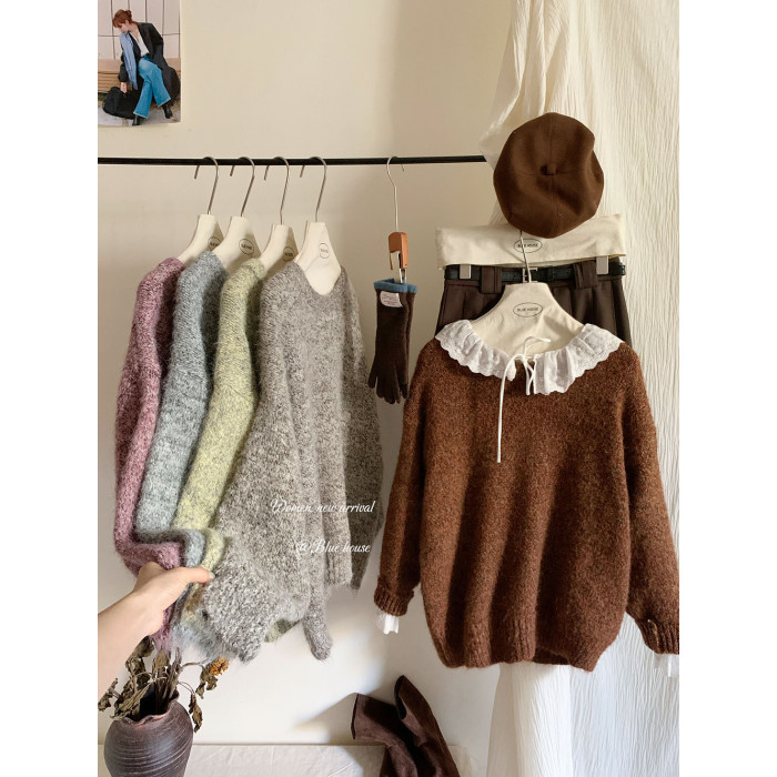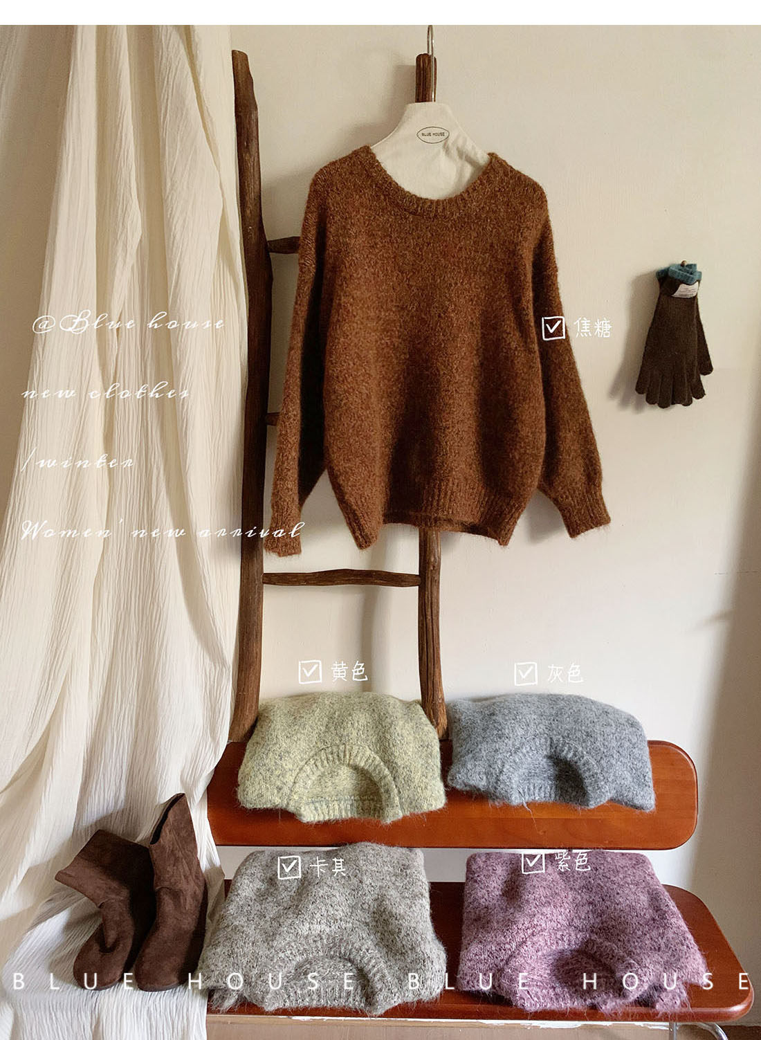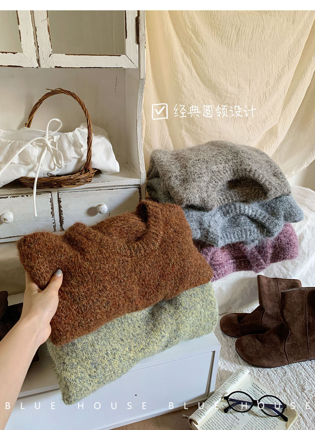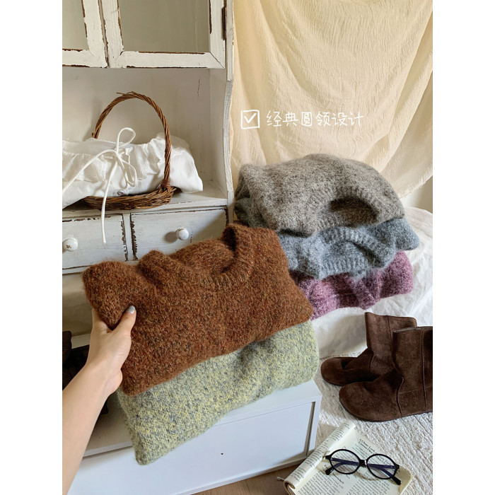 復古溫柔慵懶風軟糯花紗毛絨圓領毛衣女秋休閒寬松弛感長袖針織衫
