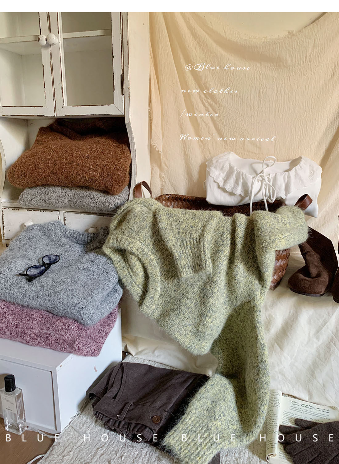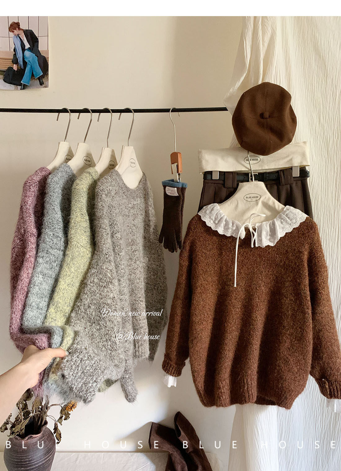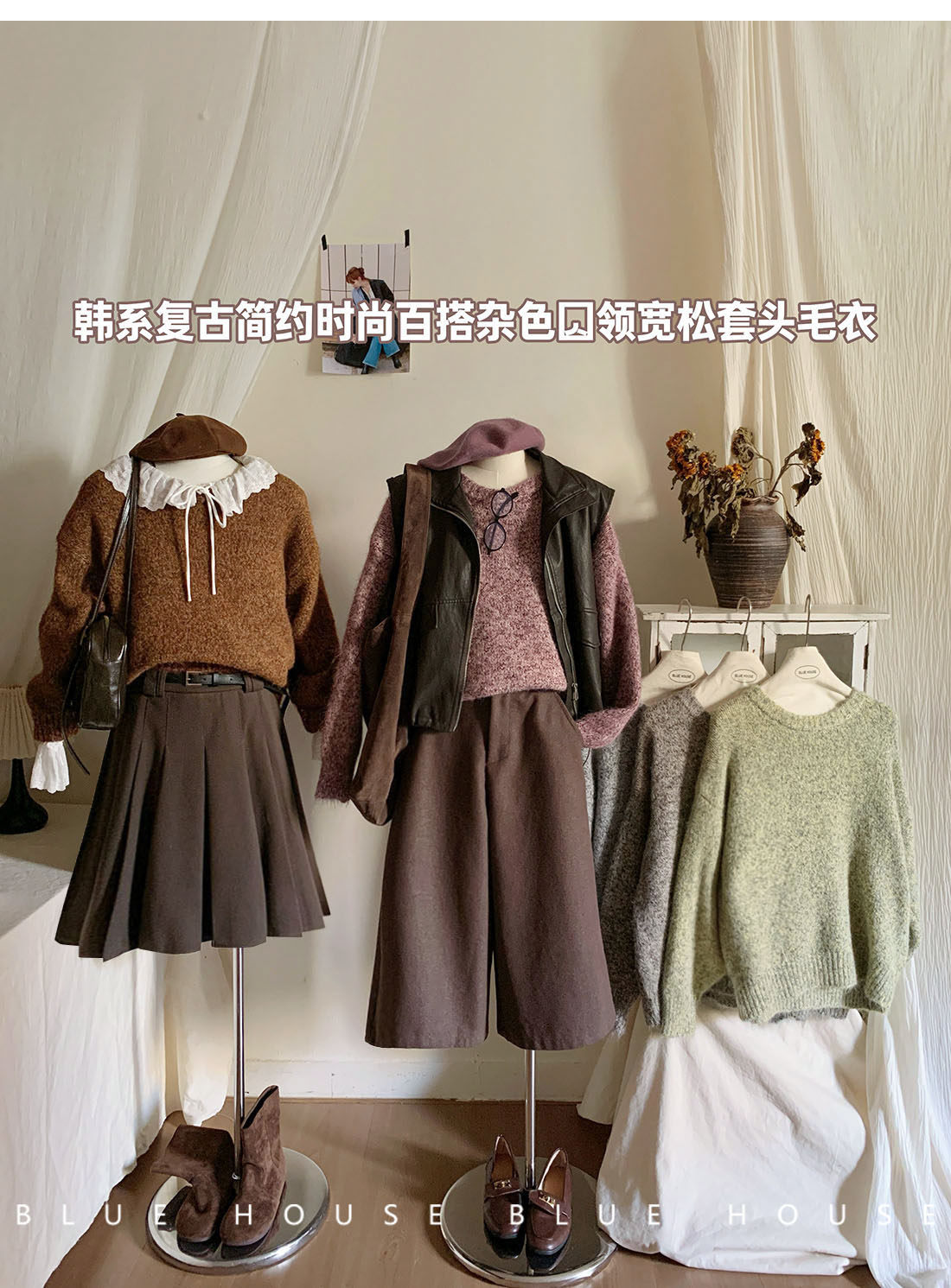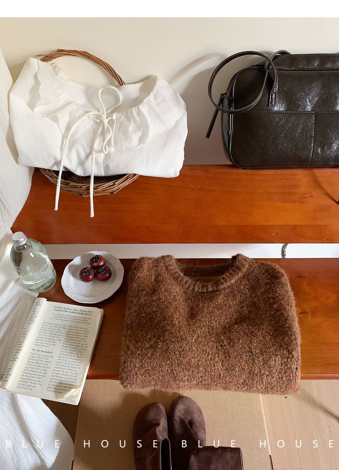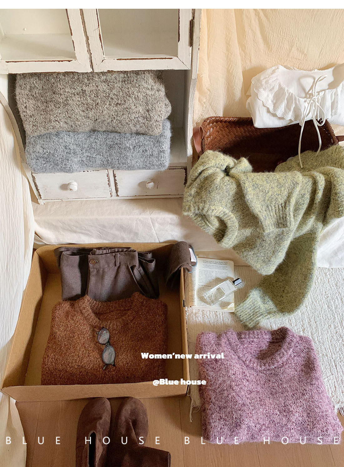 復古溫柔慵懶風軟糯花紗毛絨圓領毛衣女秋休閒寬松弛感長袖針織衫