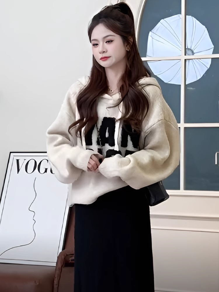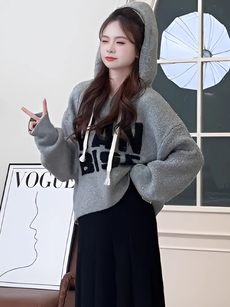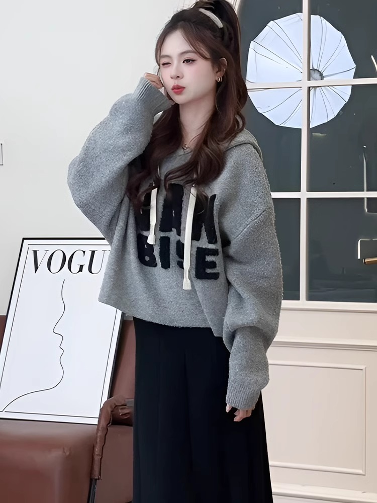 灰色慵懶風刺綉連帽長袖針織毛衣女款2024新款冬季寬松設計感上衣