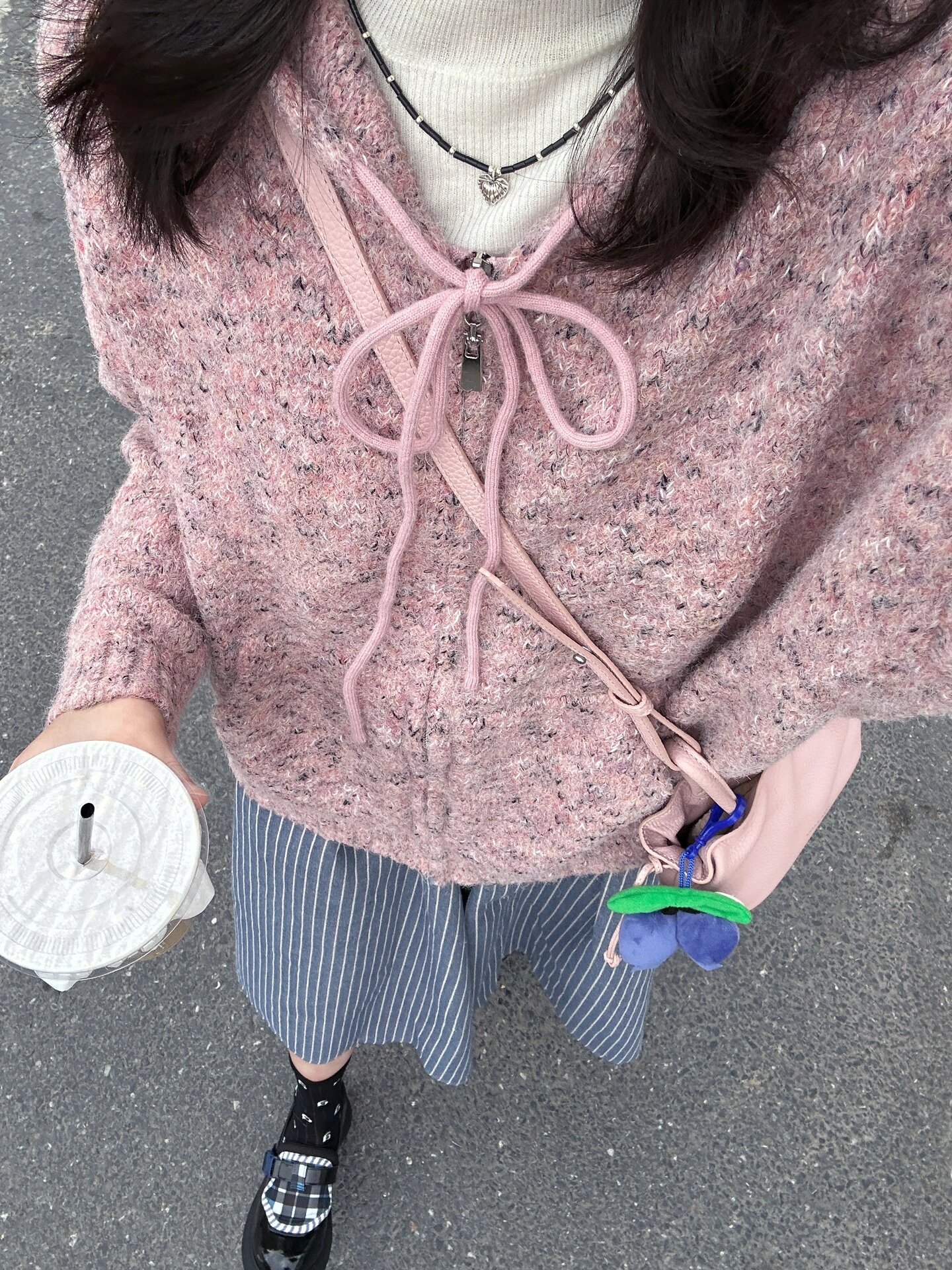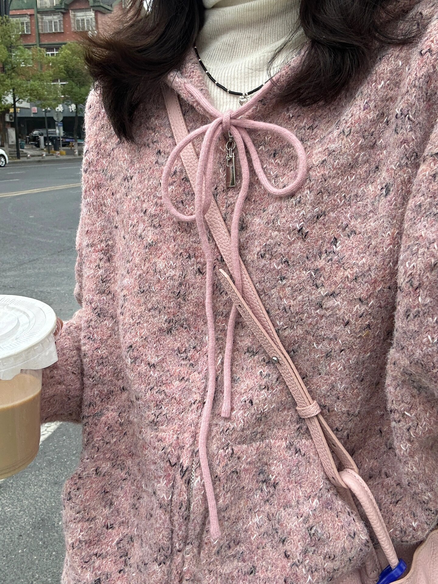 暗粉混雜色連帽拉鍊開衫外套毛衣女秋冬新款休閒寬松針織軟糯加厚