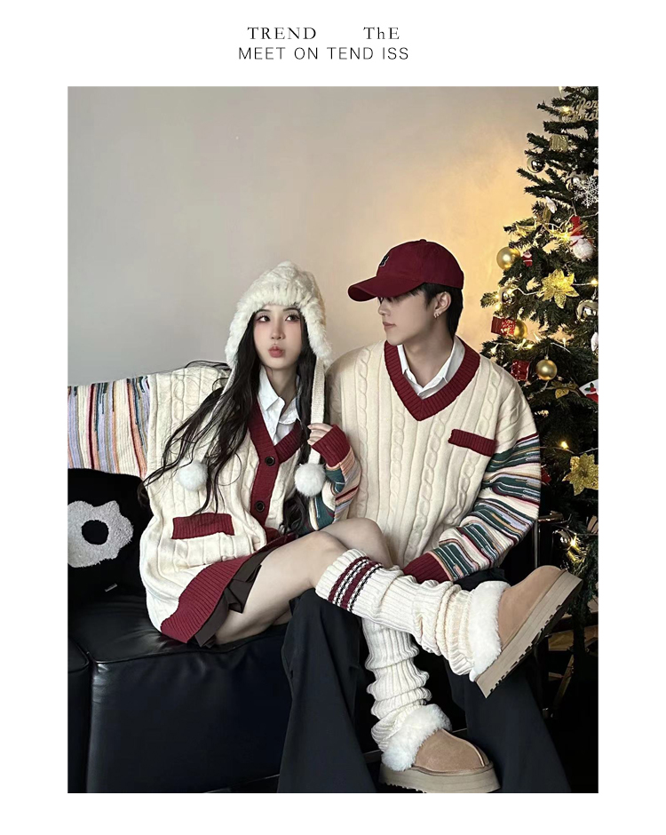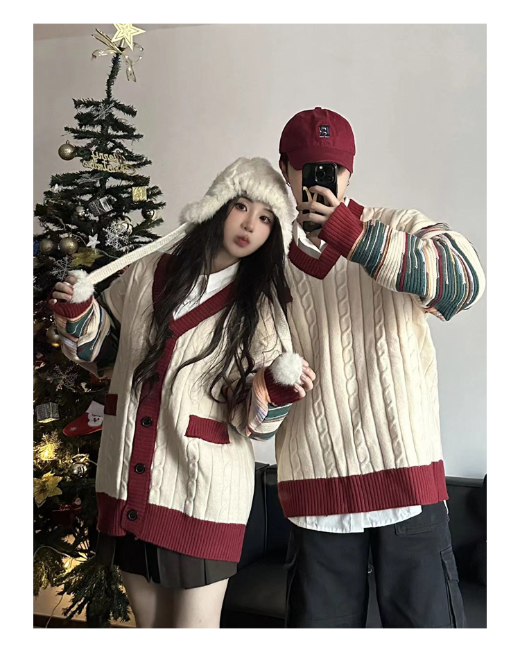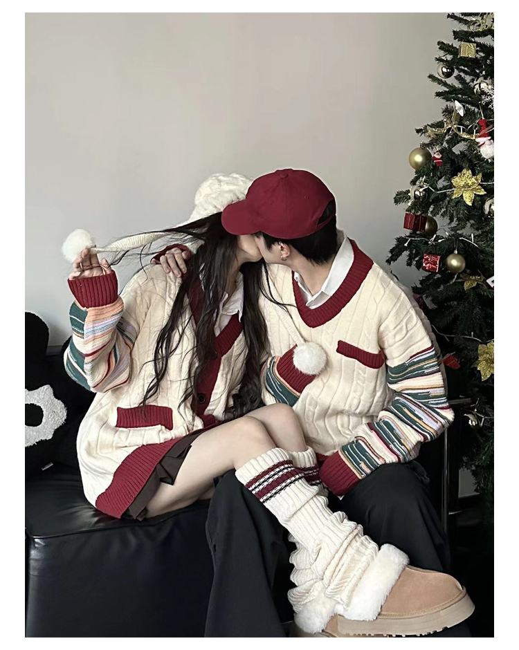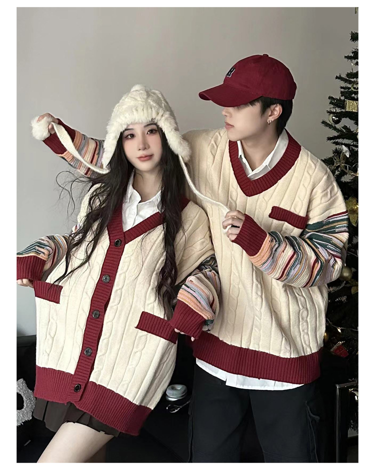 情侶裝冬季條紋拼接新年紅色套頭毛衣針織開衫學院風軟糯慵懶風潮