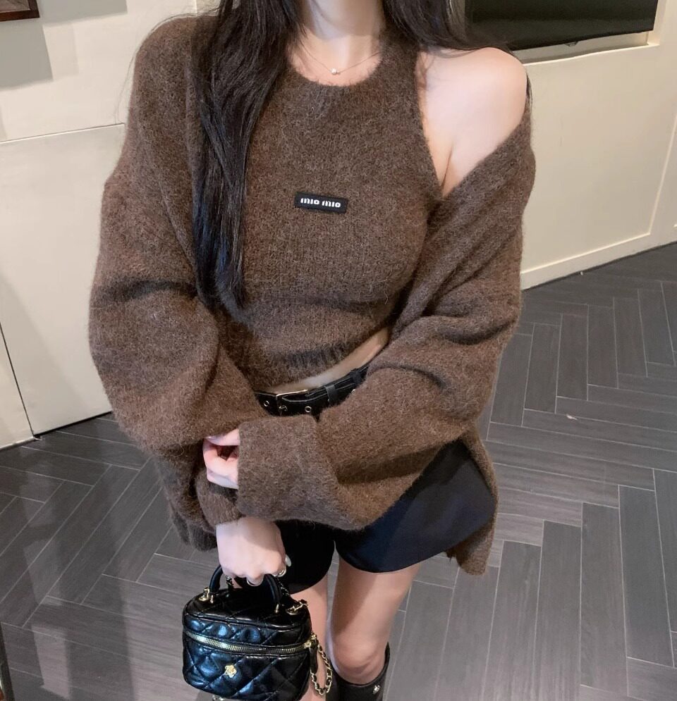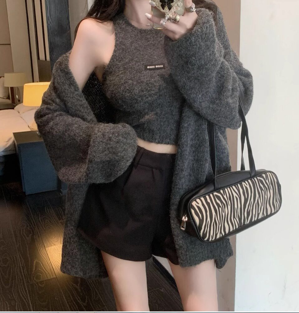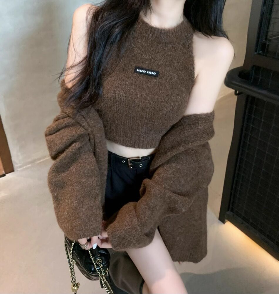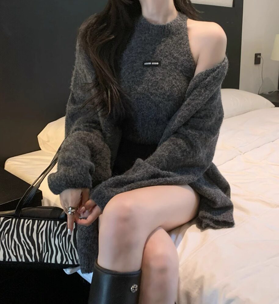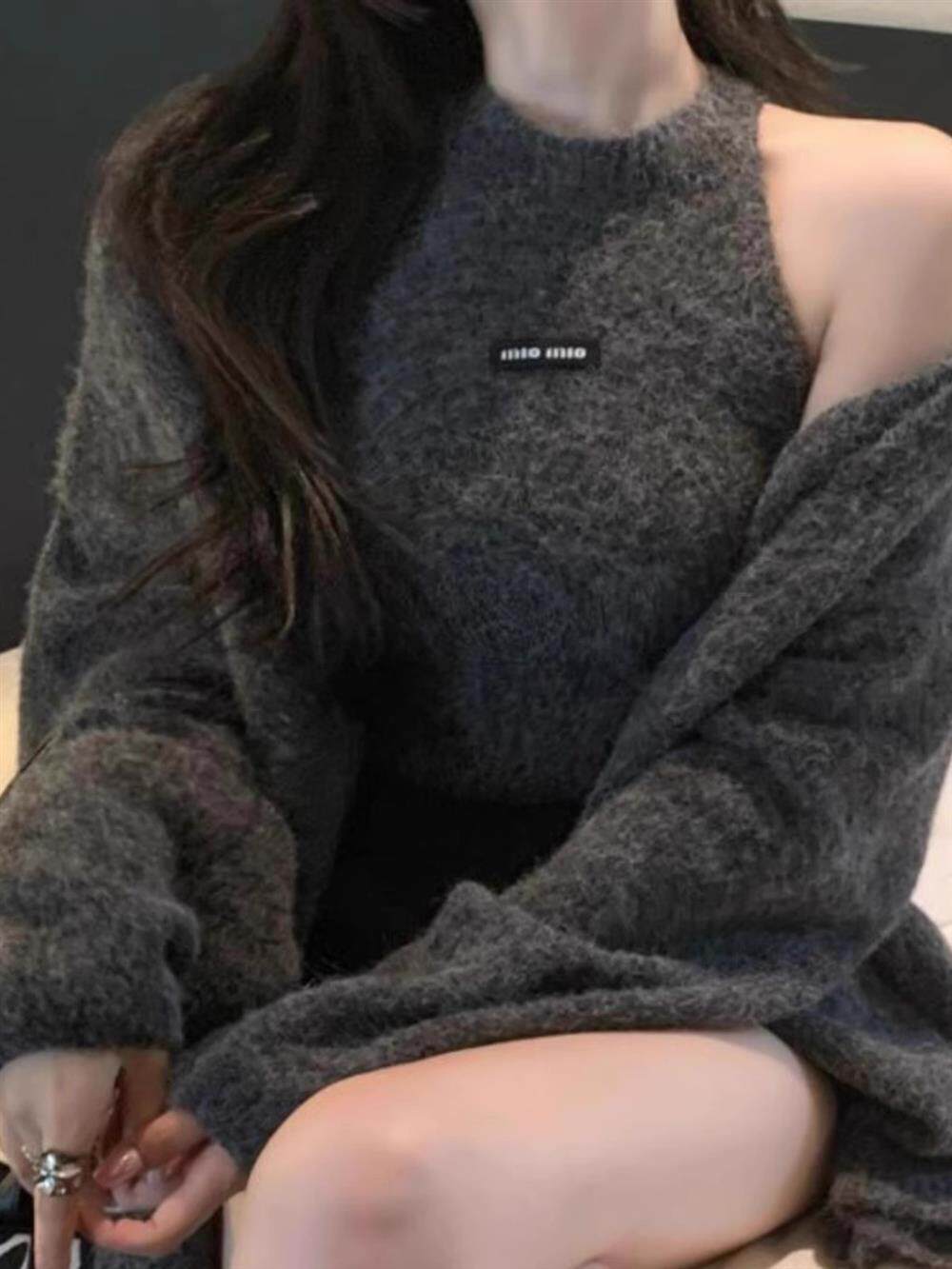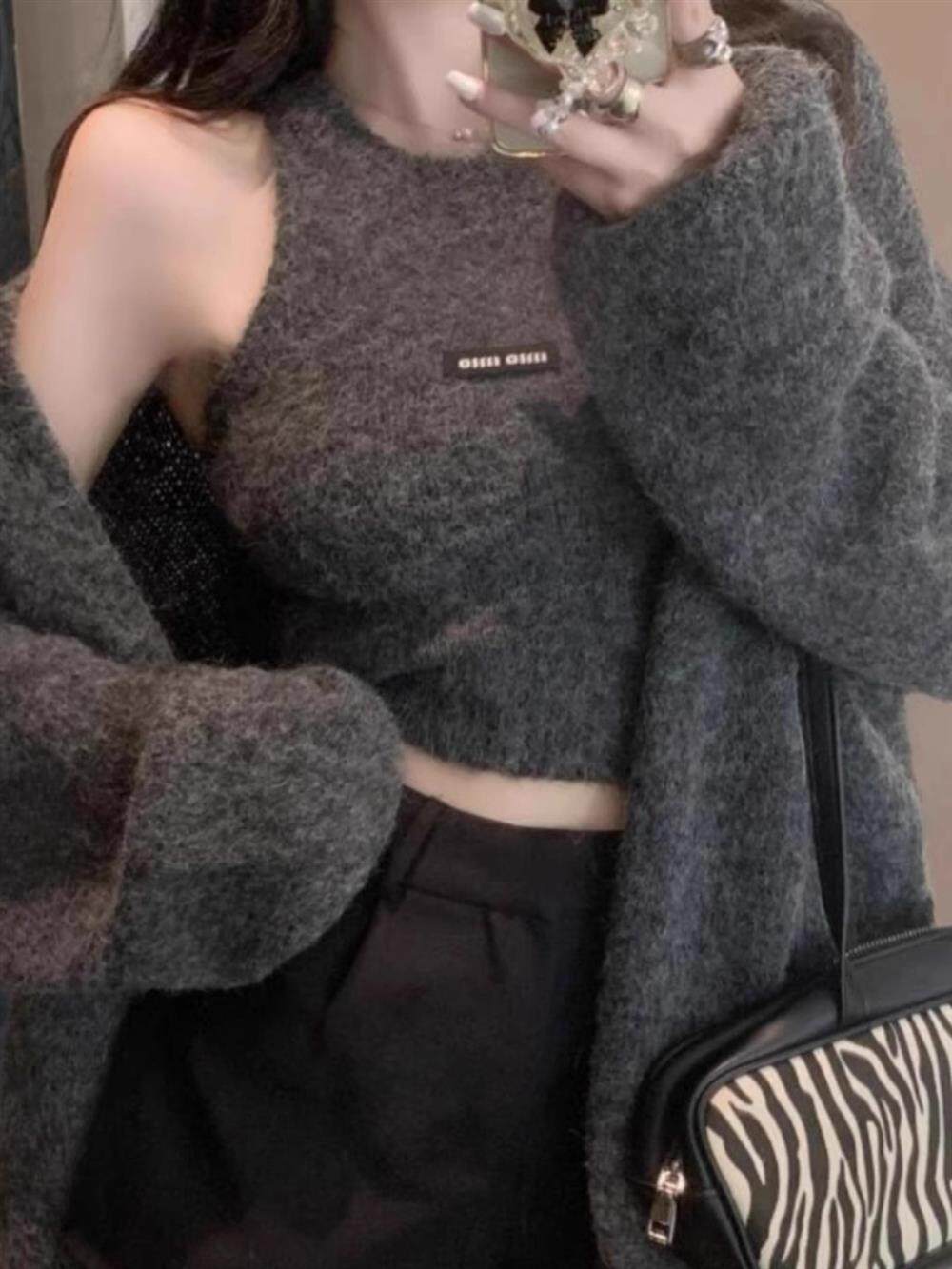 高級感慵懶風辣妹中長款毛衣外套女秋冬美拉德軟糯背心上衣兩件套