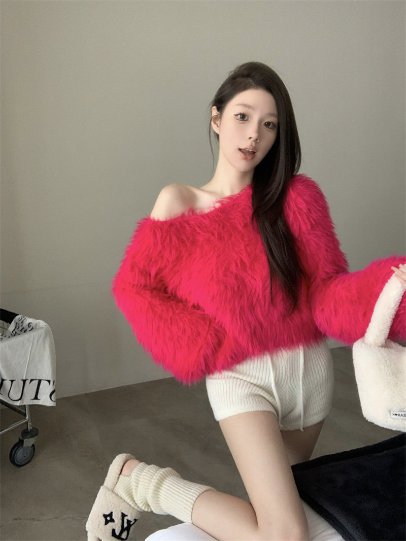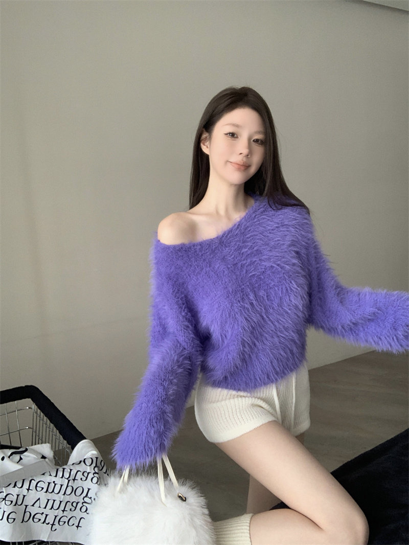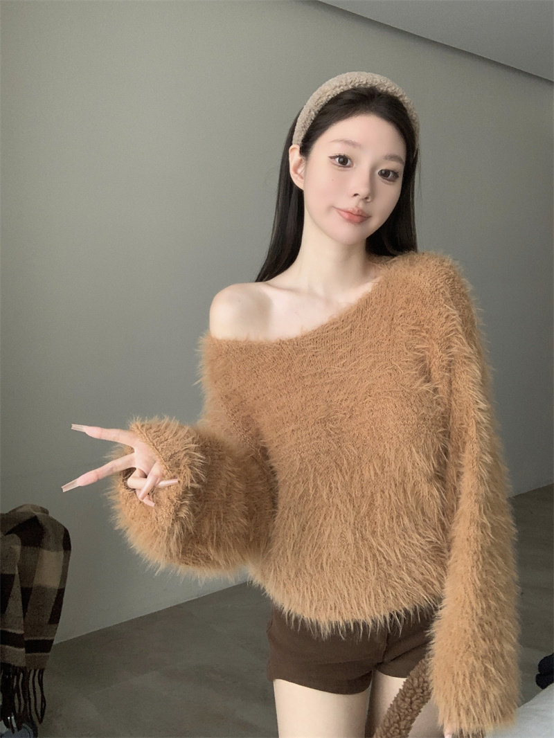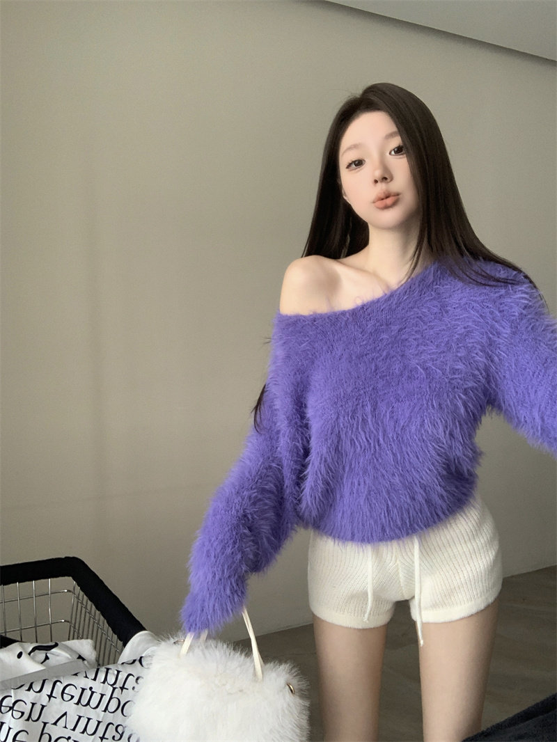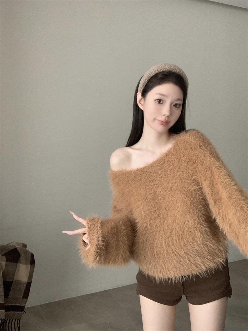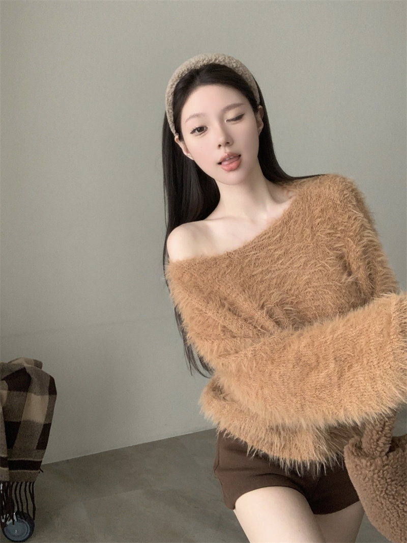 純欲風氣質斜領露肩長袖毛衣女冬季2025新款修身顯瘦套頭針織上衣