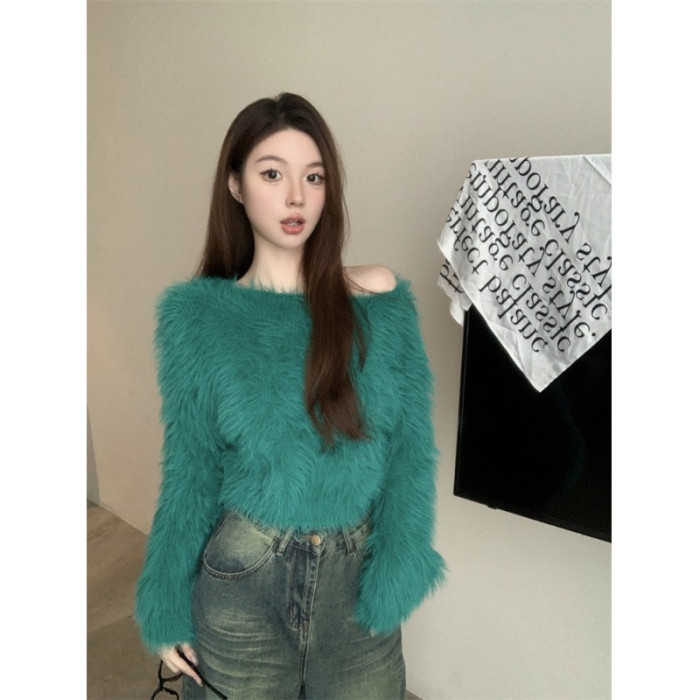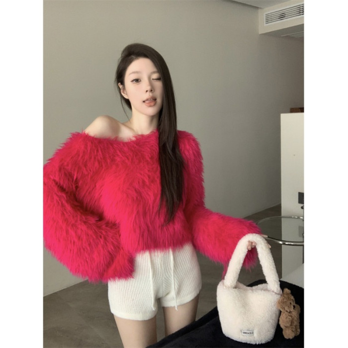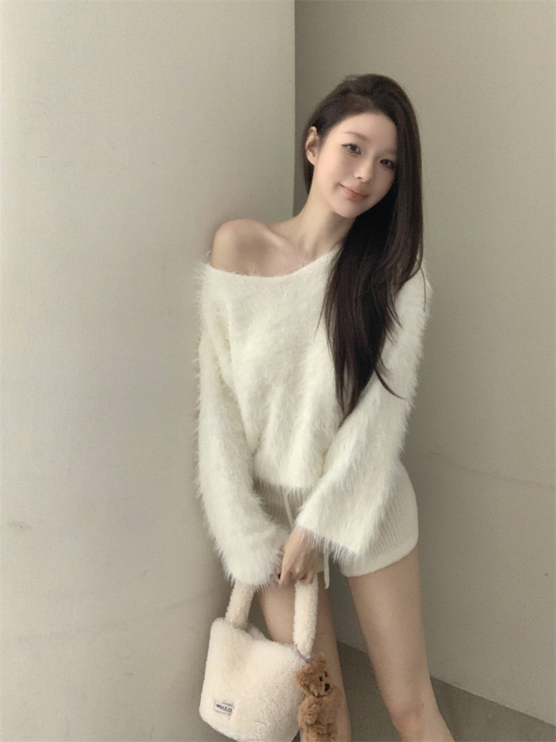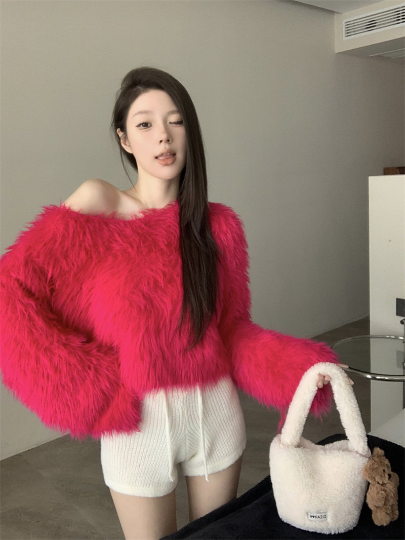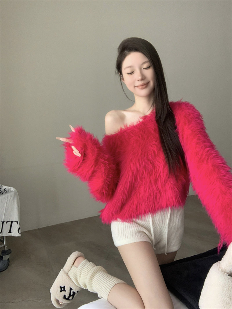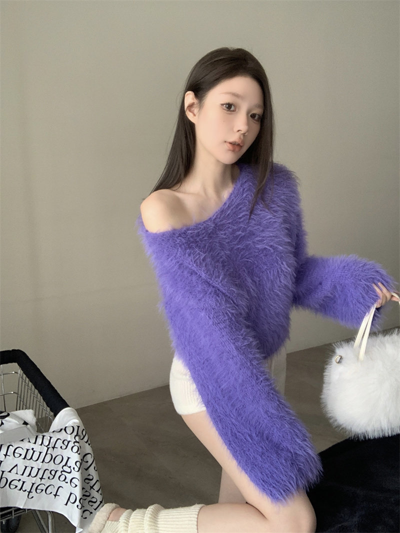 純欲風氣質斜領露肩長袖毛衣女冬季2025新款修身顯瘦套頭針織上衣