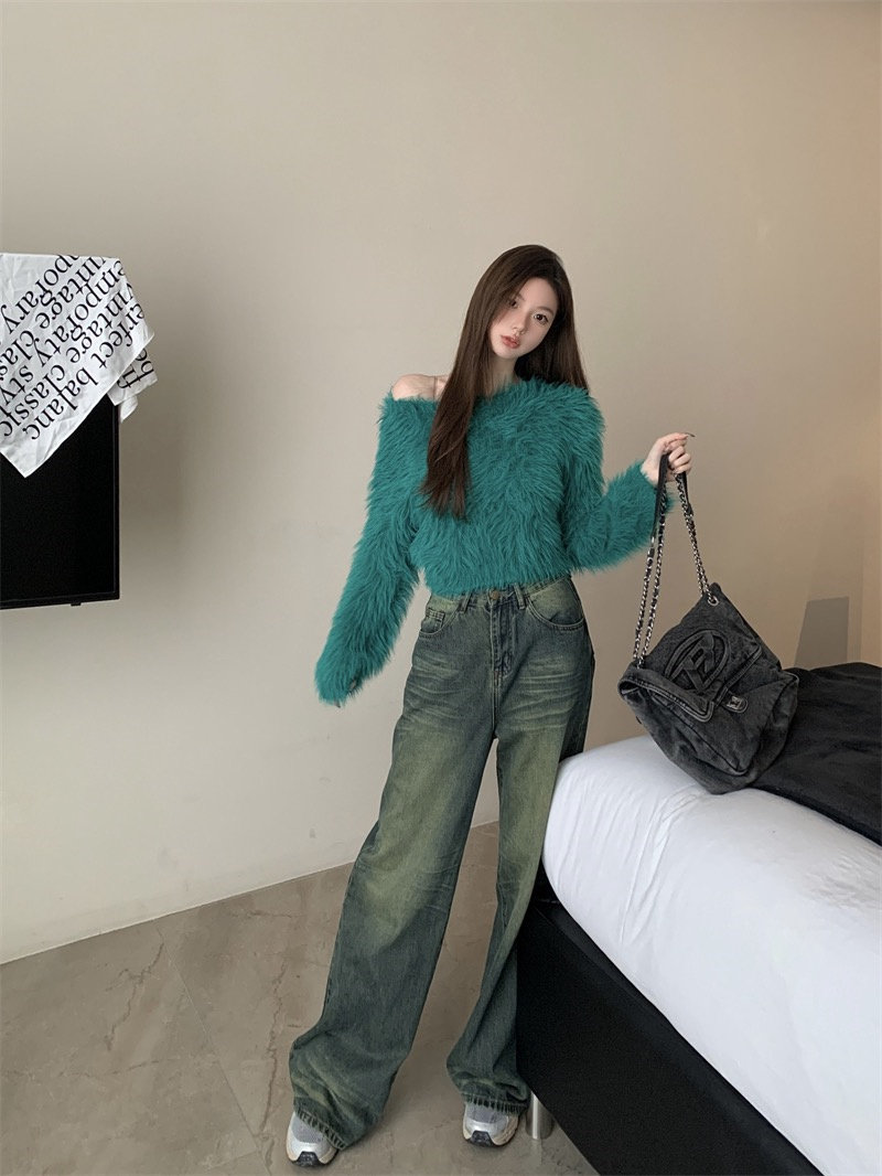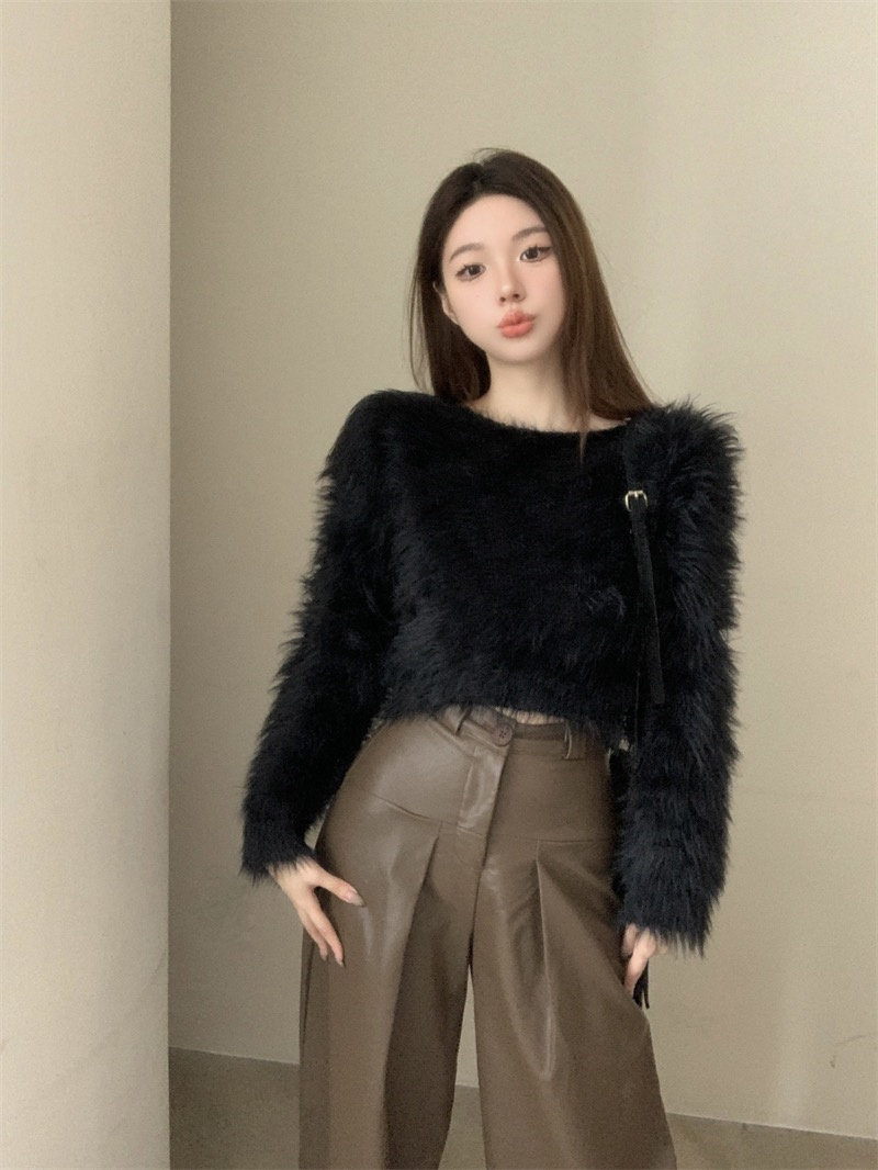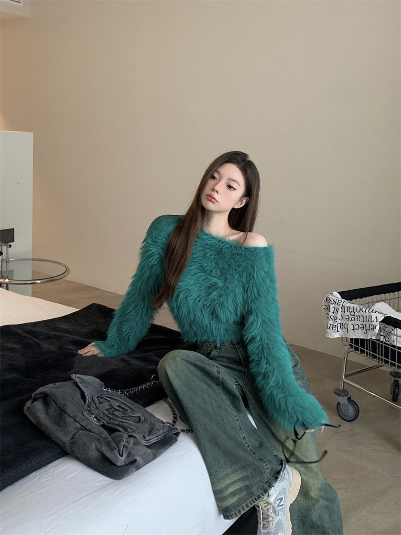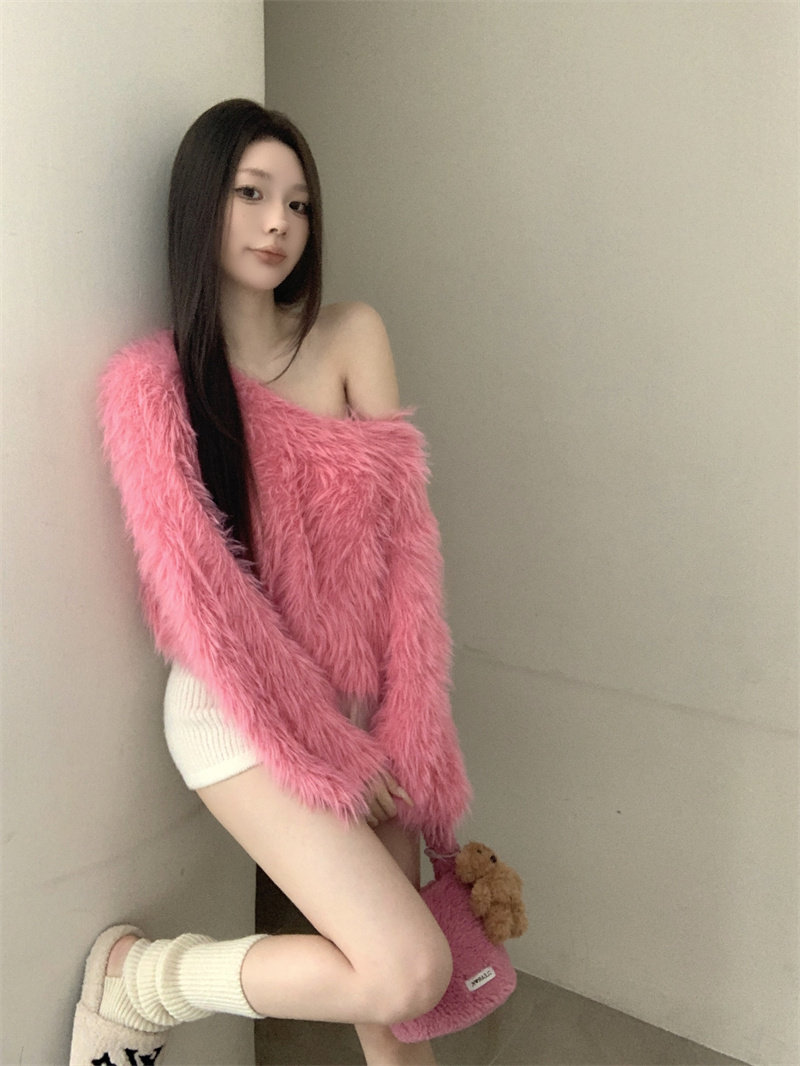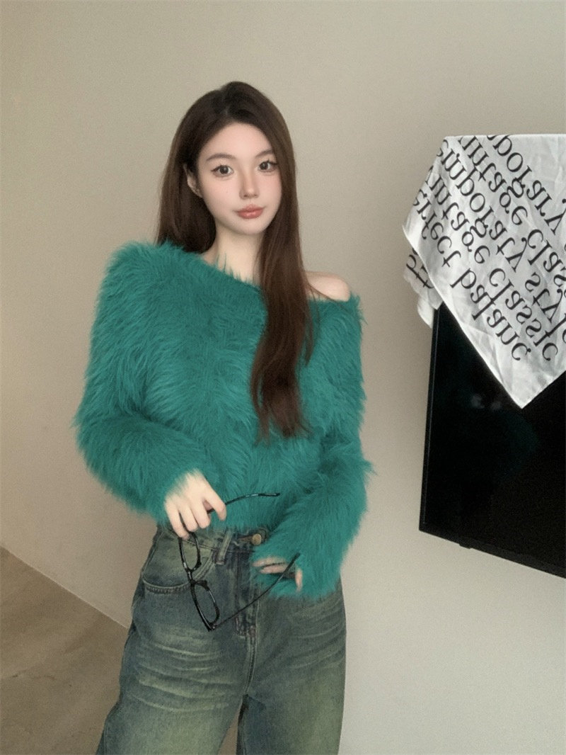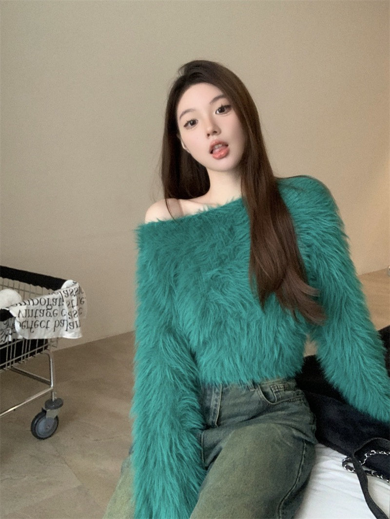 純欲風氣質斜領露肩長袖毛衣女冬季2025新款修身顯瘦套頭針織上衣