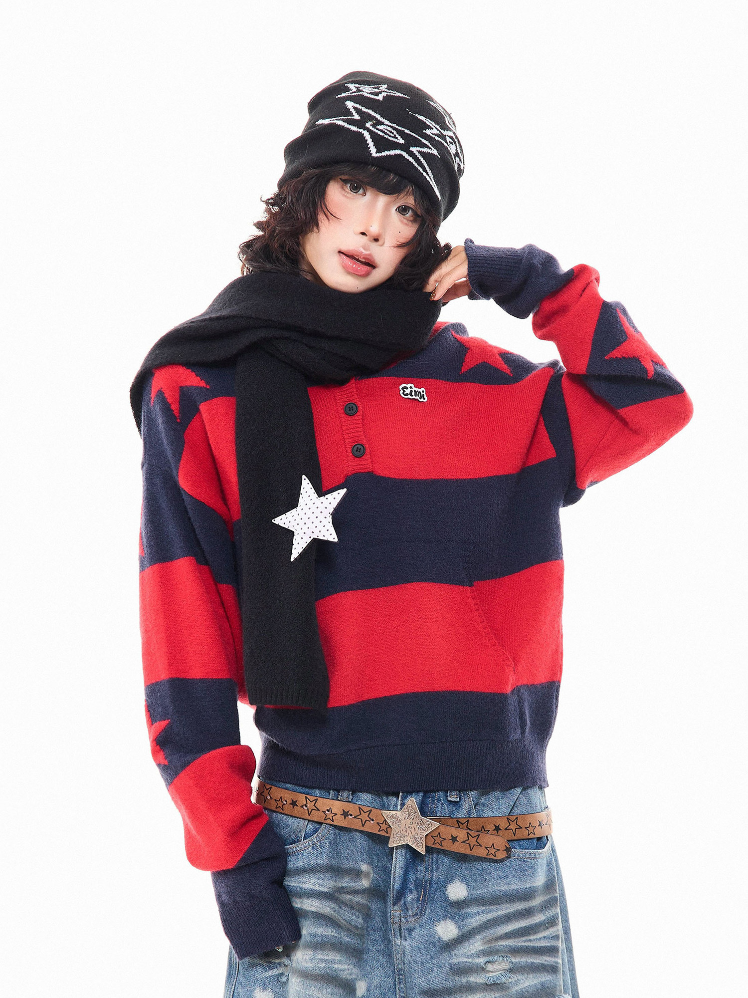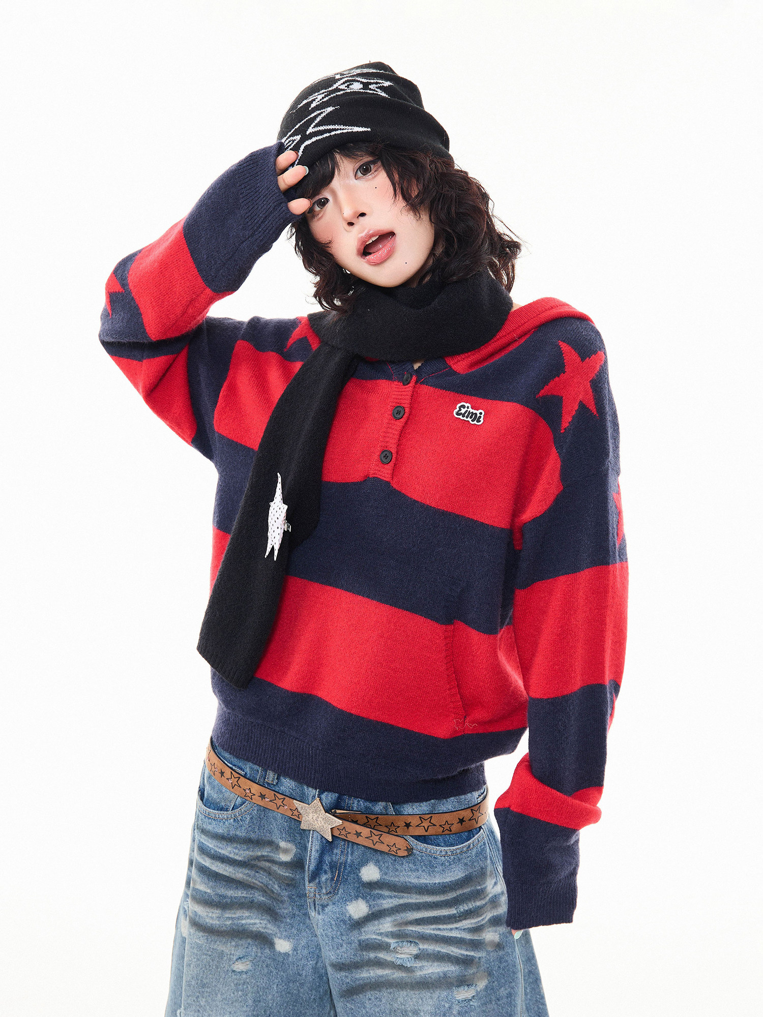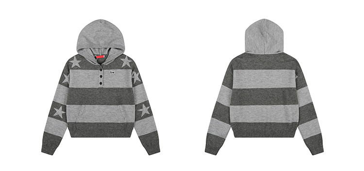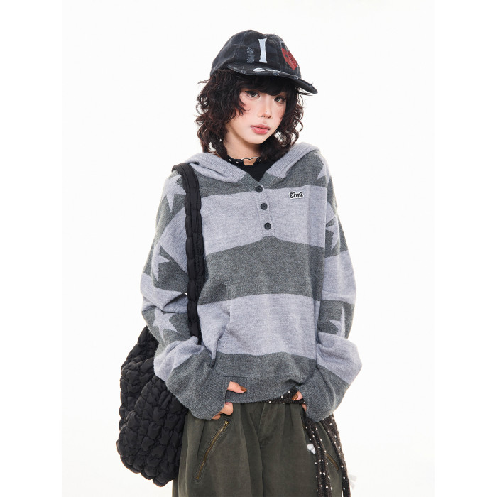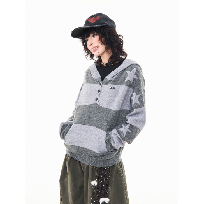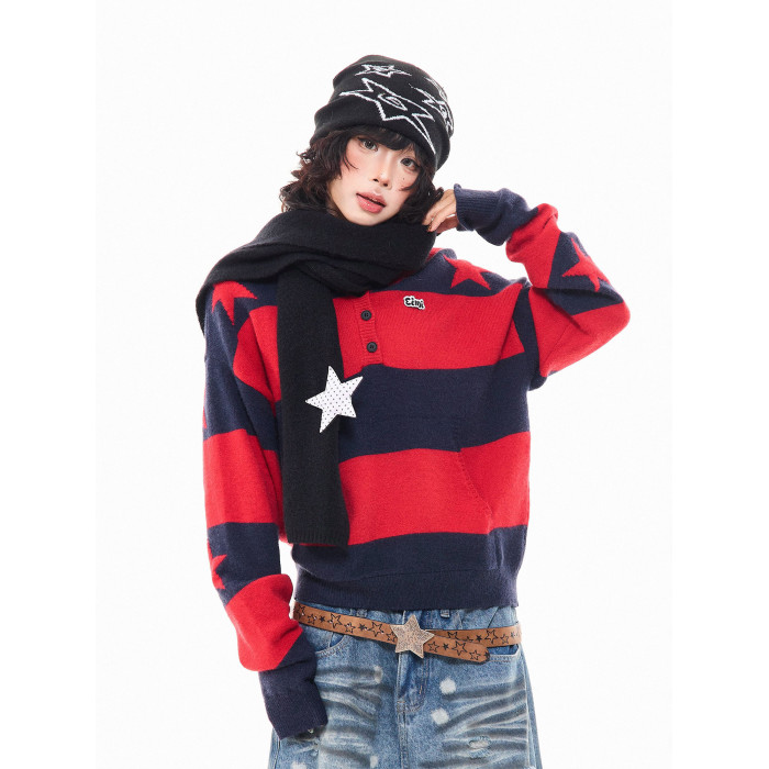 MKGO美式復古星星條紋連帽毛衣女秋季寬鬆撞色短款套頭針織衫上衣