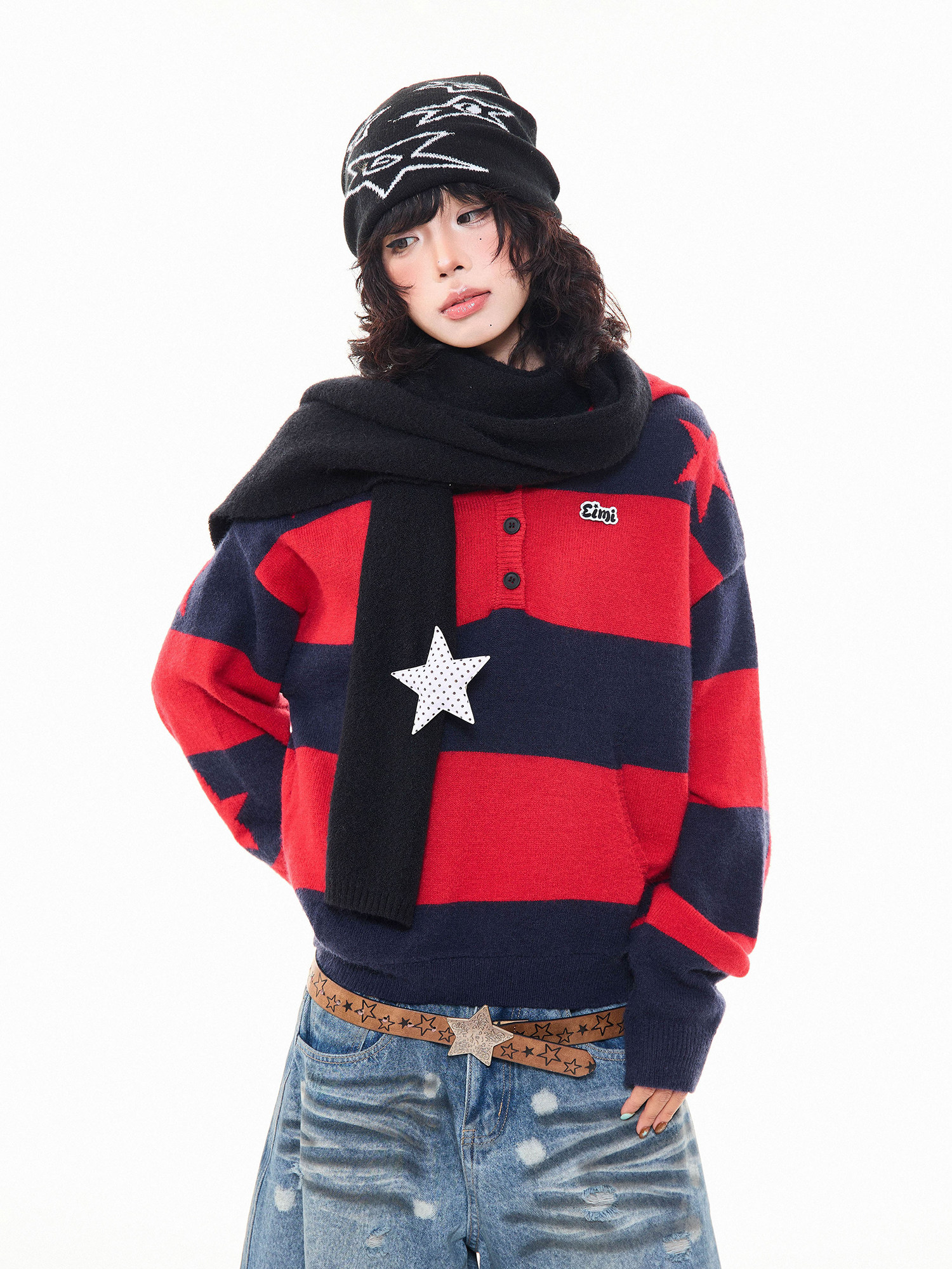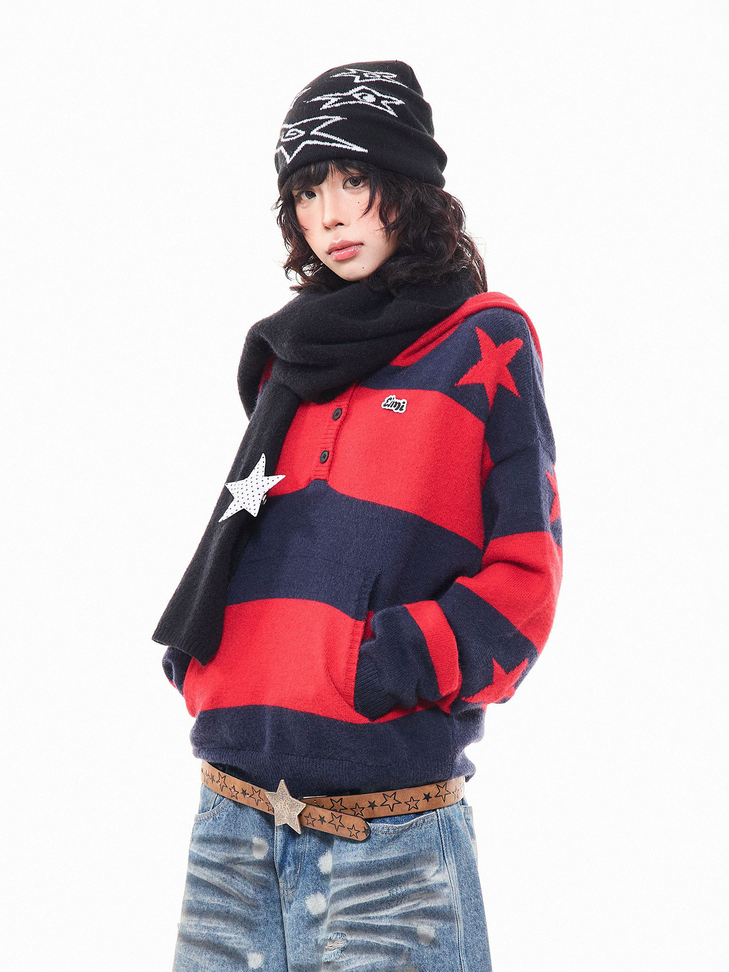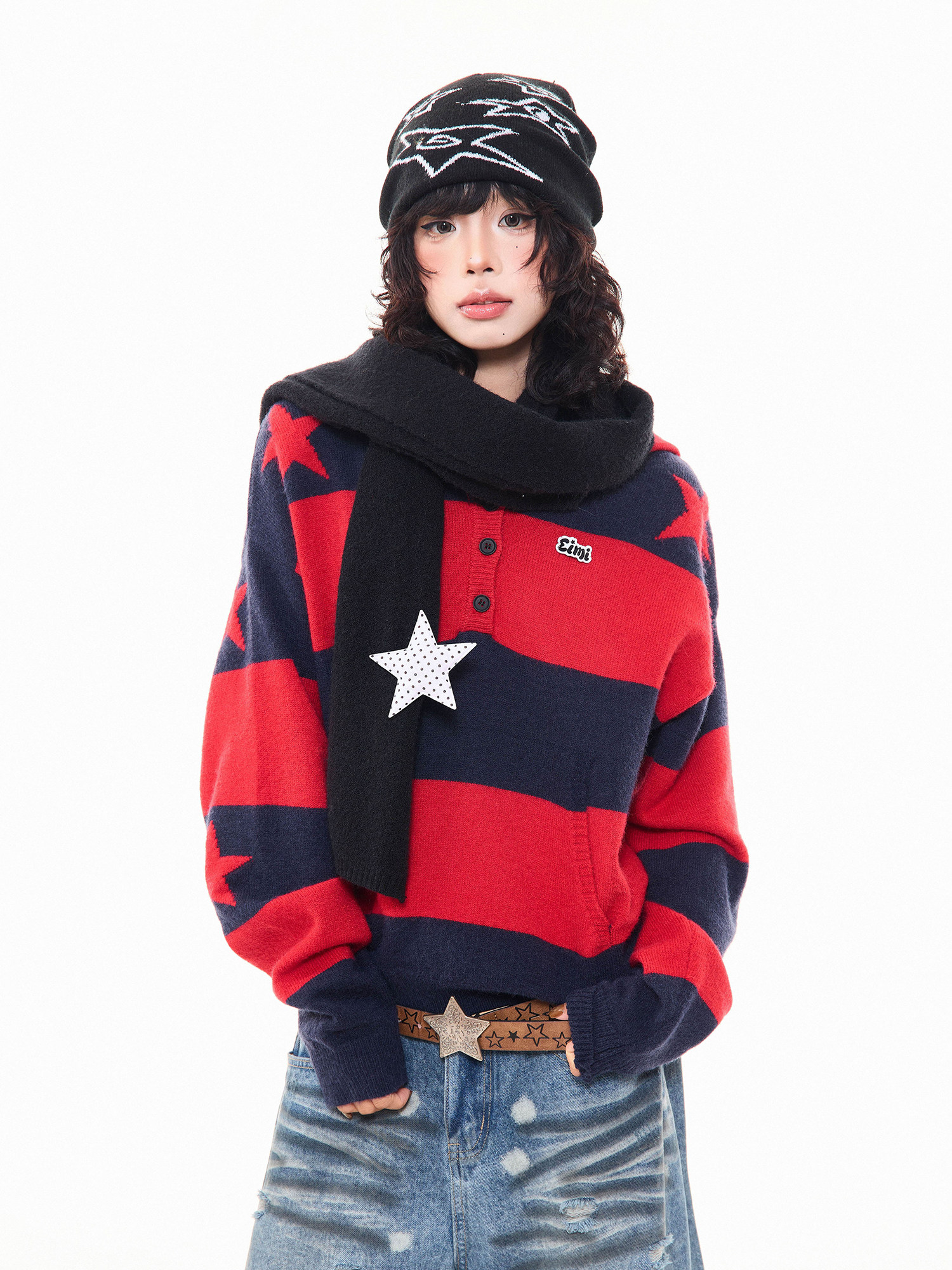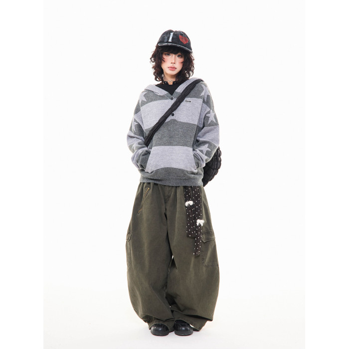 MKGO美式復古星星條紋連帽毛衣女秋季寬鬆撞色短款套頭針織衫上衣