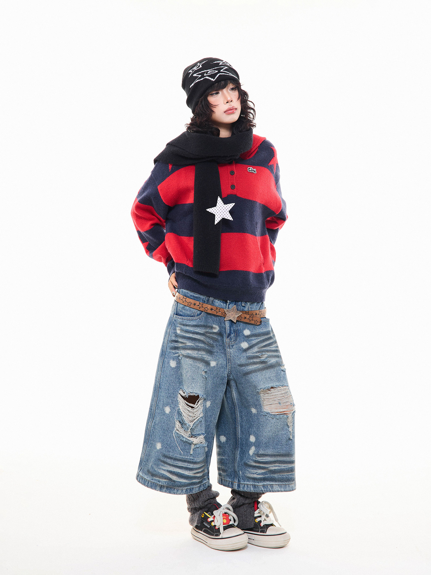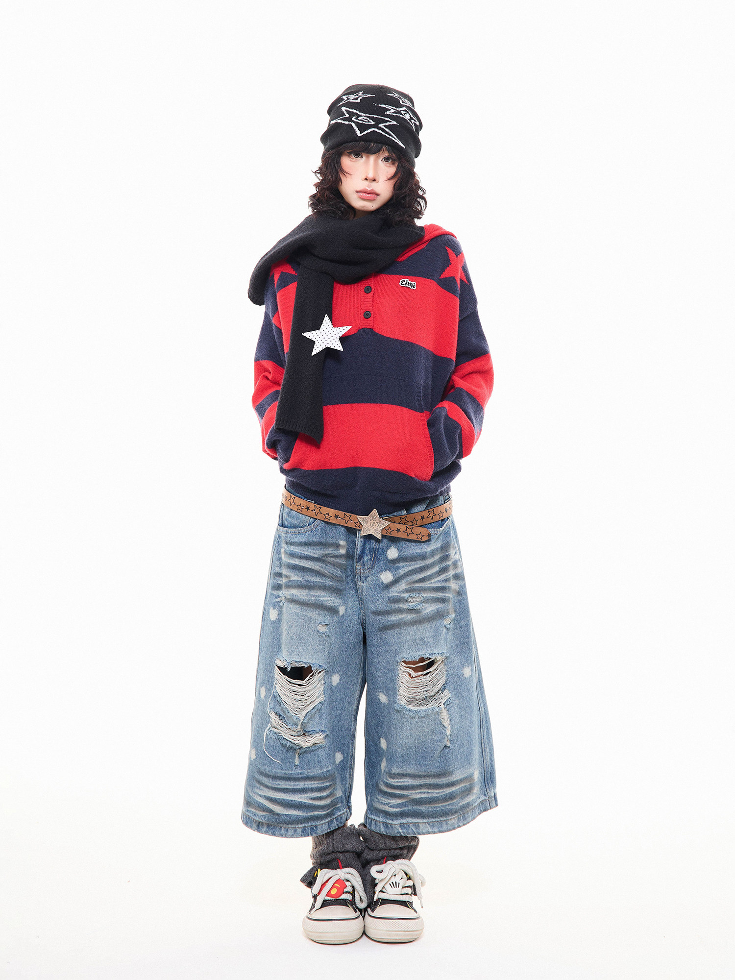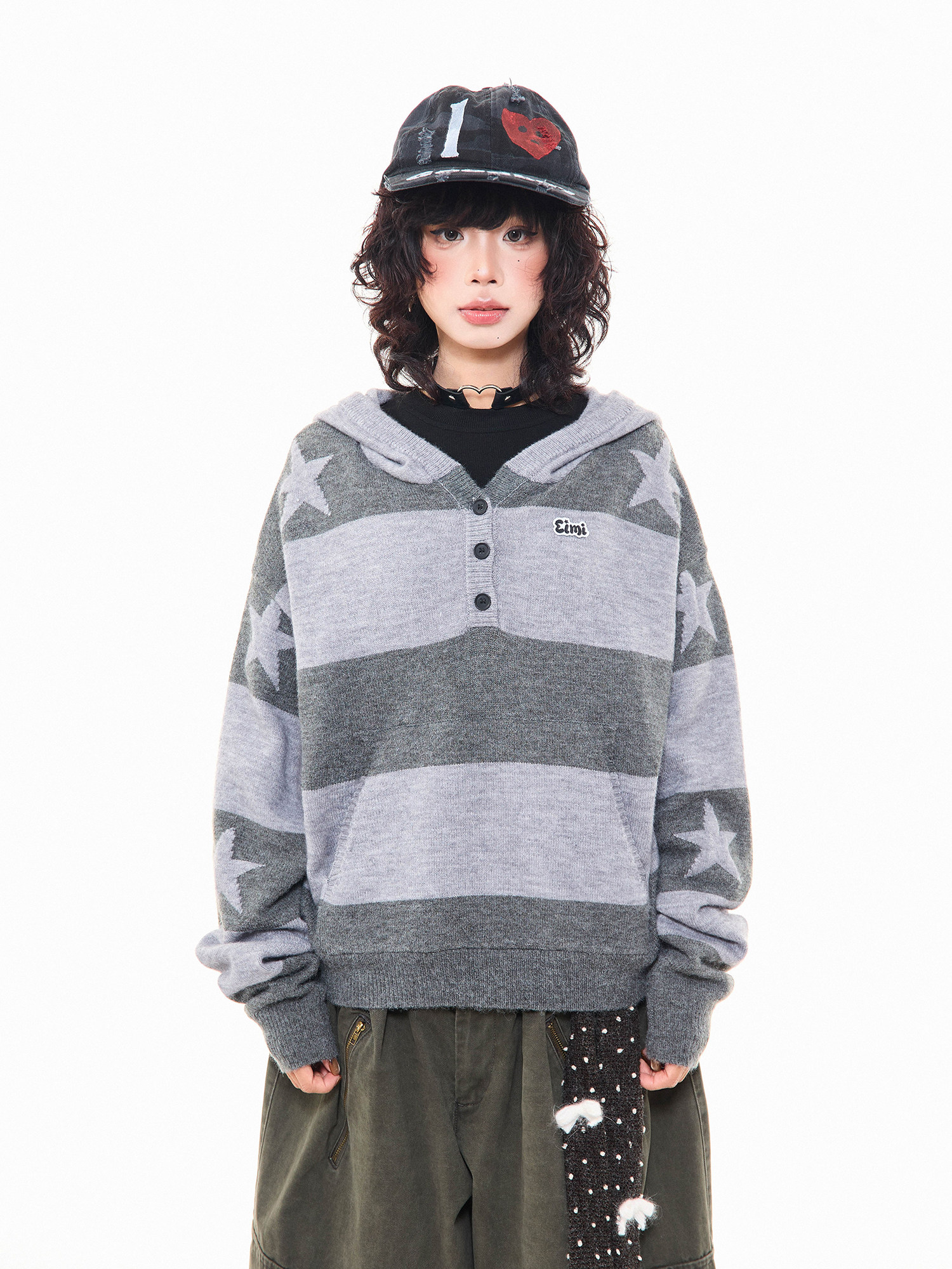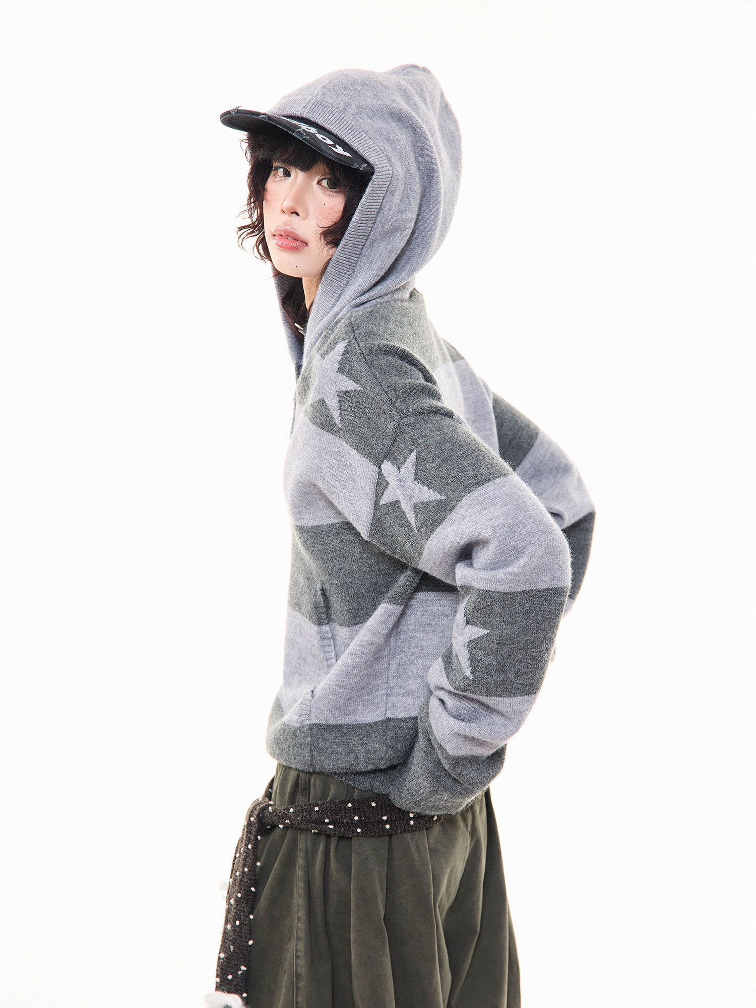 MKGO美式復古星星條紋連帽毛衣女秋季寬鬆撞色短款套頭針織衫上衣