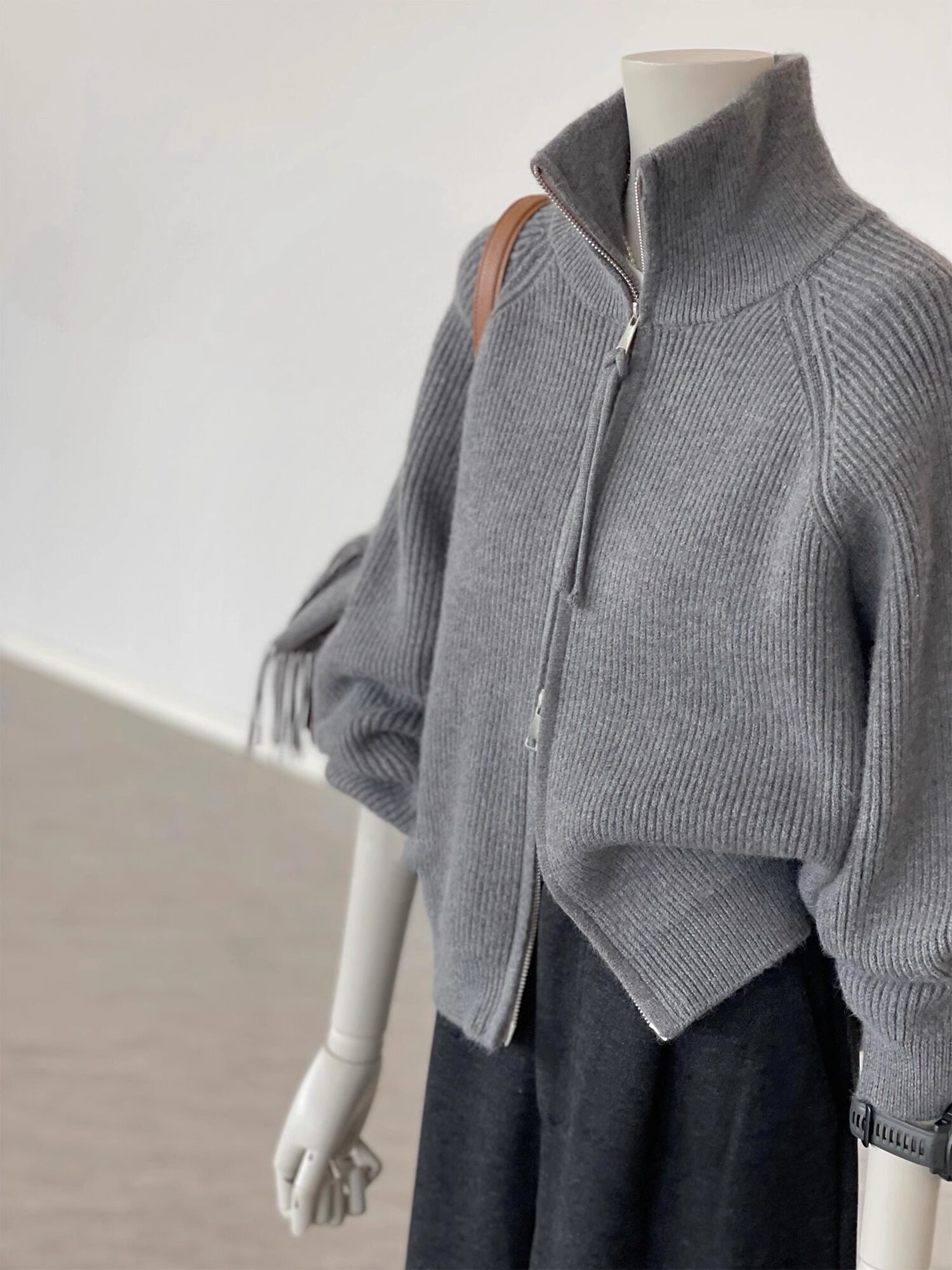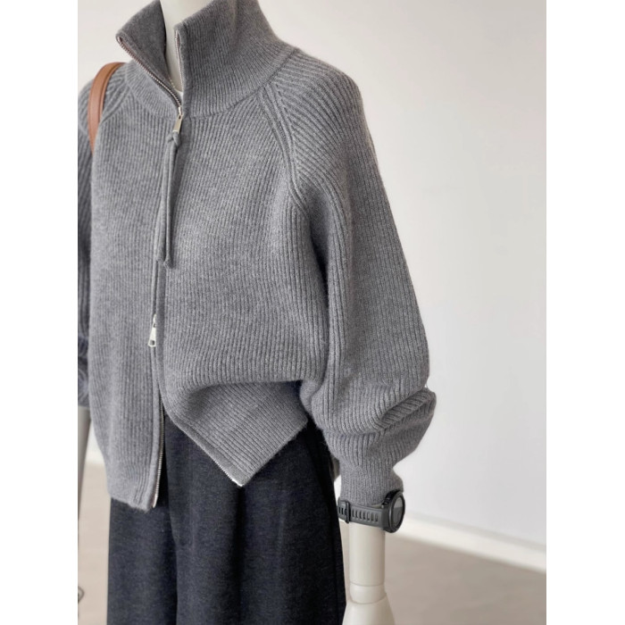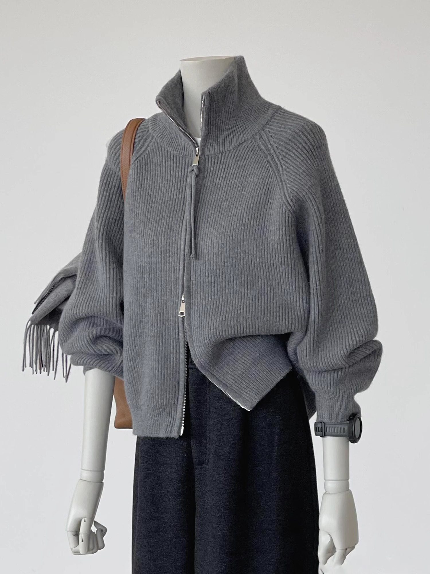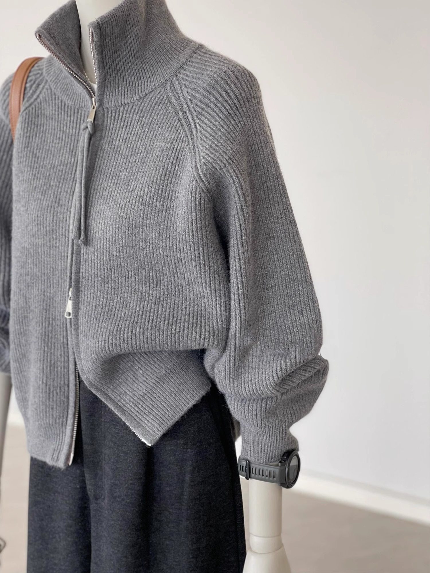 雙拉鍊高領加厚針織上衣外套女2025秋季寬鬆設計感插肩袖毛衣開衫