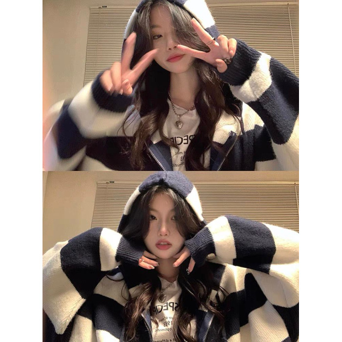 高品質!慵懶風連帽拉鍊毛衣開衫女外套秋裝寬松加厚條紋長袖針織