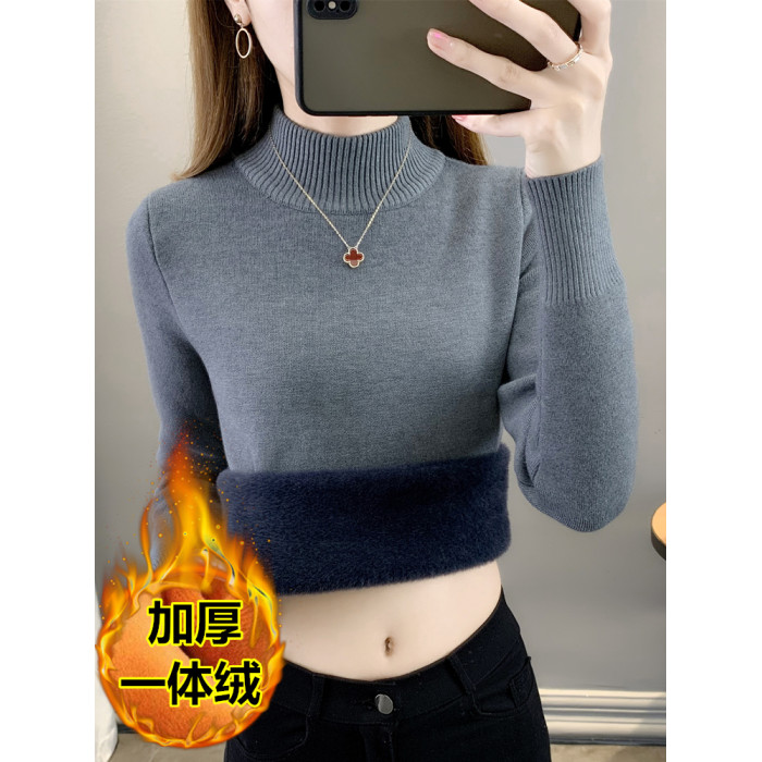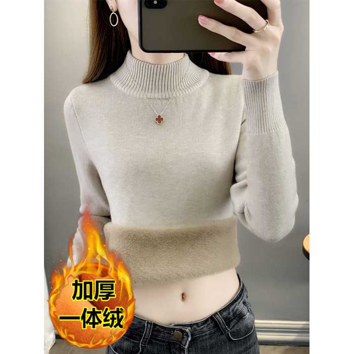秋冬加絨毛衣女加厚一體絨內搭大碼半高領套頭打底針織衫保暖上衣