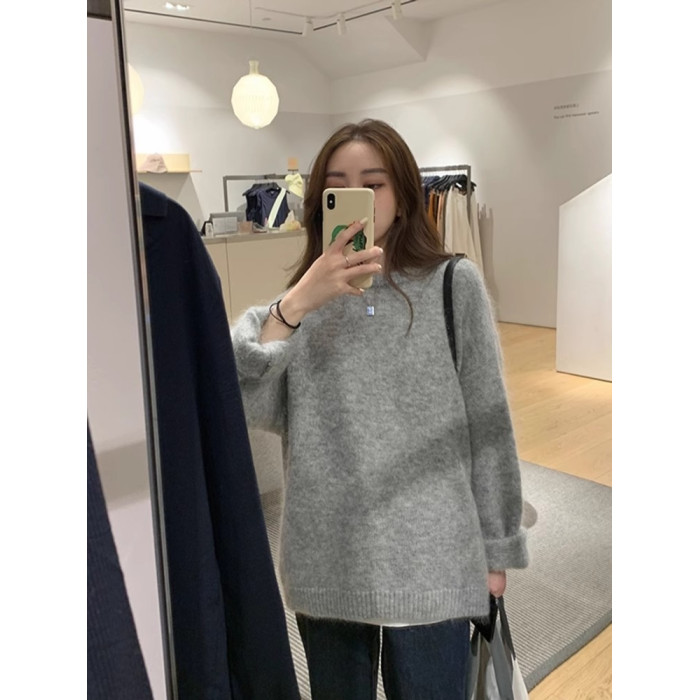 粉色馬海毛毛衣女秋冬內搭小個子軟糯慵懶風寬松套頭針織打底衫
