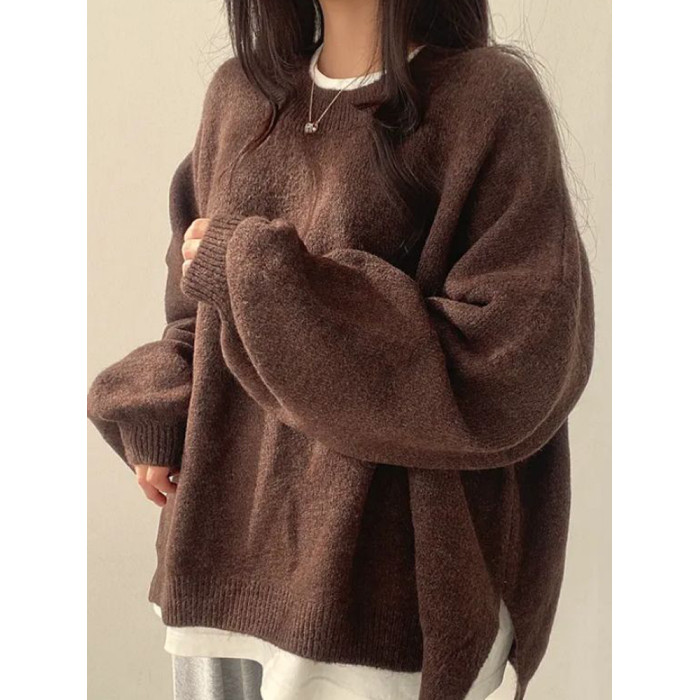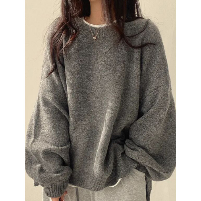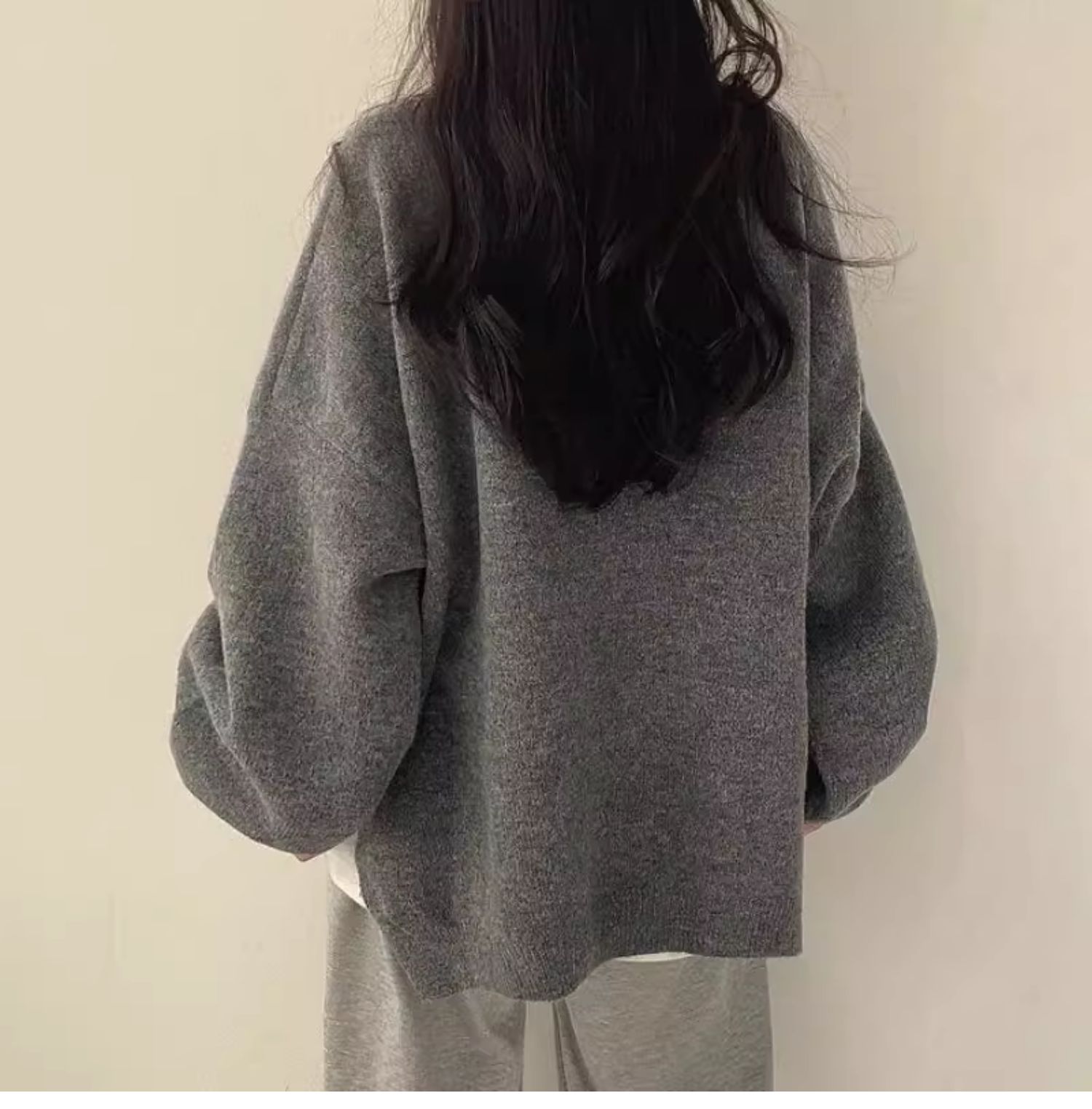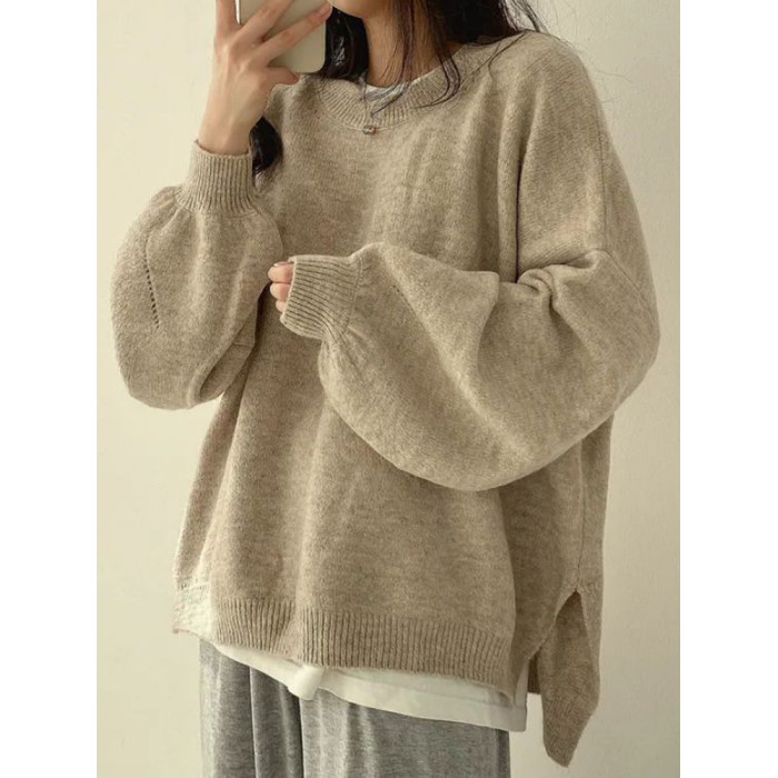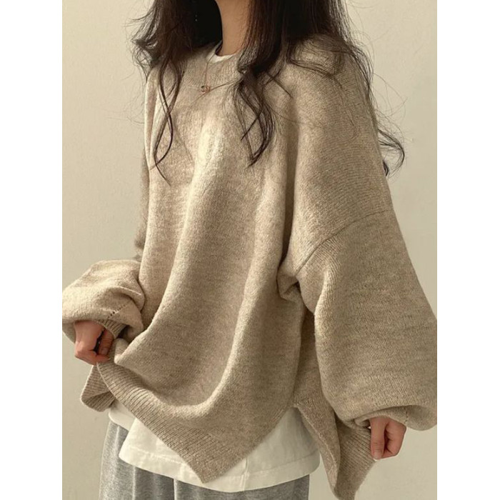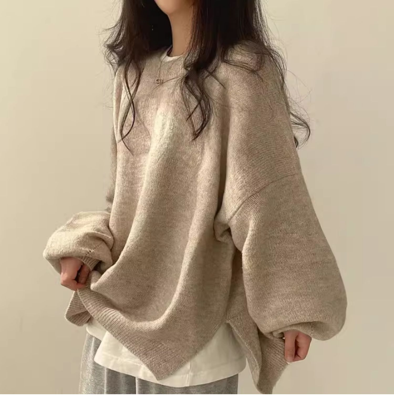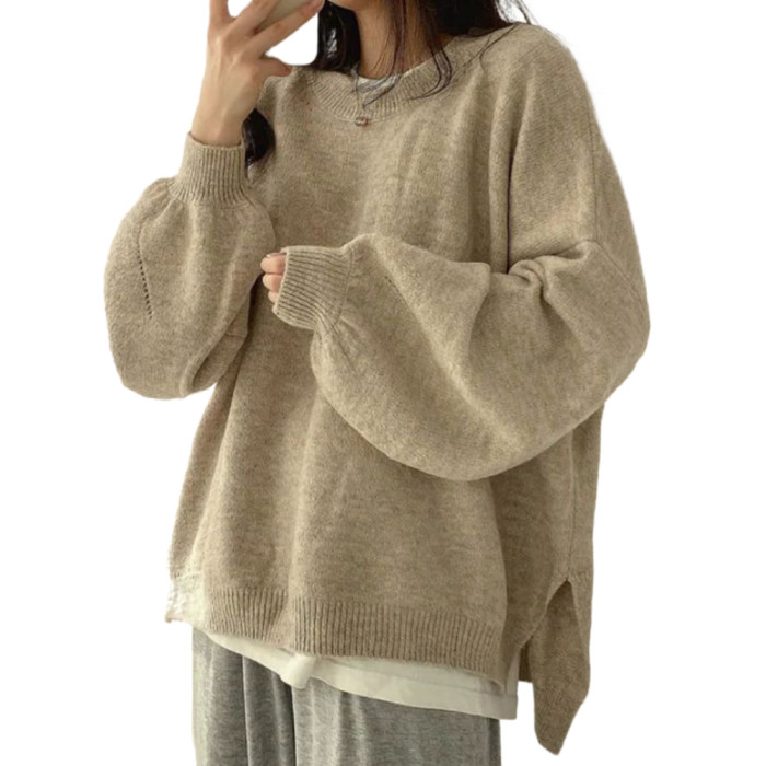 韓系寬松圓領套頭毛衣女秋冬大碼胖mm慵懶風設計感開叉針織衫上衣
