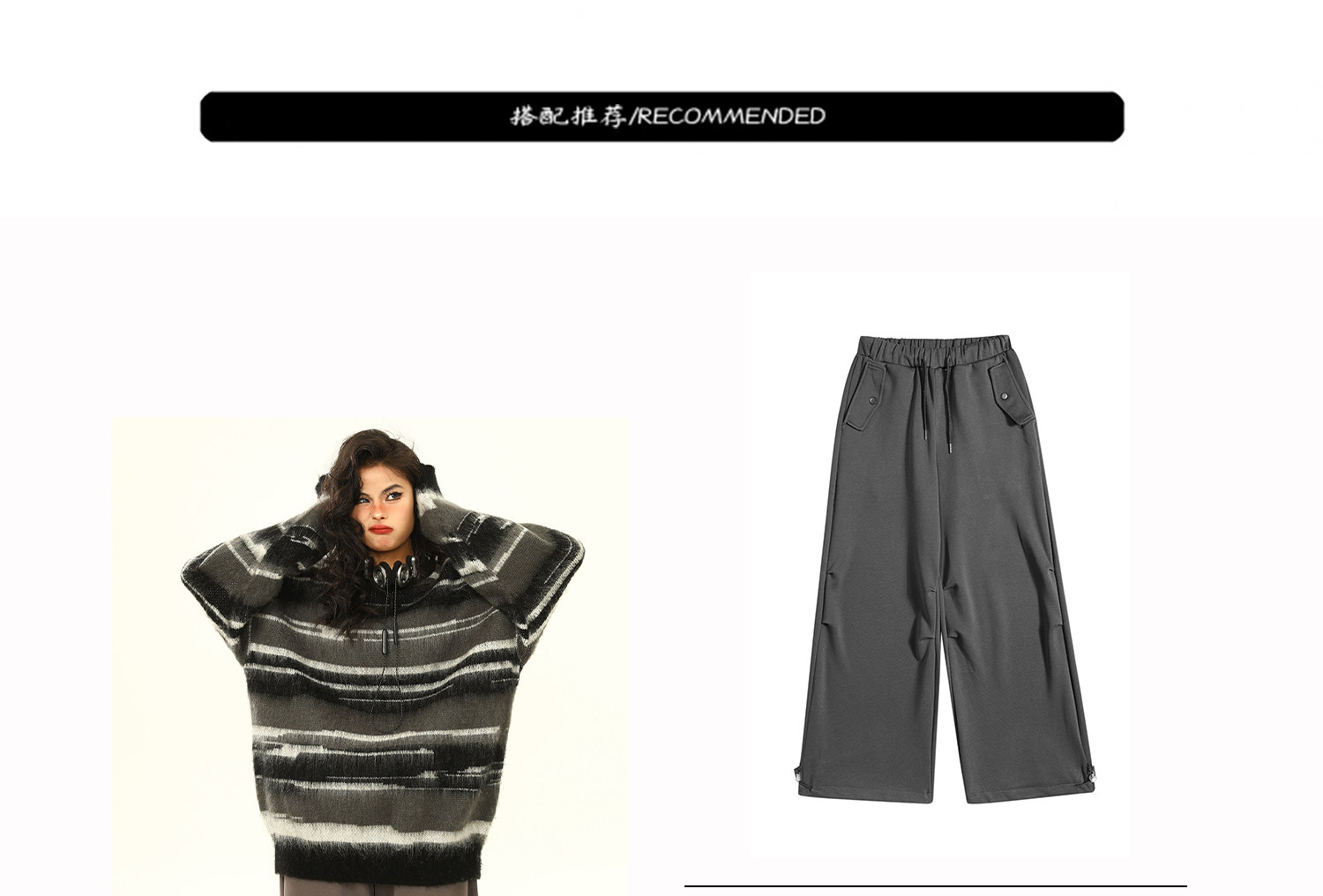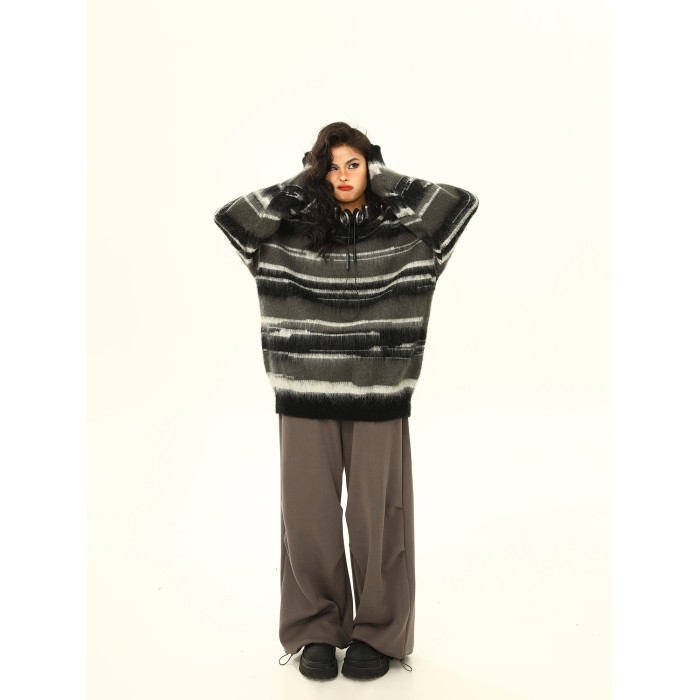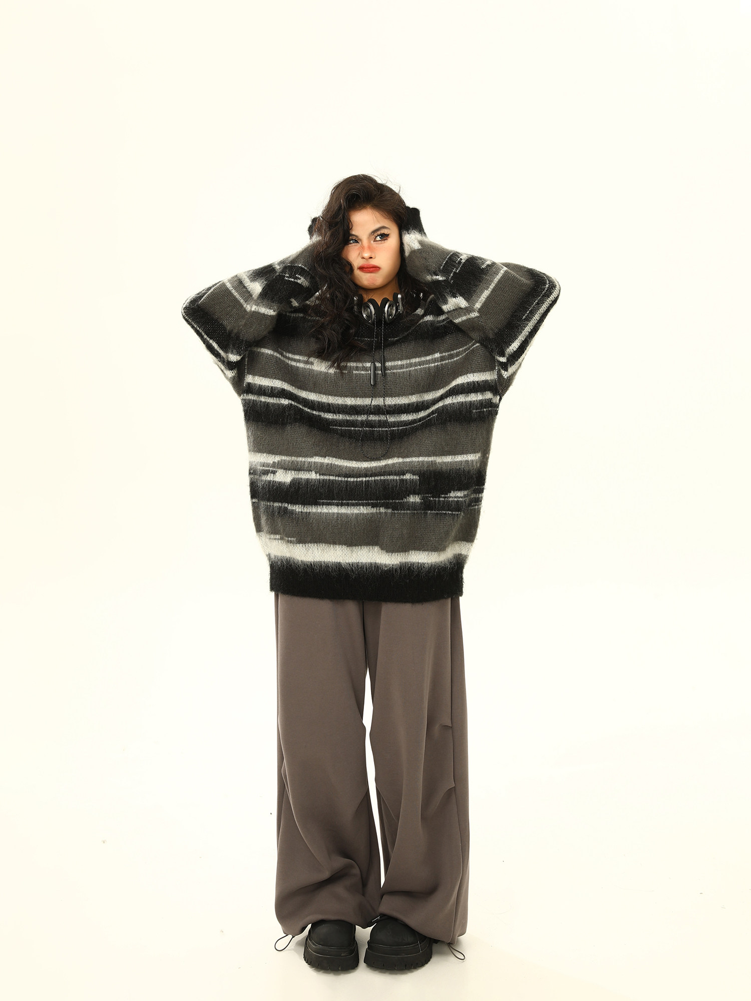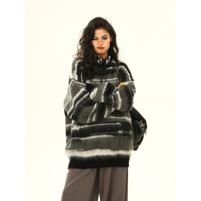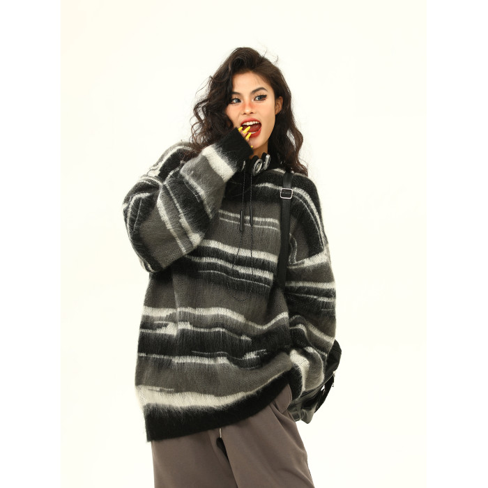 野生阿子美式復古馬海毛條紋毛衣女春秋慵嬾氛圍感情侶針織衫上衣