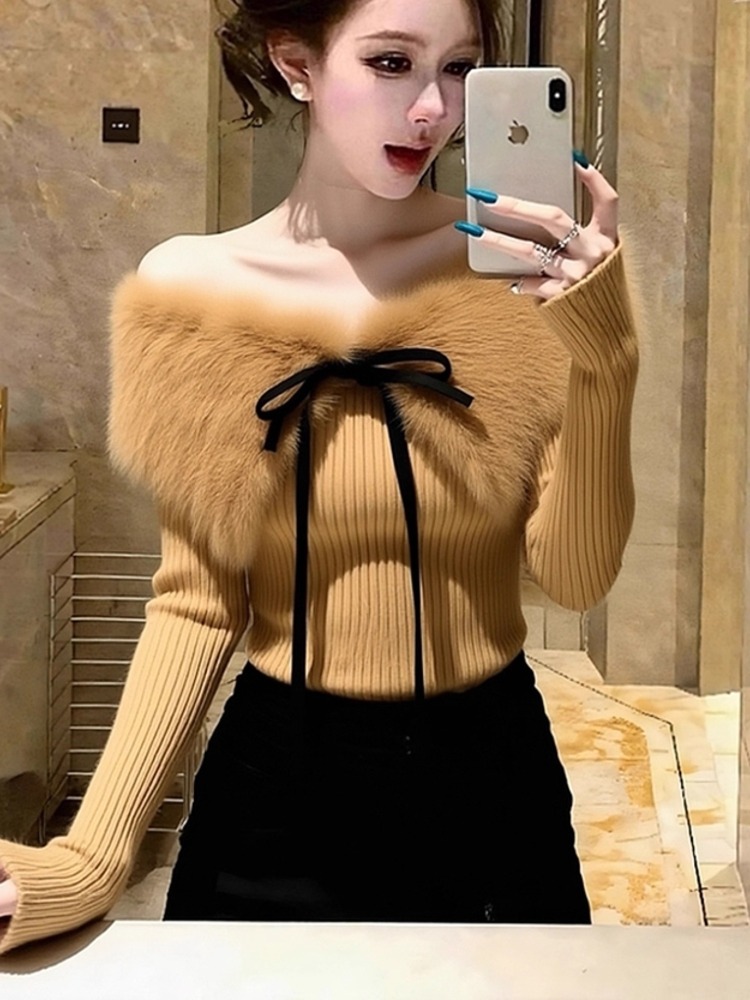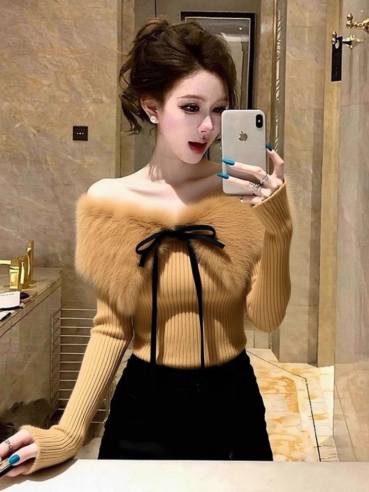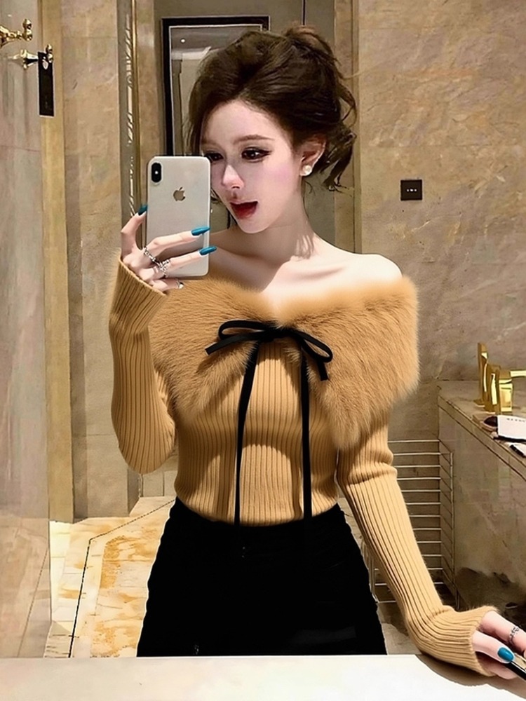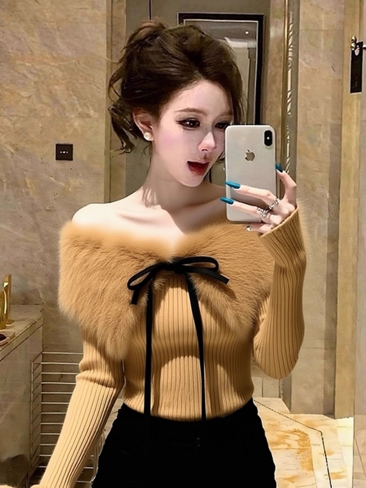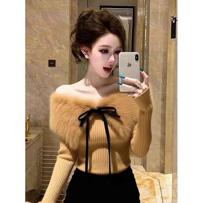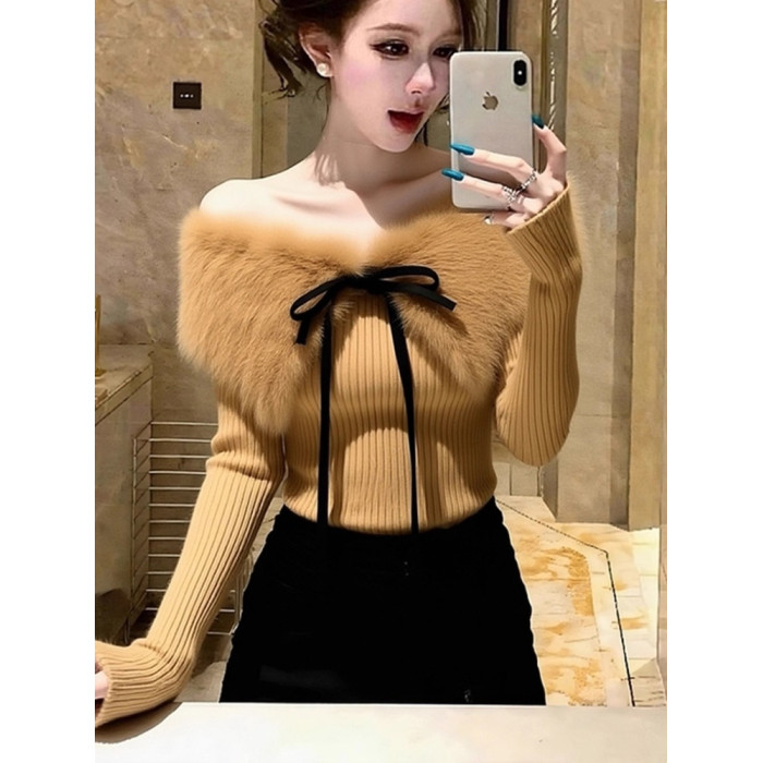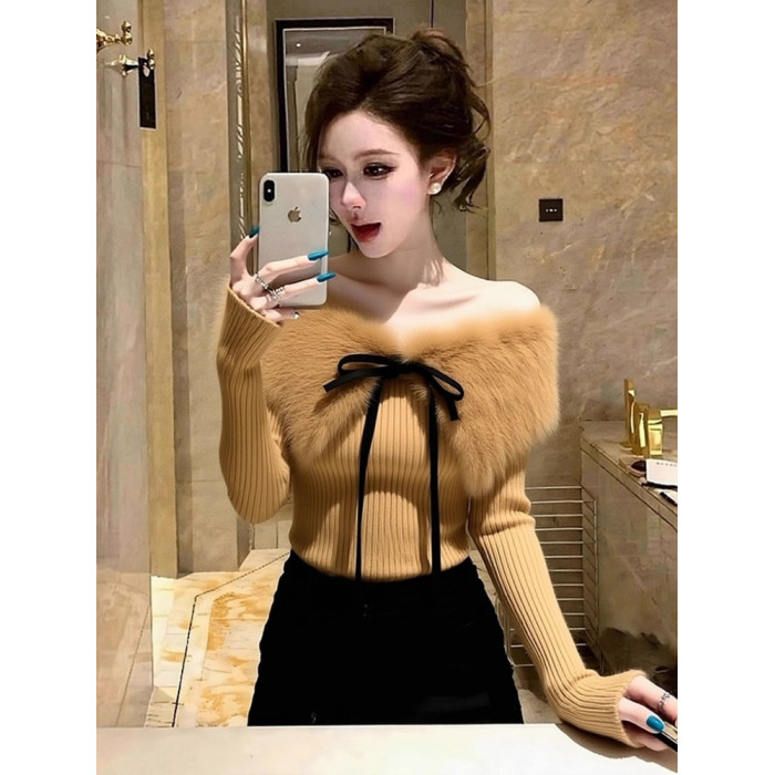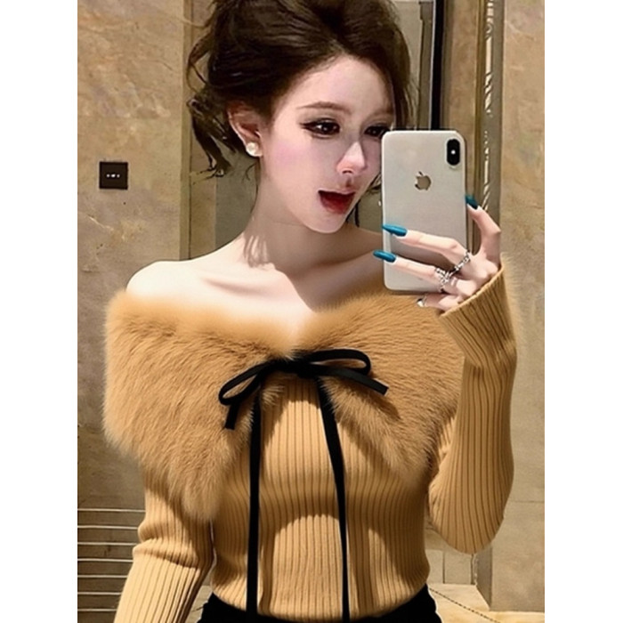 純欲甜辣妹修身短款毛領拼接毛衣針織打底衫女內搭秋冬一字肩上衣