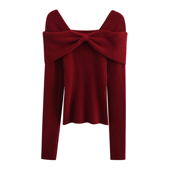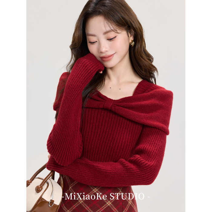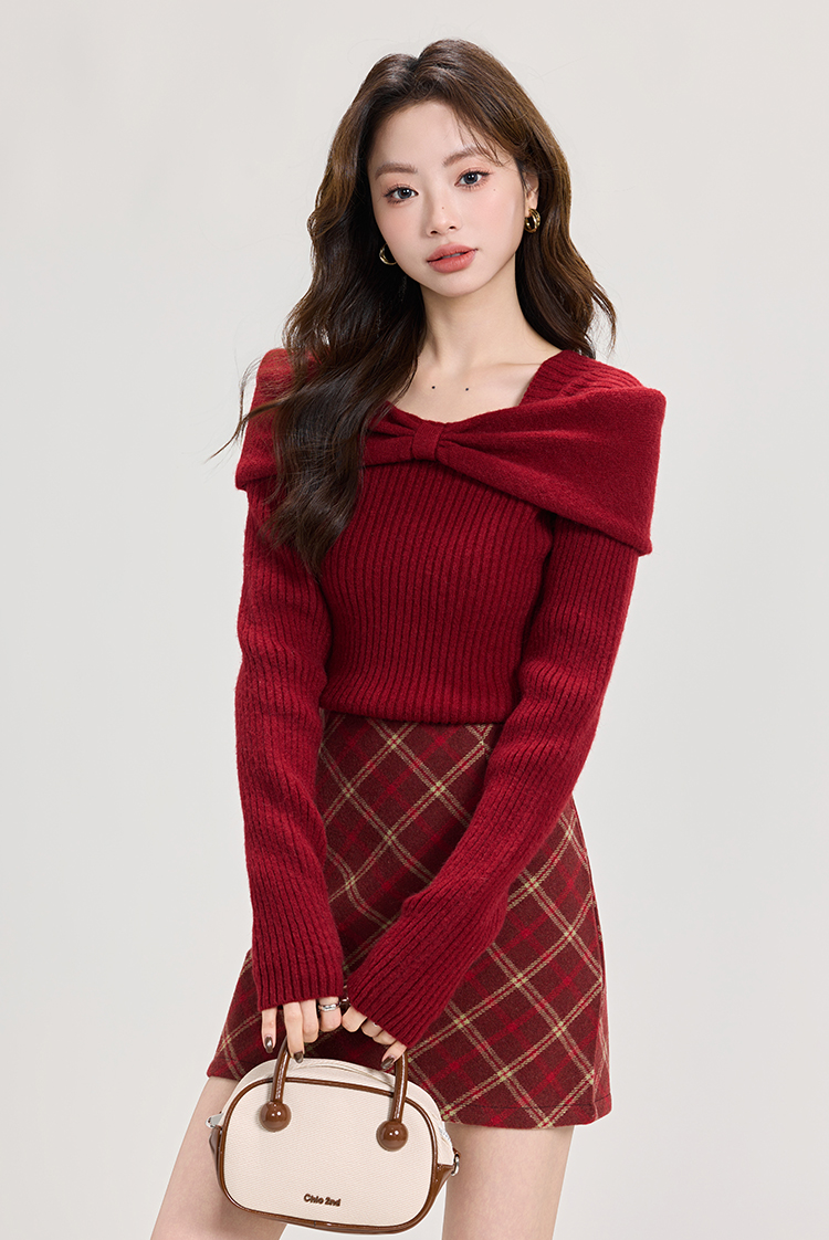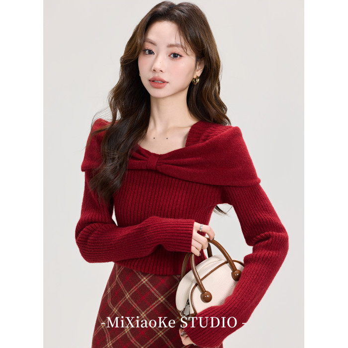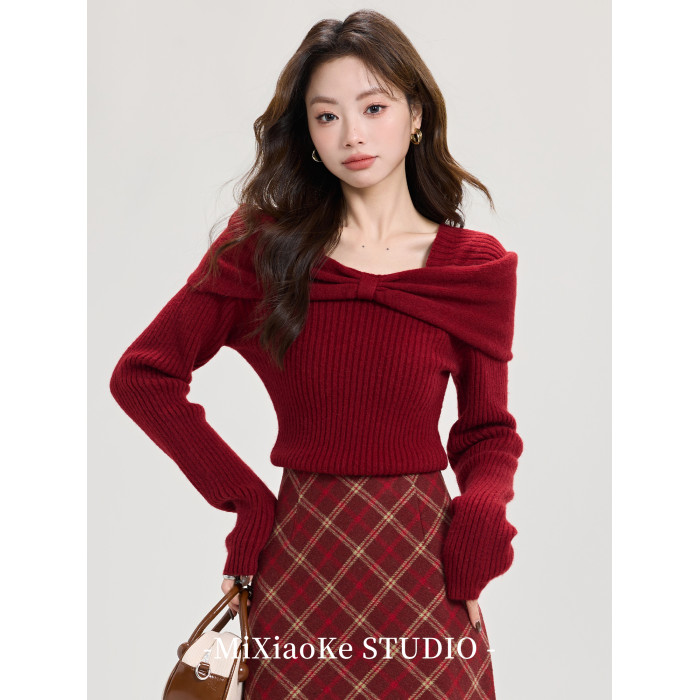 羋小可聖誕穿搭紅色本命年內搭毛衣女秋冬一字肩毛針織衫打底上衣