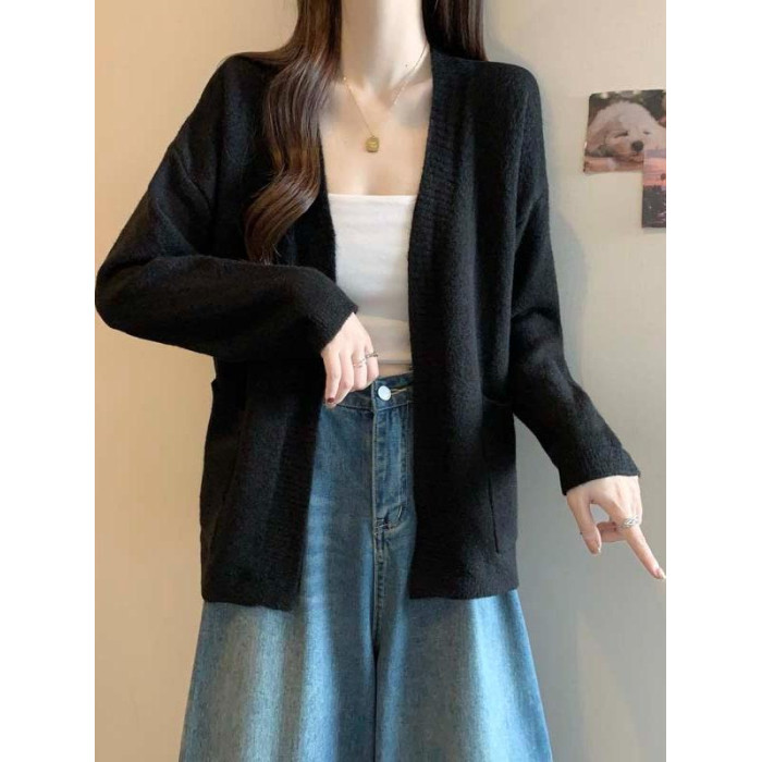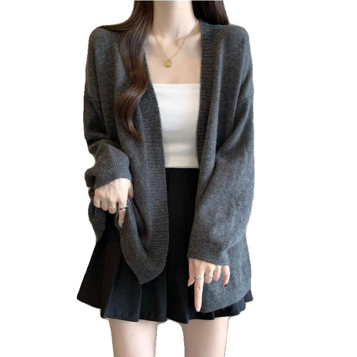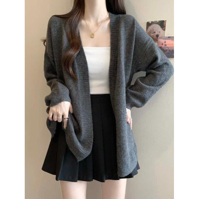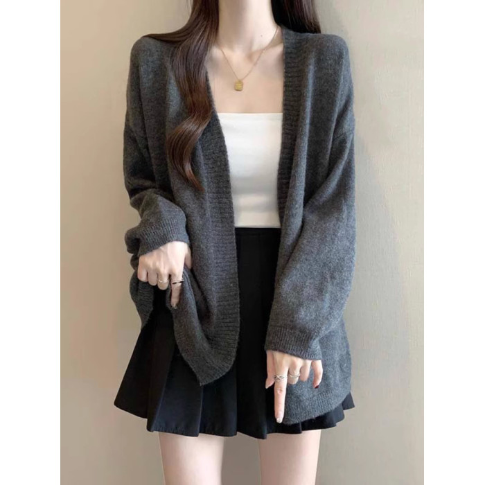 慵懶風灰色正肩針織開衫毛衣外套女2025早秋季大碼胖mm中長款上衣