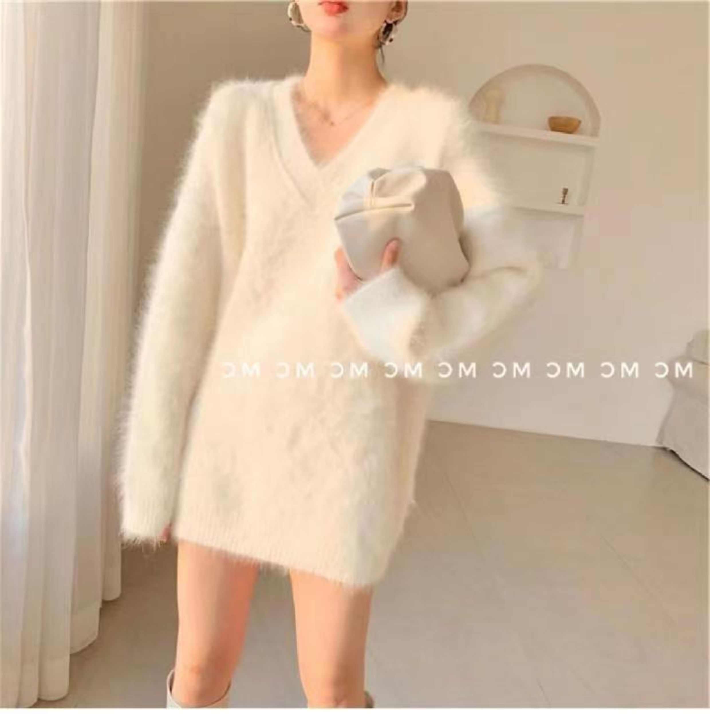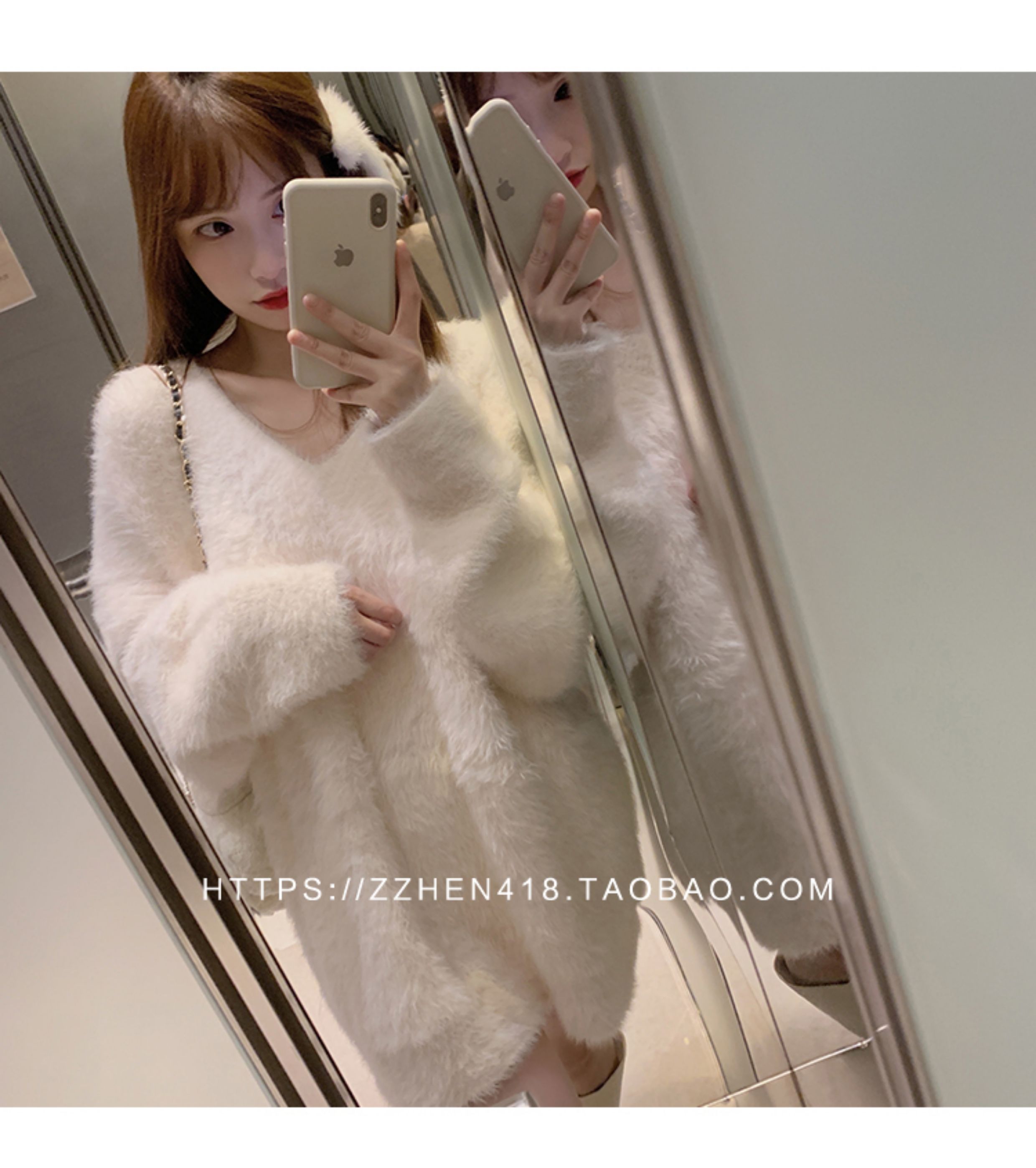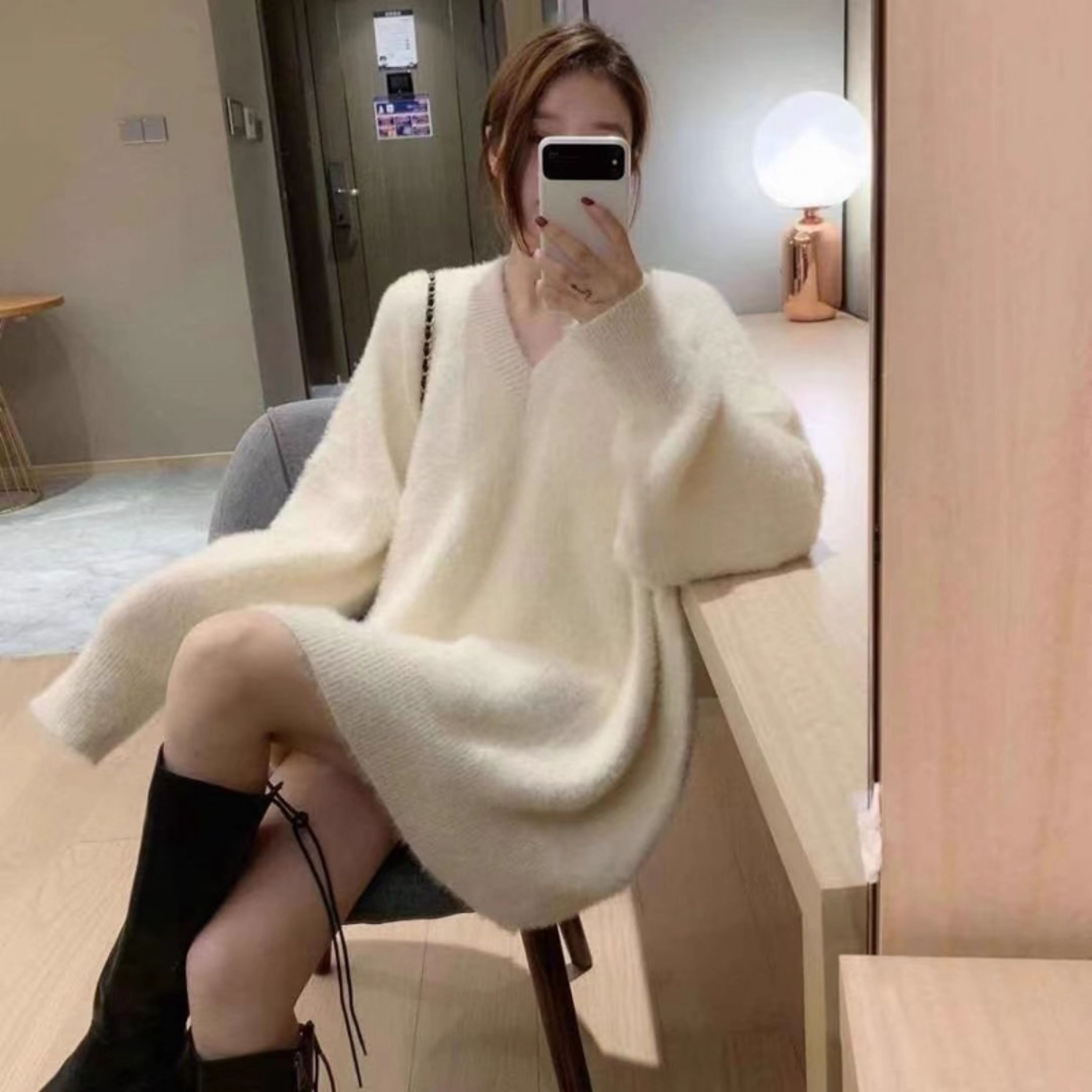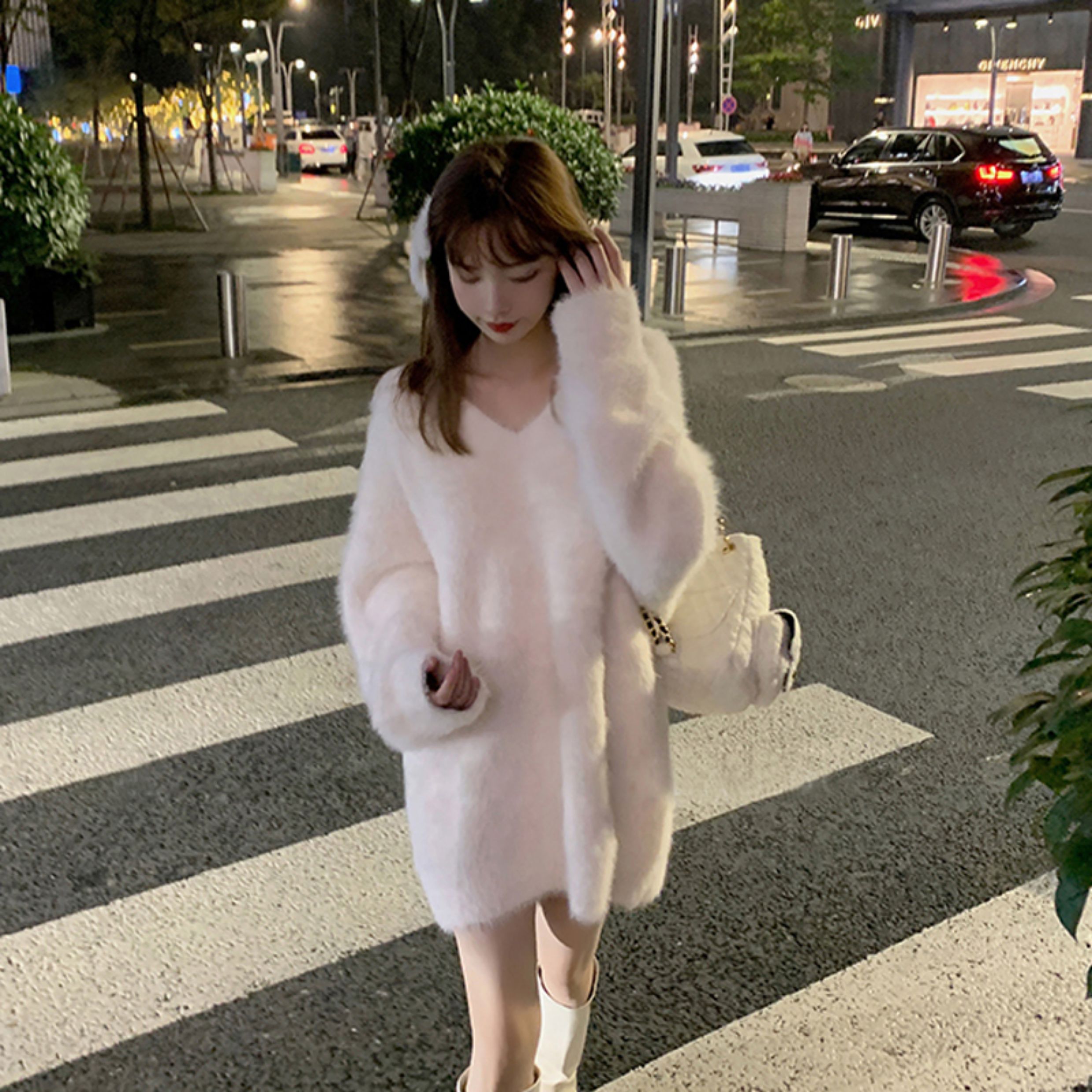 慵懶風毛衣女中長款秋冬外穿白色水貂絨高級感內搭V領針織上衣潮