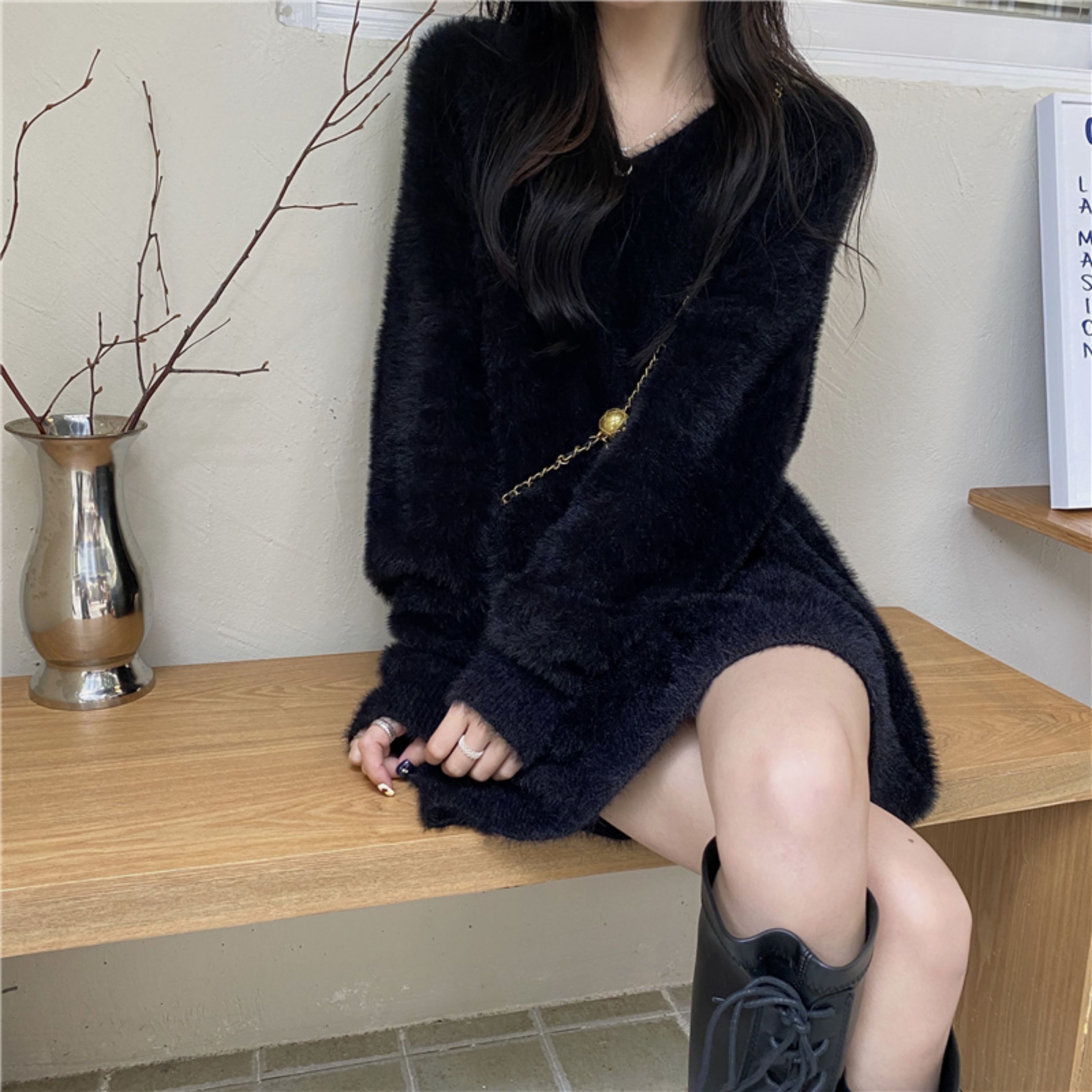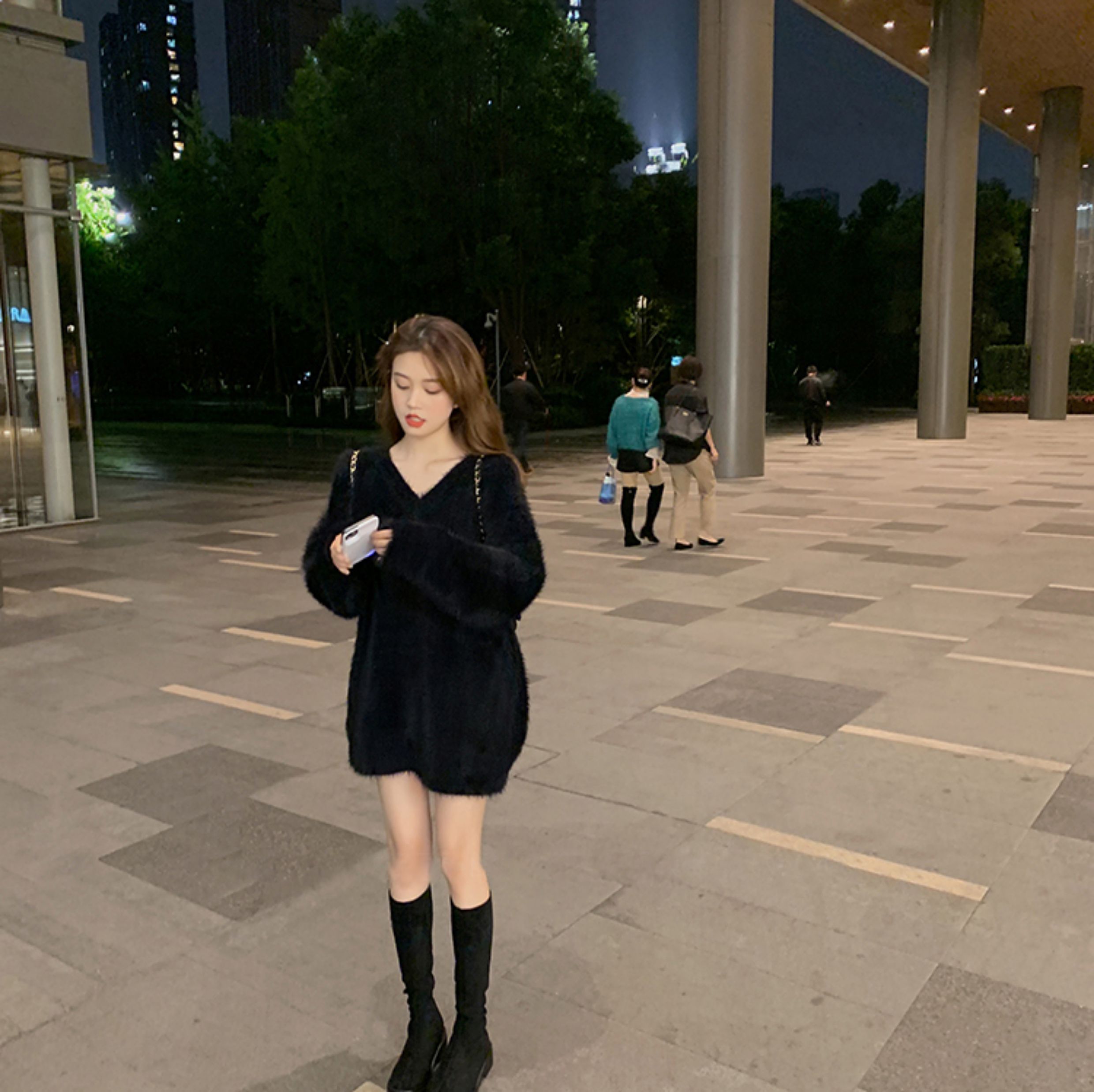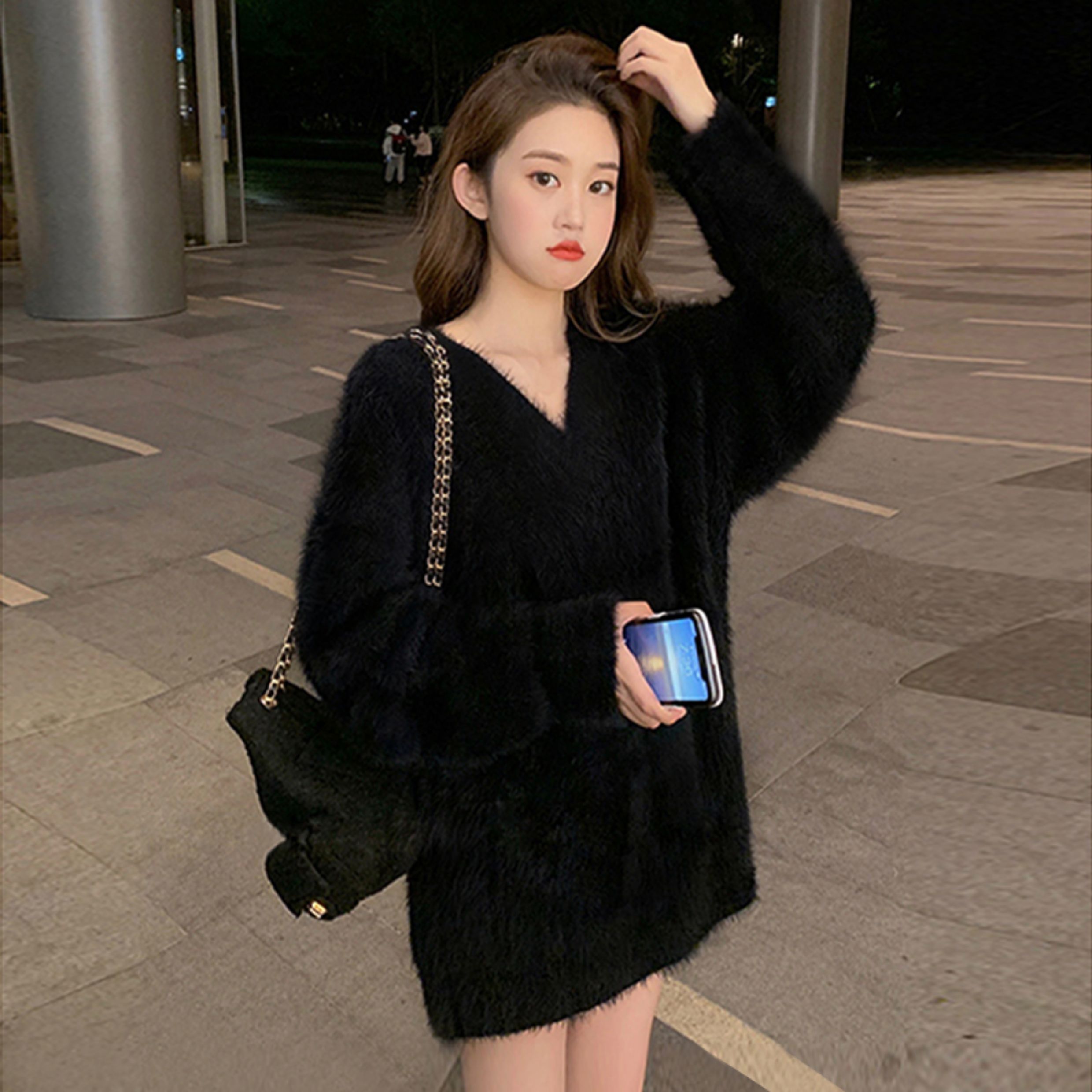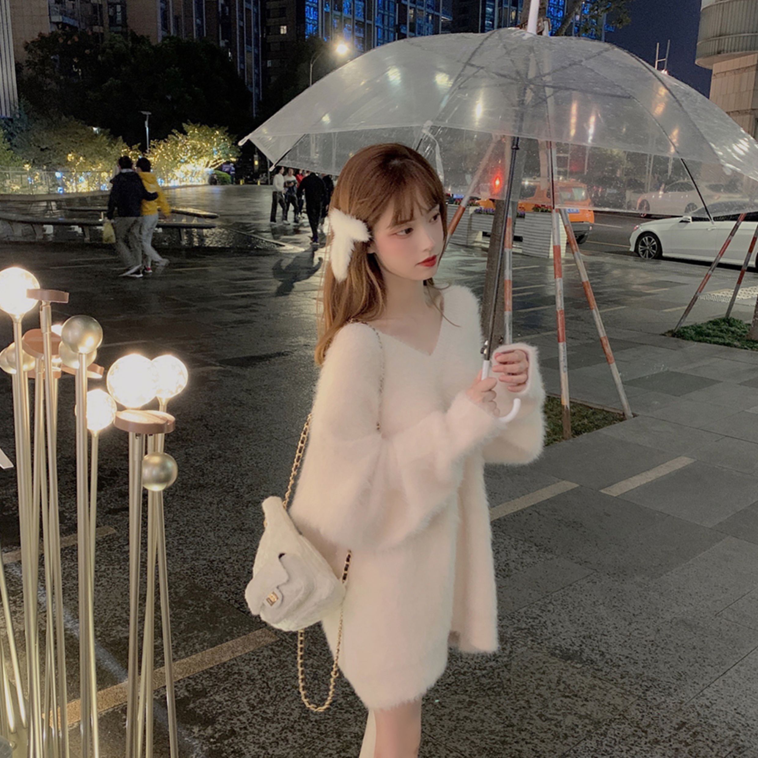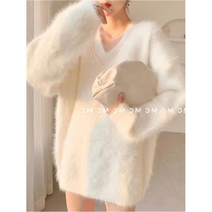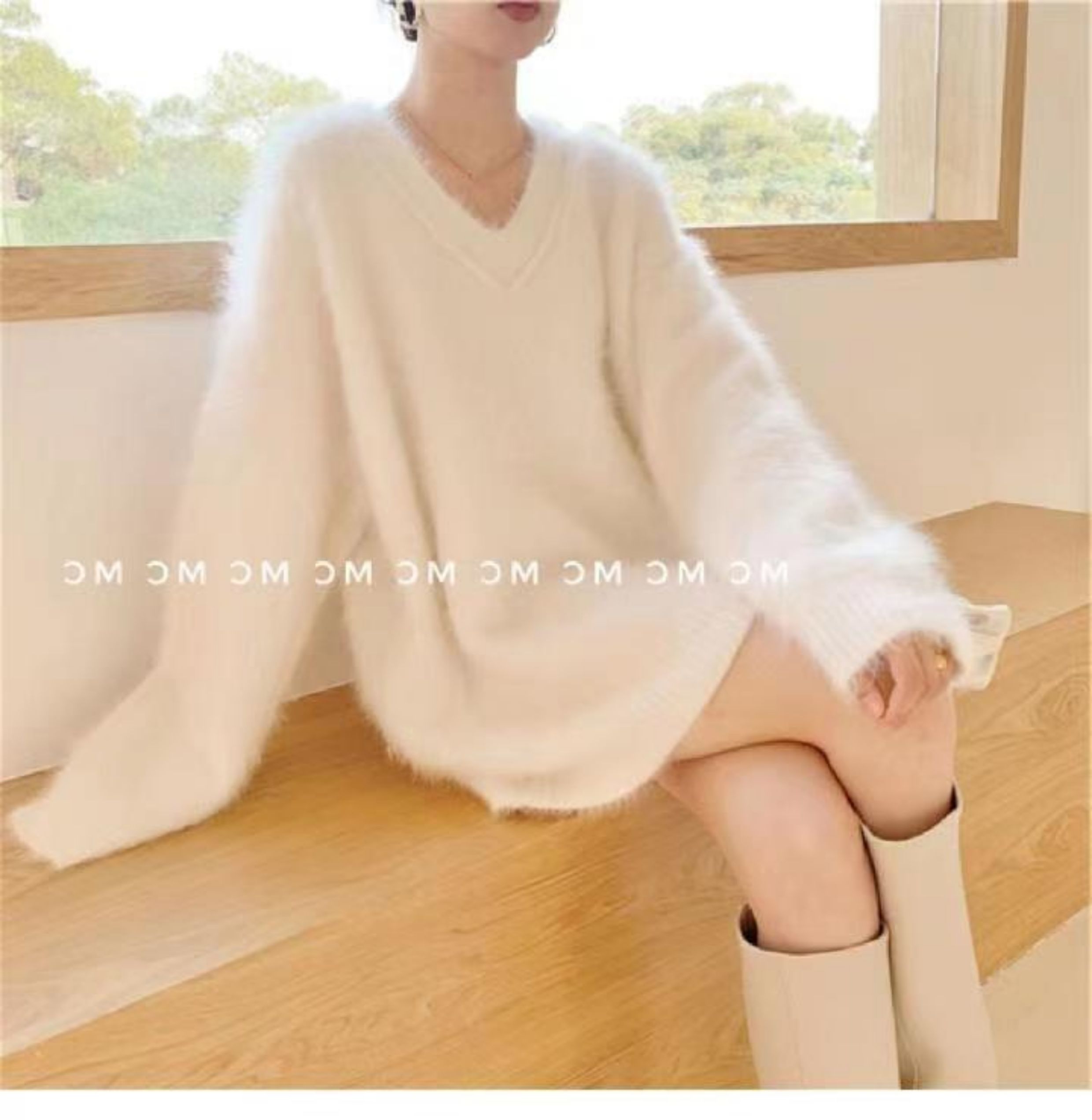慵懶風毛衣女中長款秋冬外穿白色水貂絨高級感內搭V領針織上衣潮