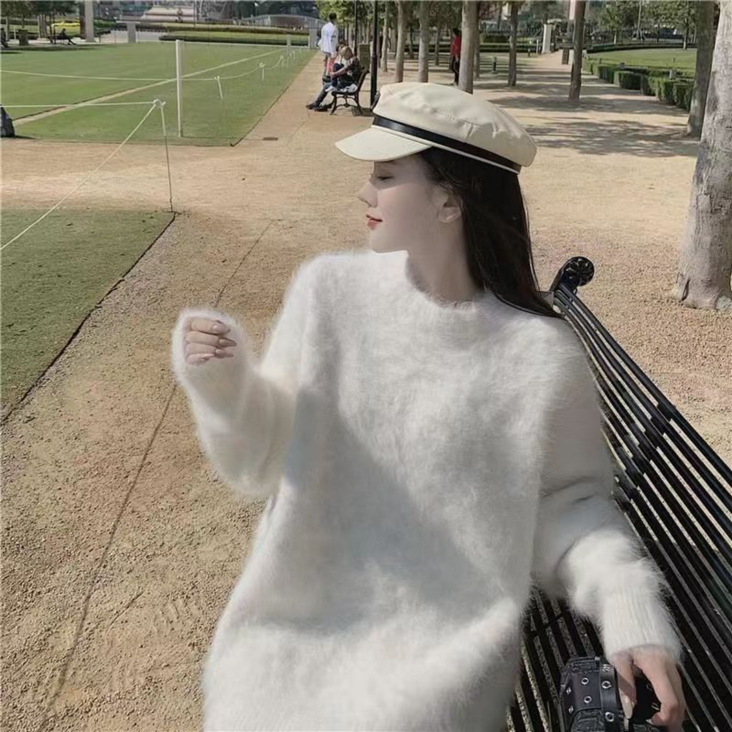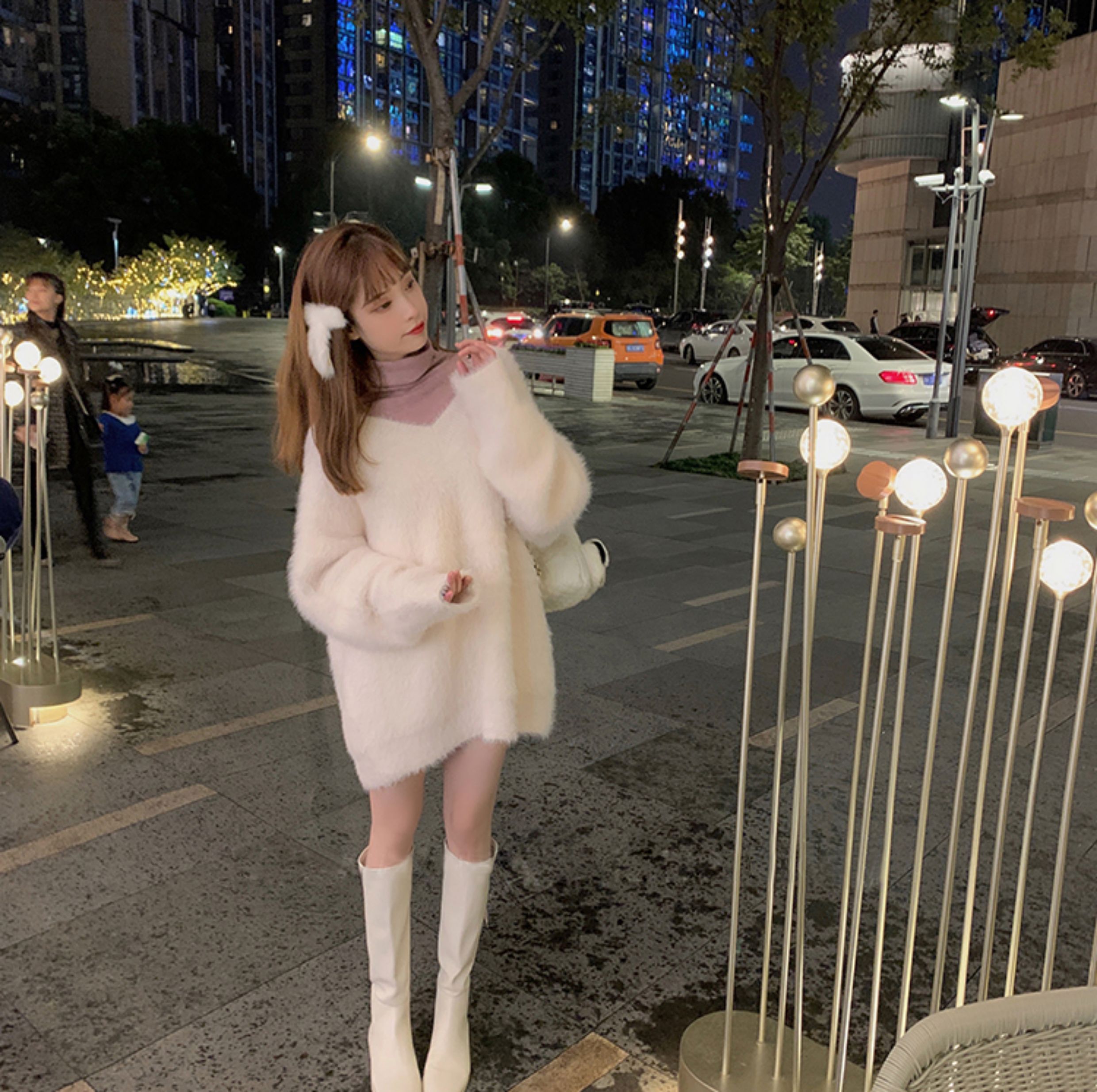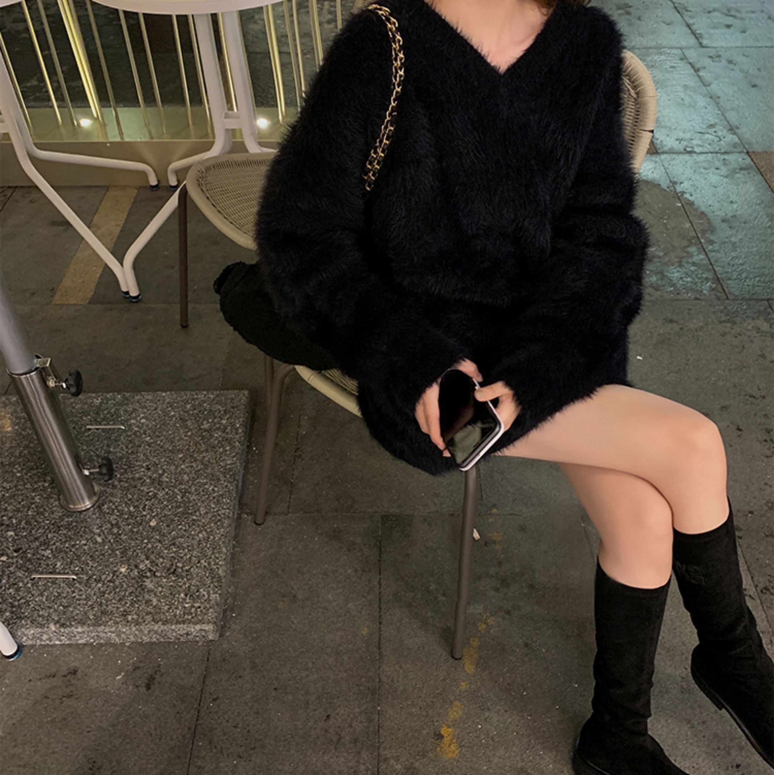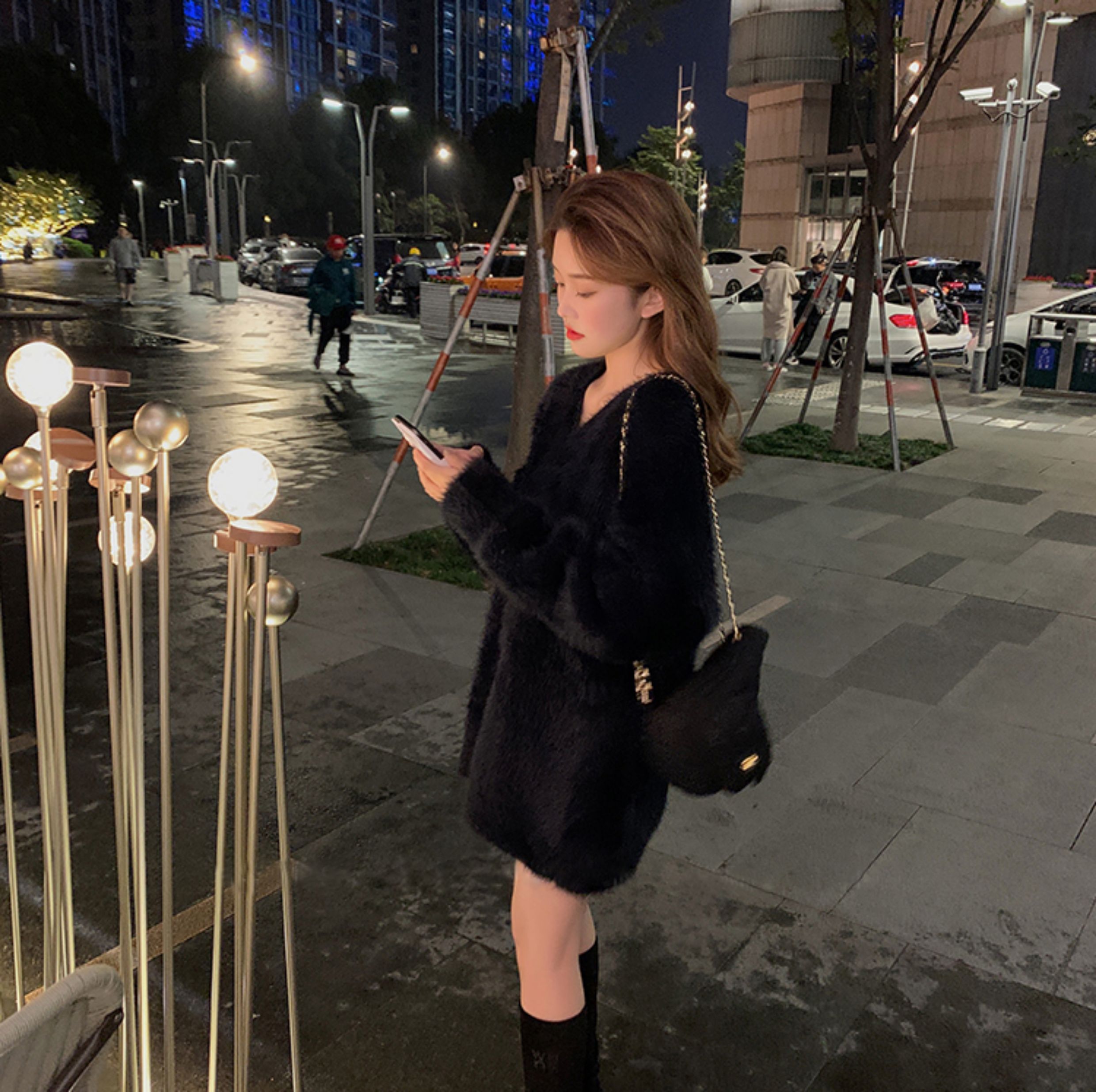 慵懶風毛衣女中長款秋冬外穿白色水貂絨高級感內搭V領針織上衣潮