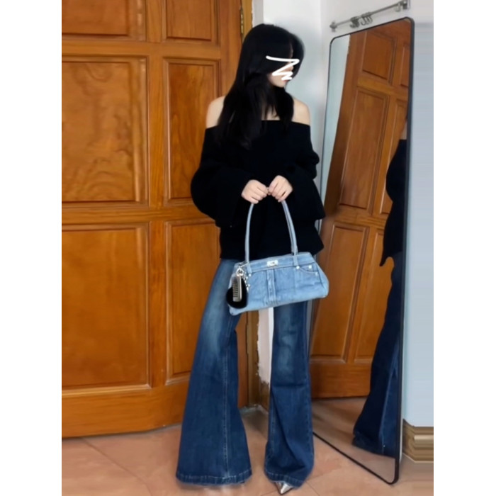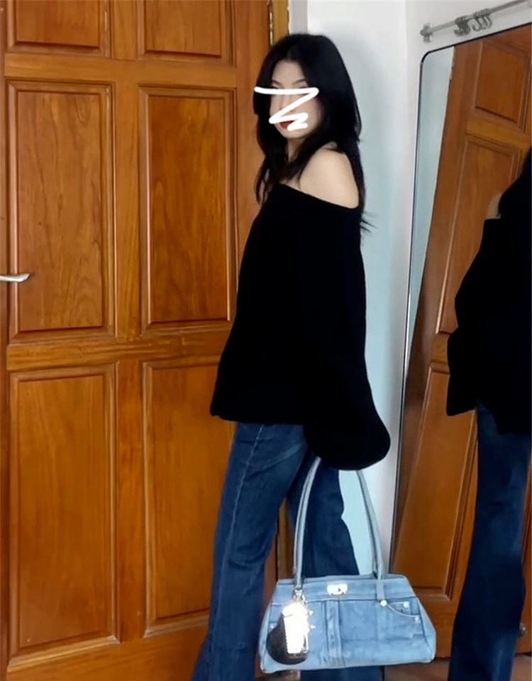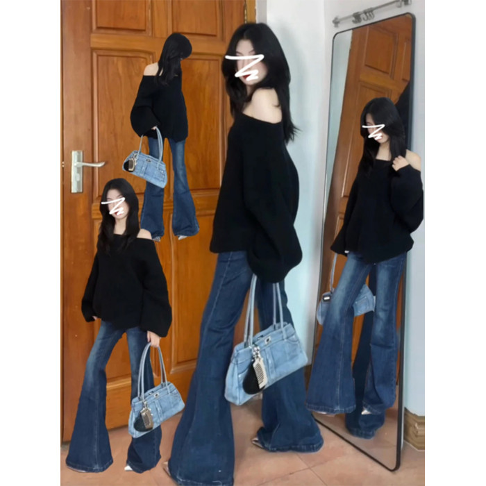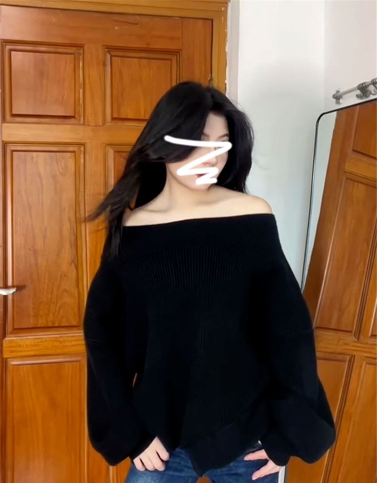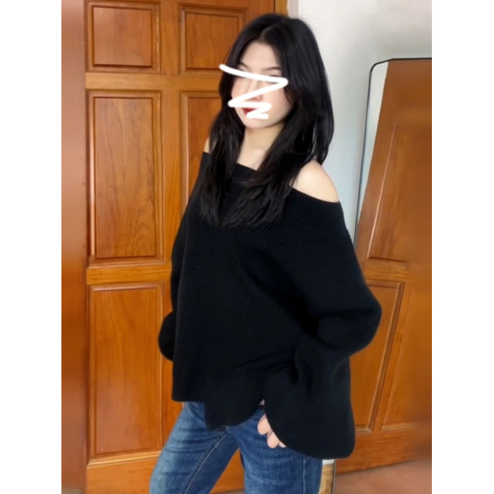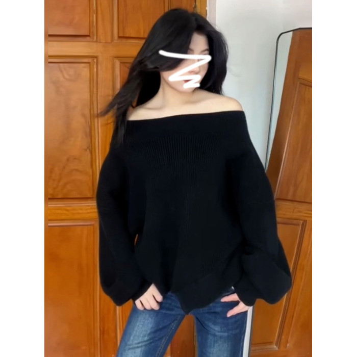 黑色韓系慵懶風毛衣女冬季新款高級感一字肩寬松百搭加厚針織上衣