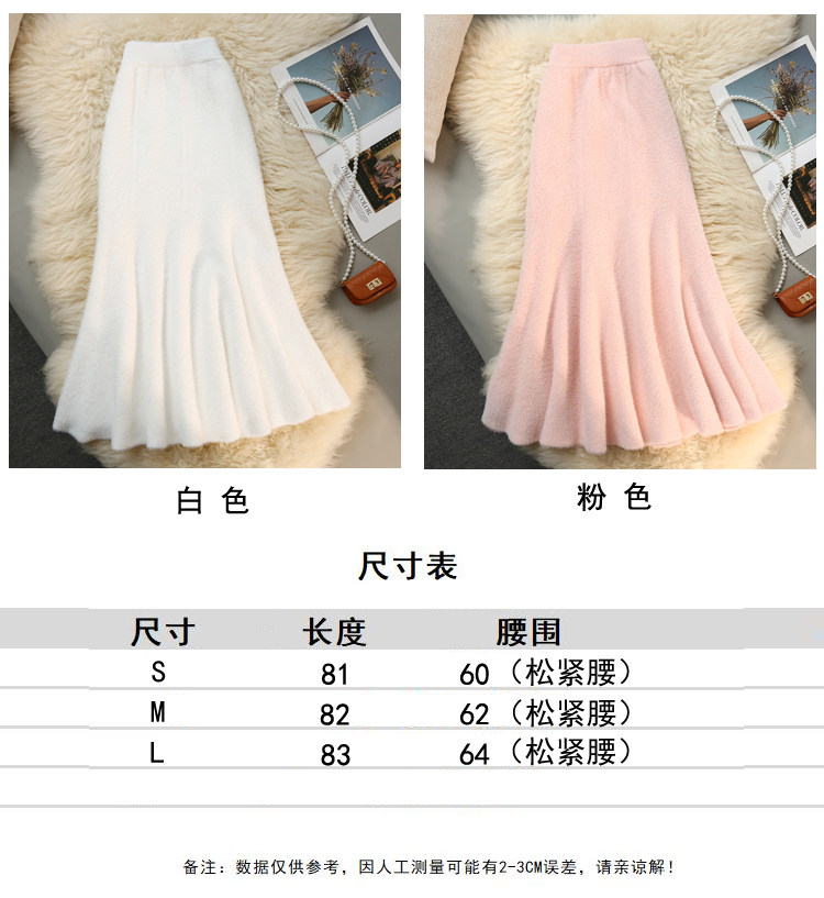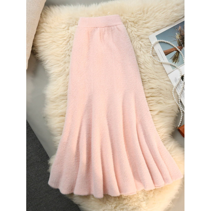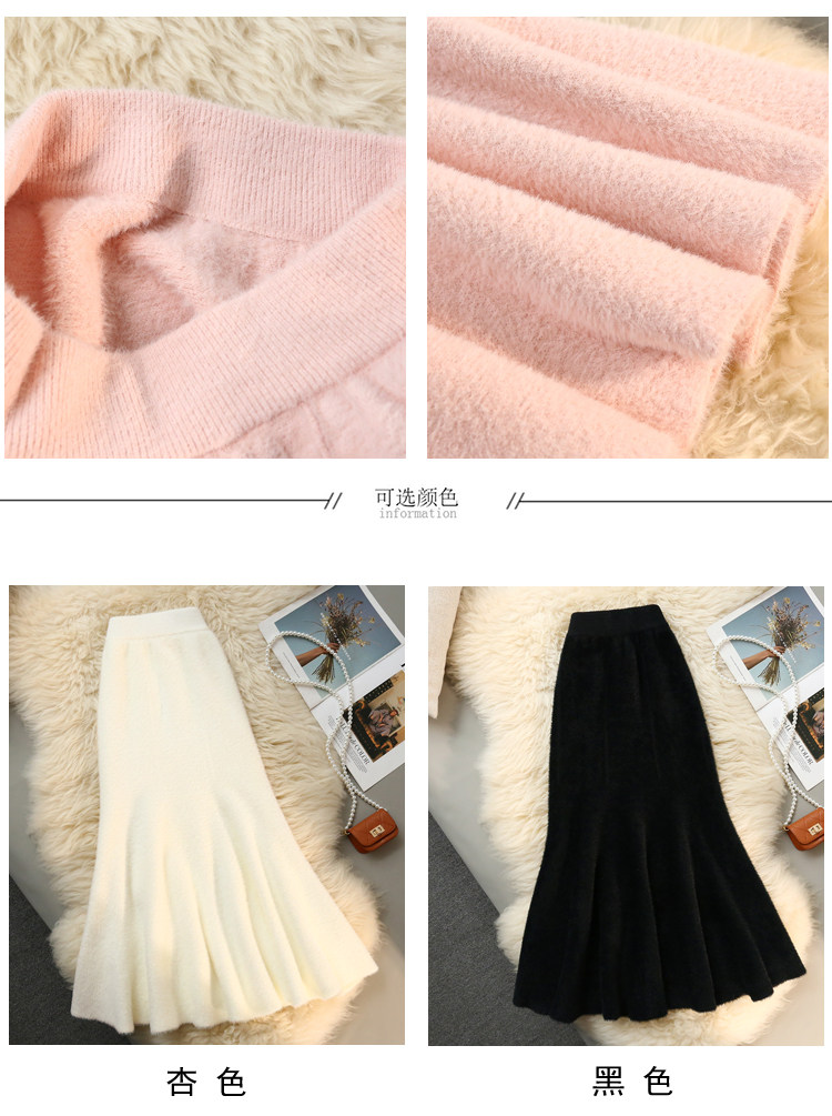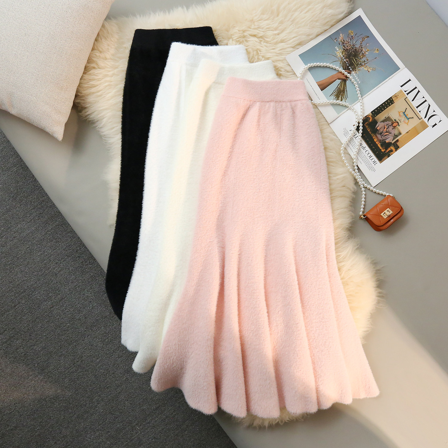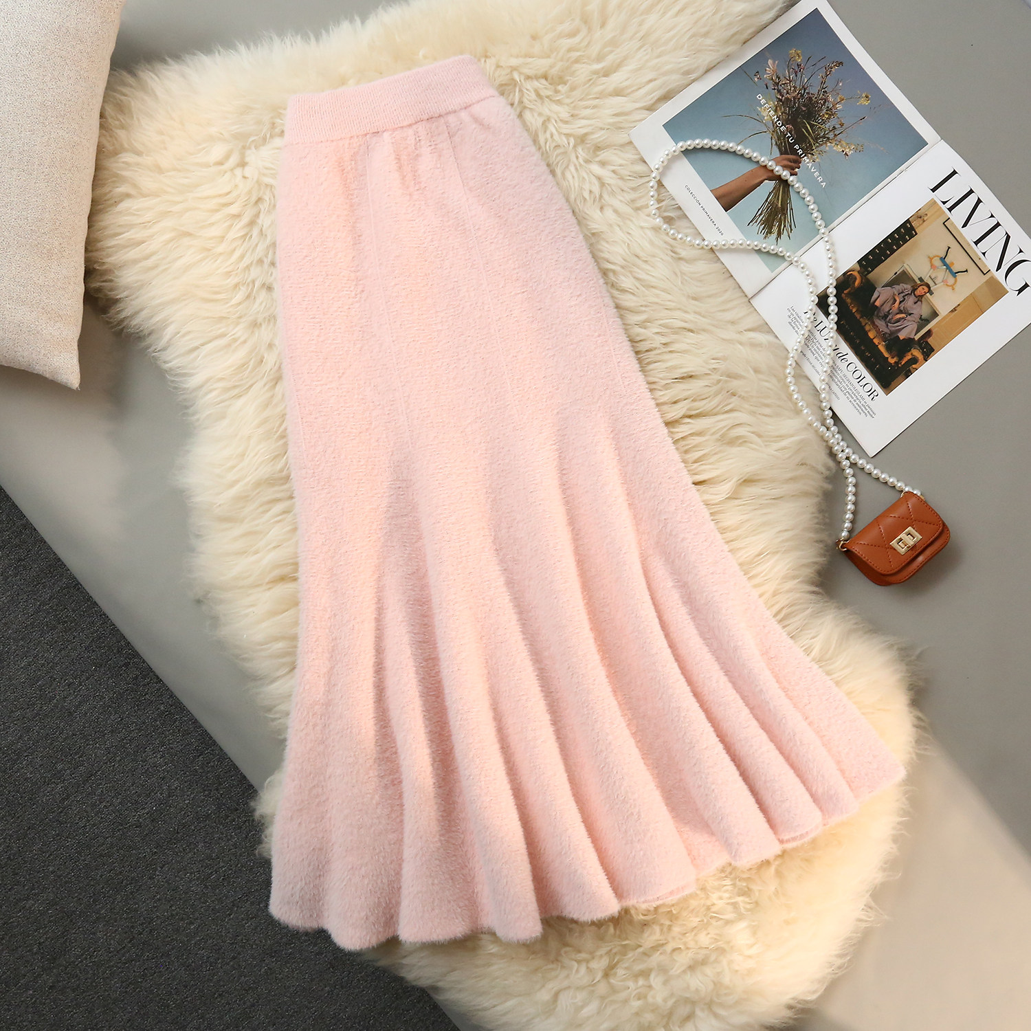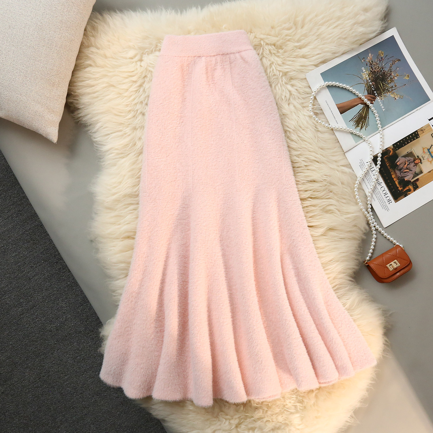軟糯水貂絨魚尾裙高級感女秋冬針織半身裙粉色嬭fufu毛線包臀長裙