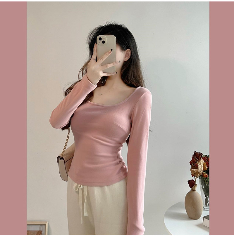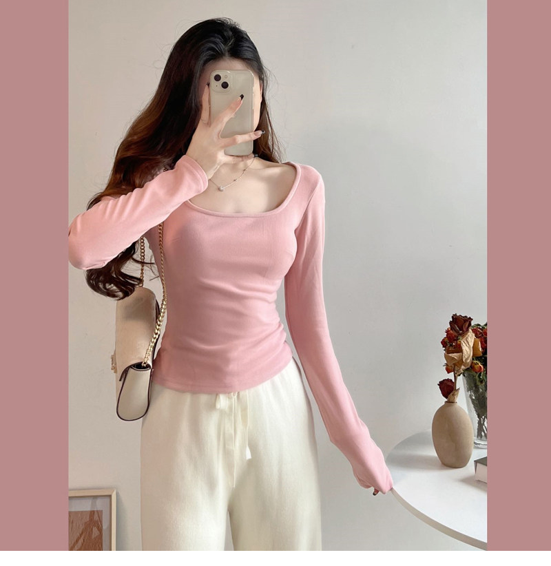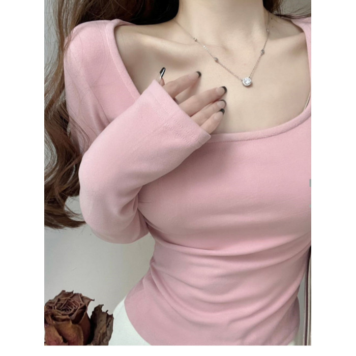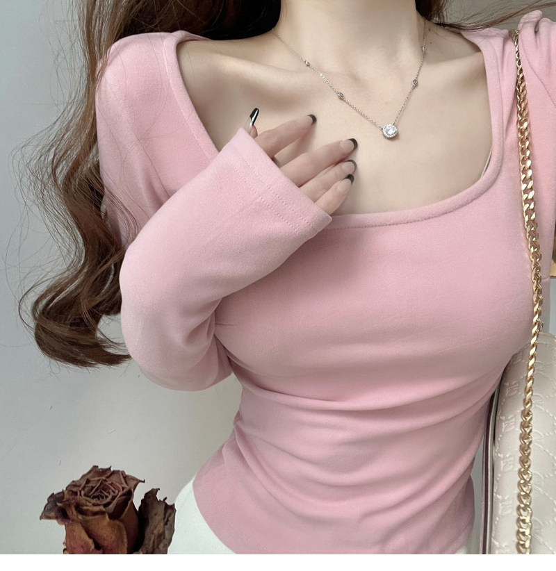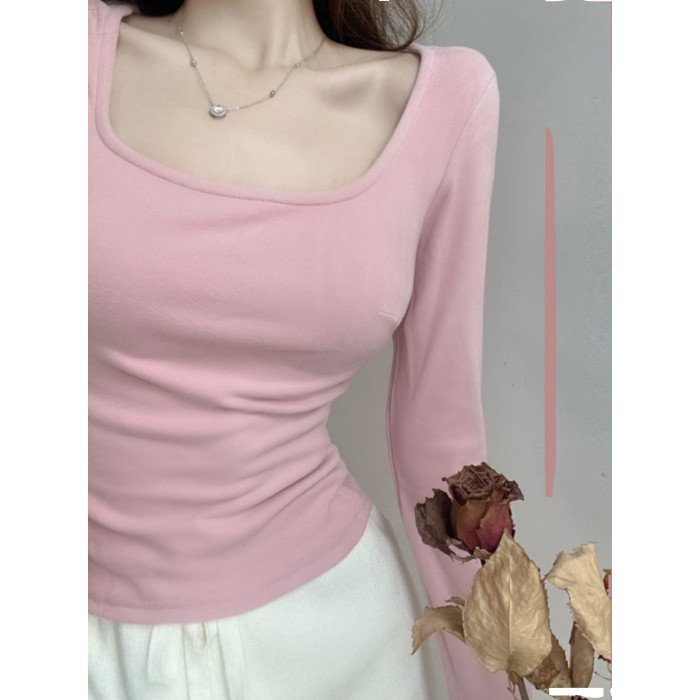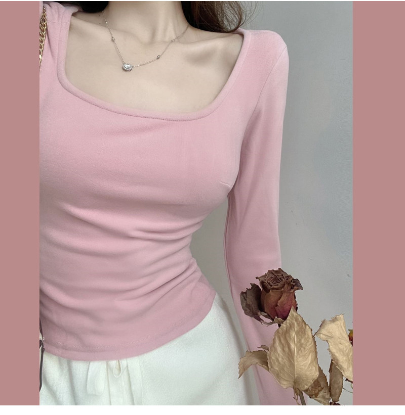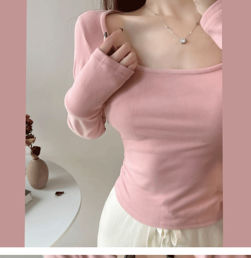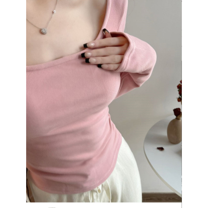 方領粉色內搭德絨打底衫女秋冬2025新款chic長袖t恤純欲低領上衣