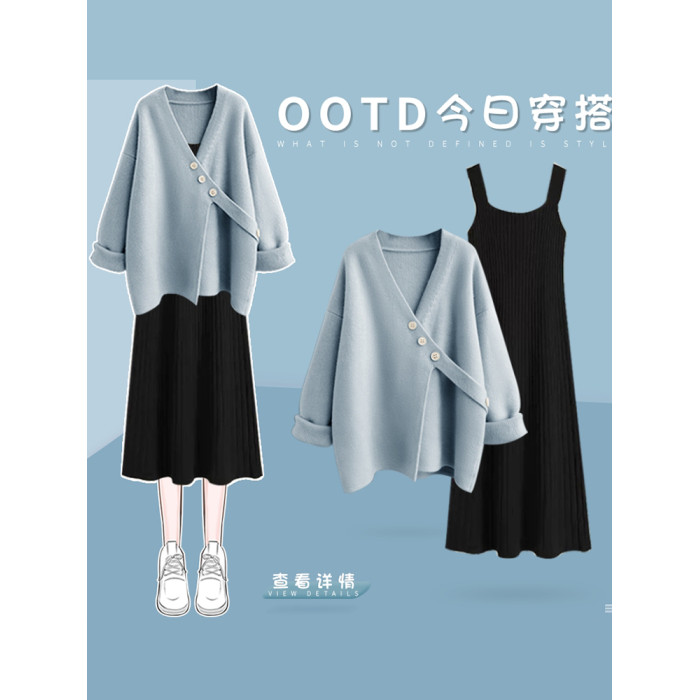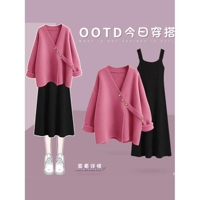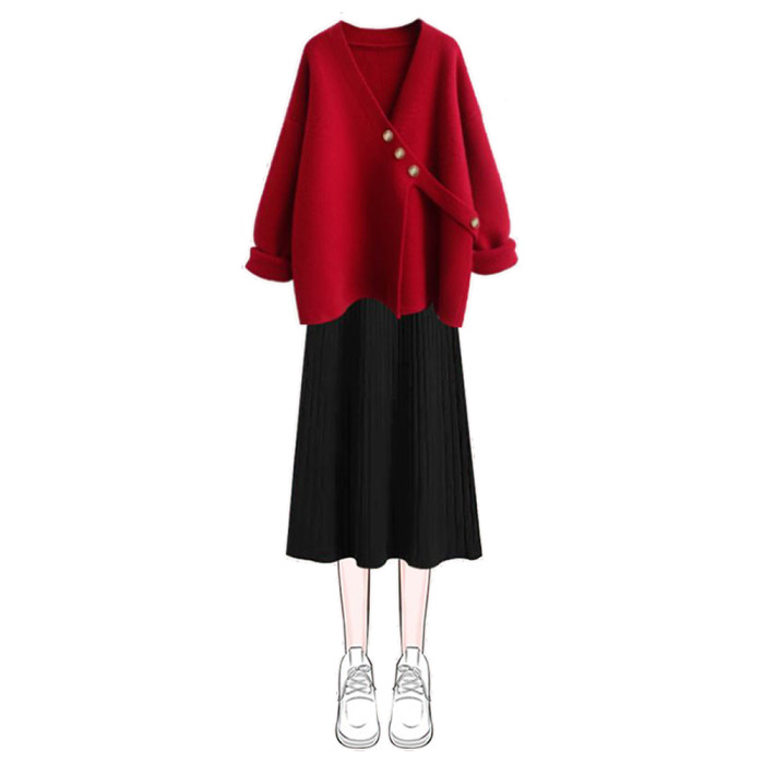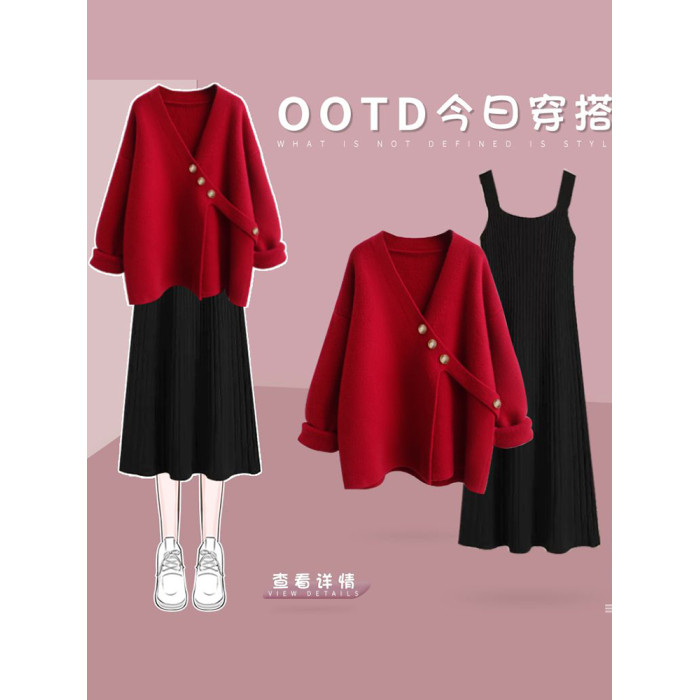 大碼女冬裝減齡套裝胖mm顯瘦遮肉聖誕節新年紅色毛衣連衣裙兩件套