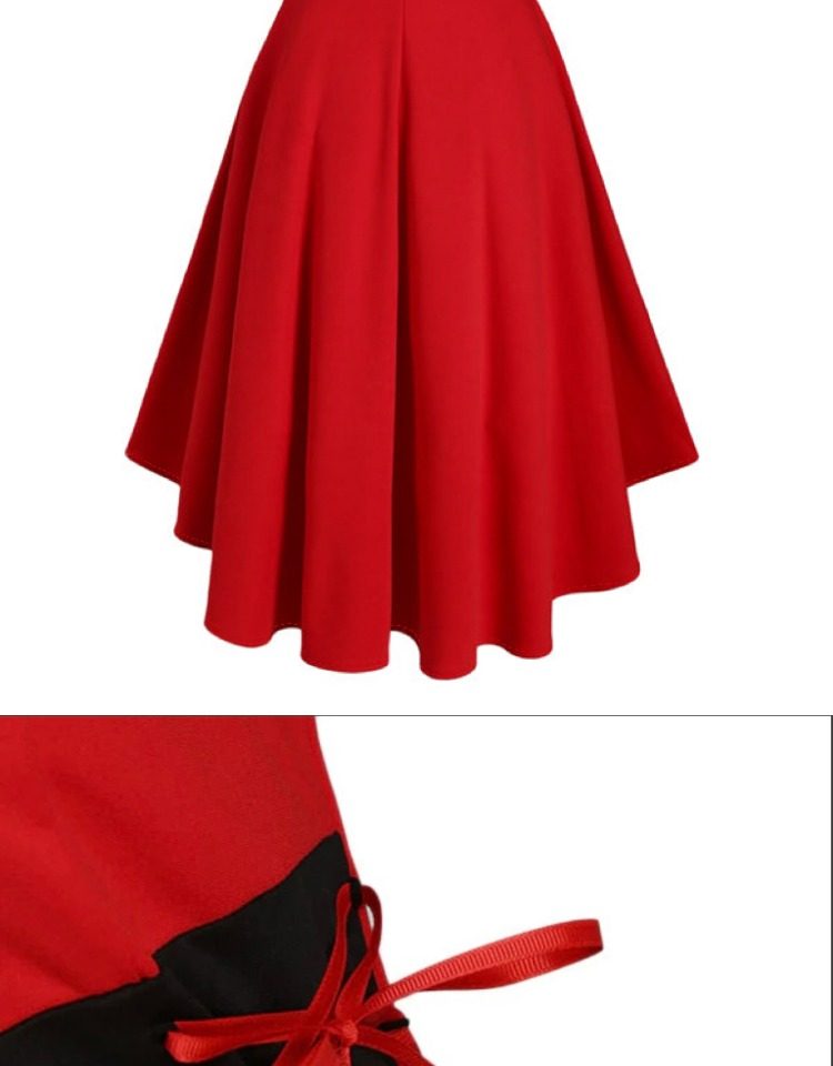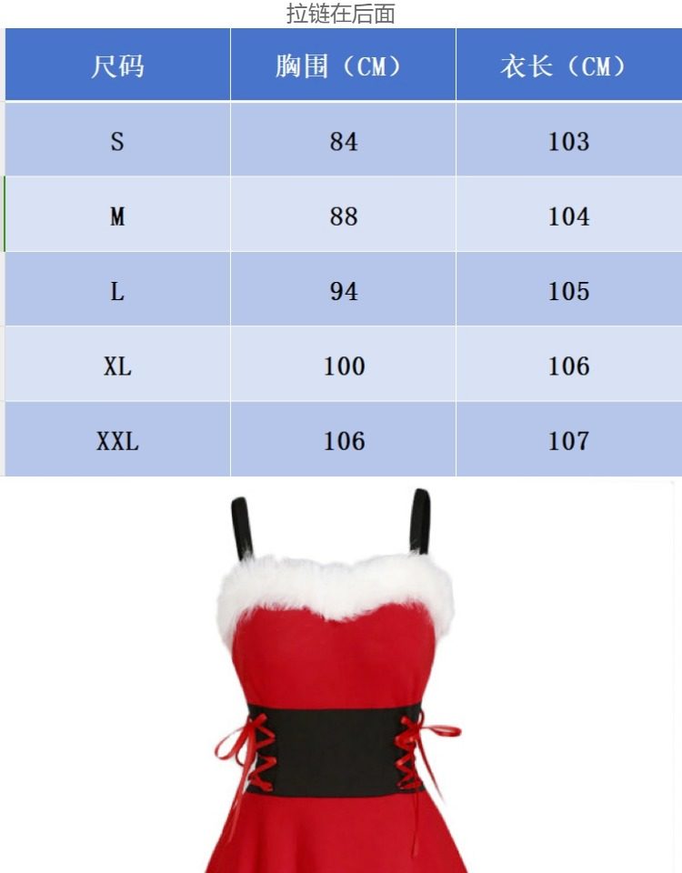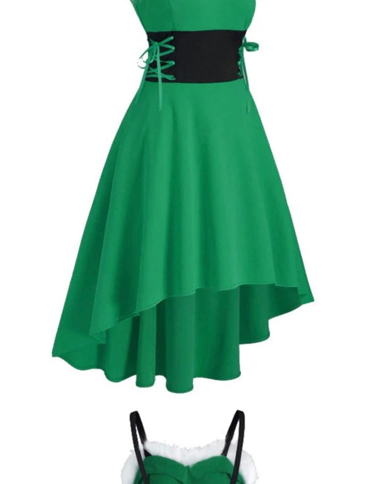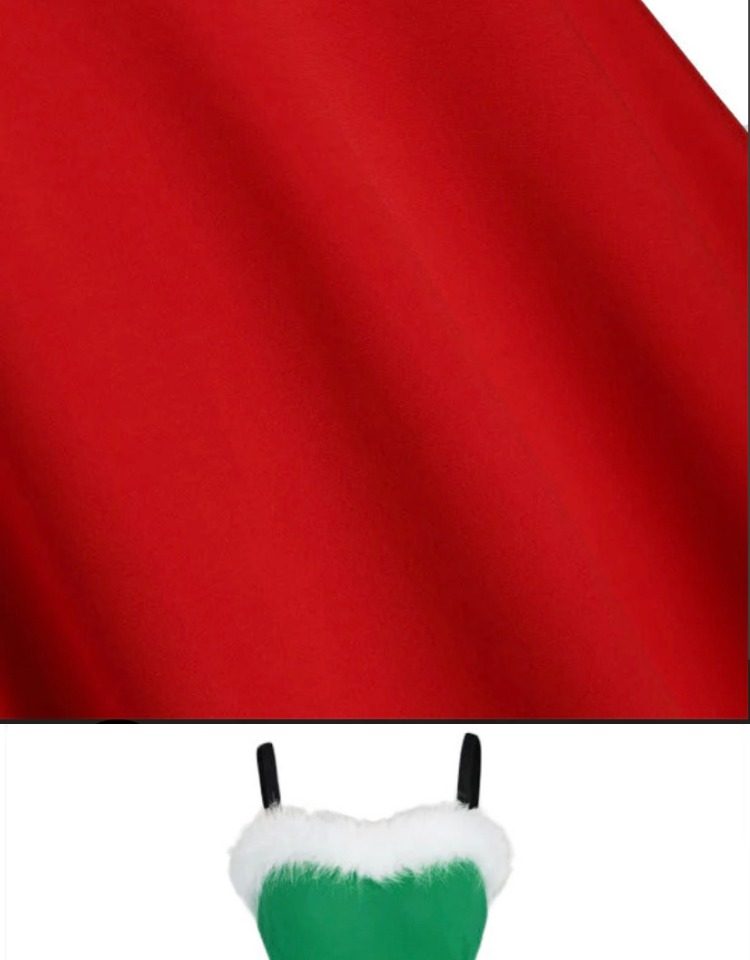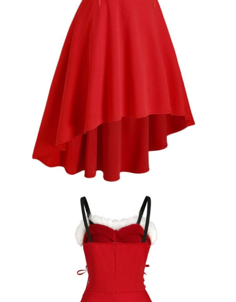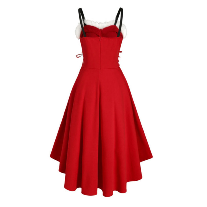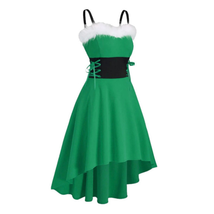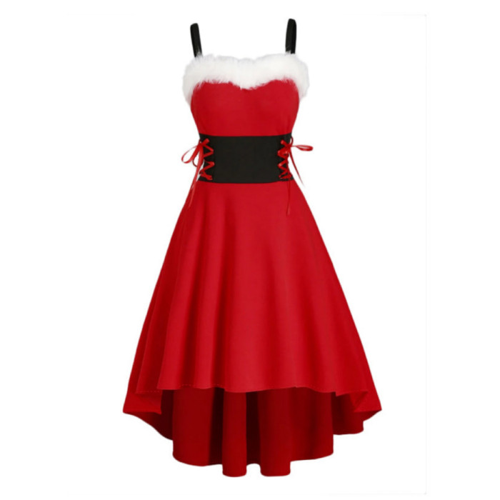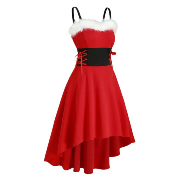 歐美毛毛領拼色系帶收腰聖誕新年聚會派對系吊帶修身不規則連衣裙