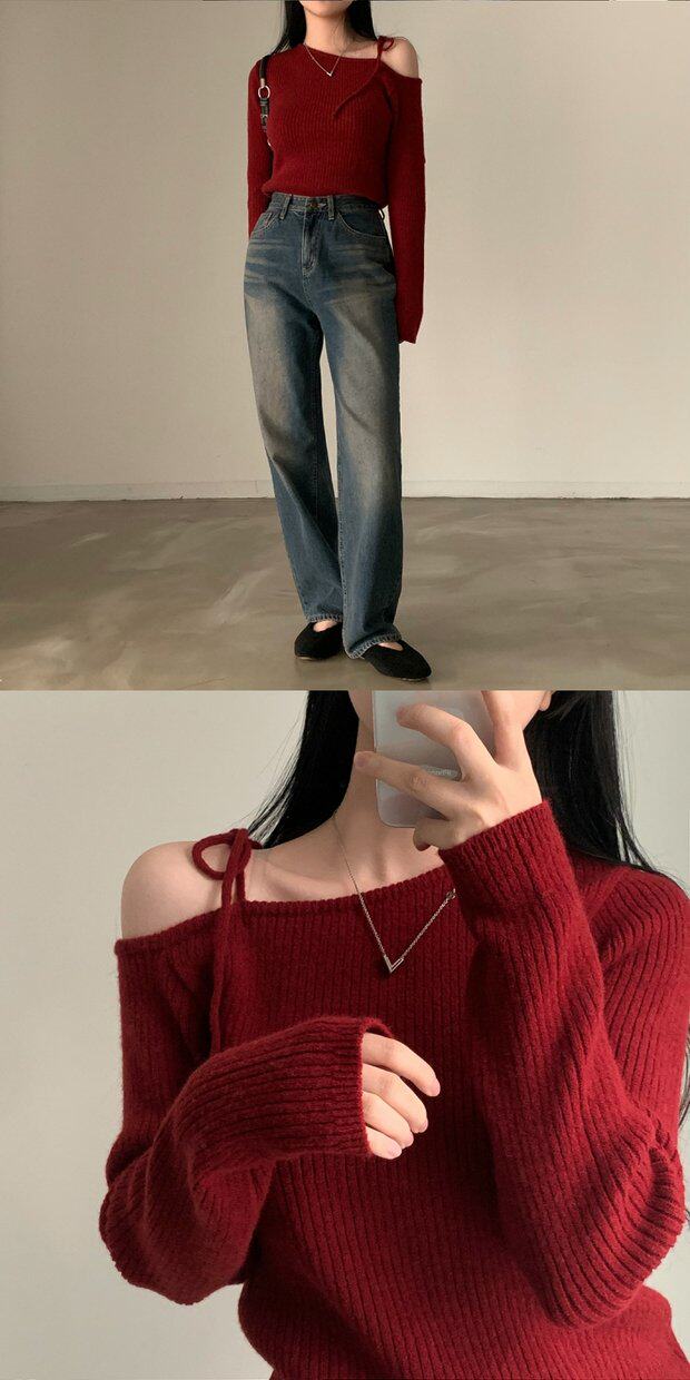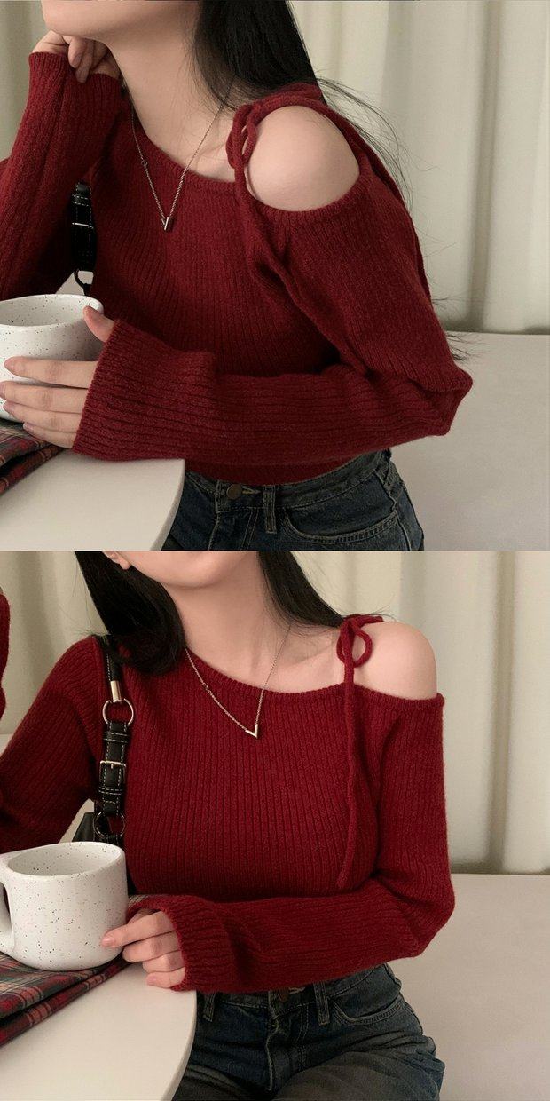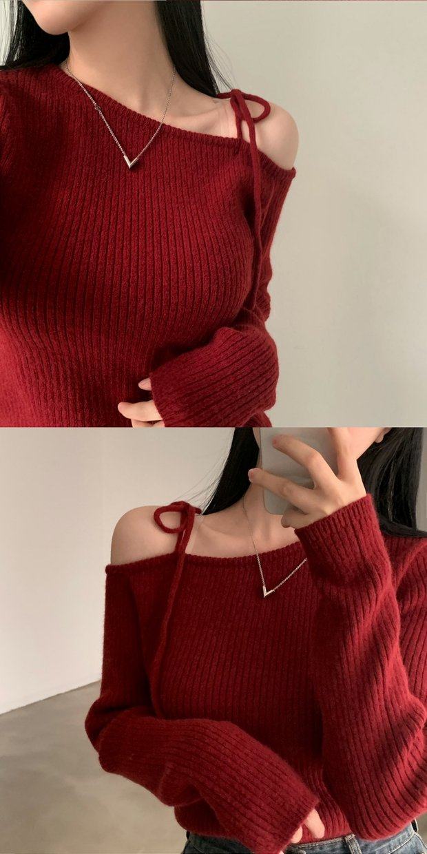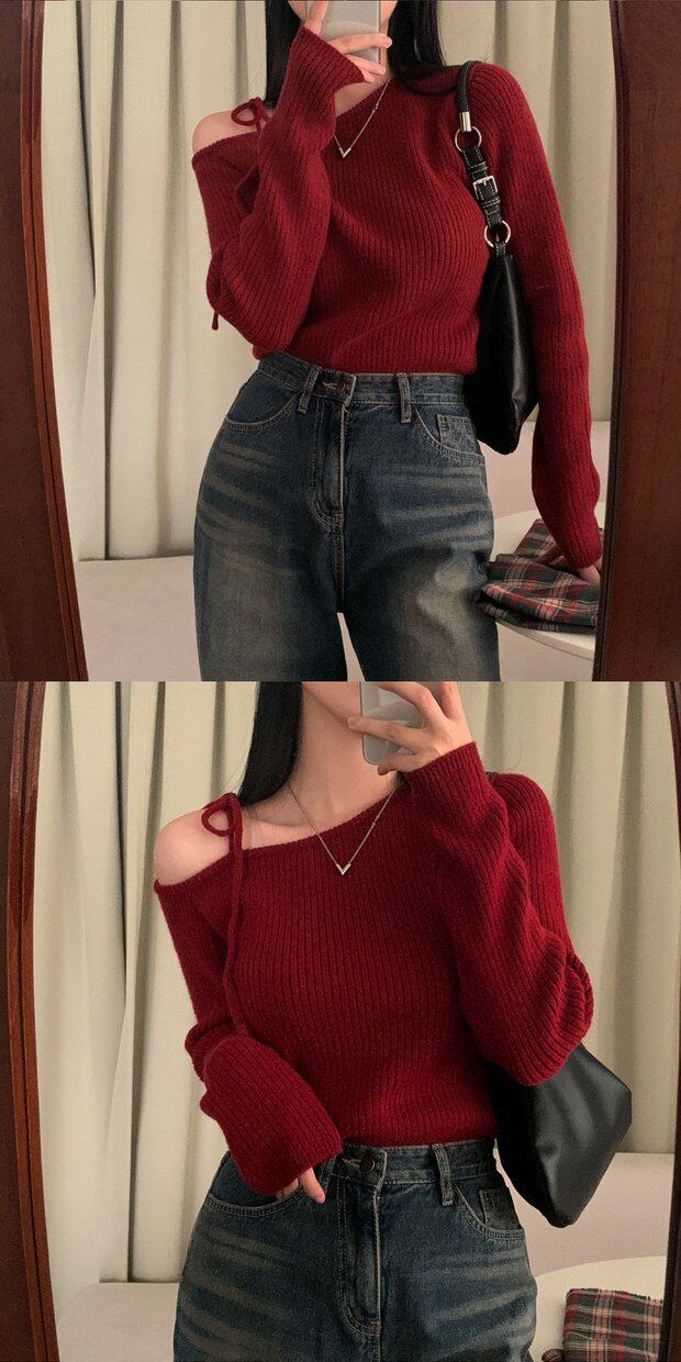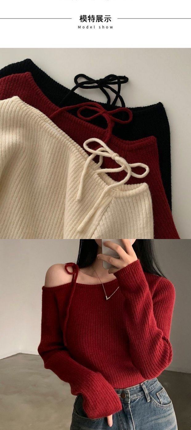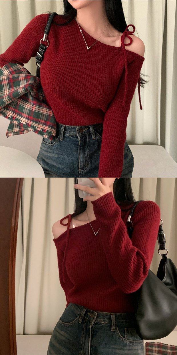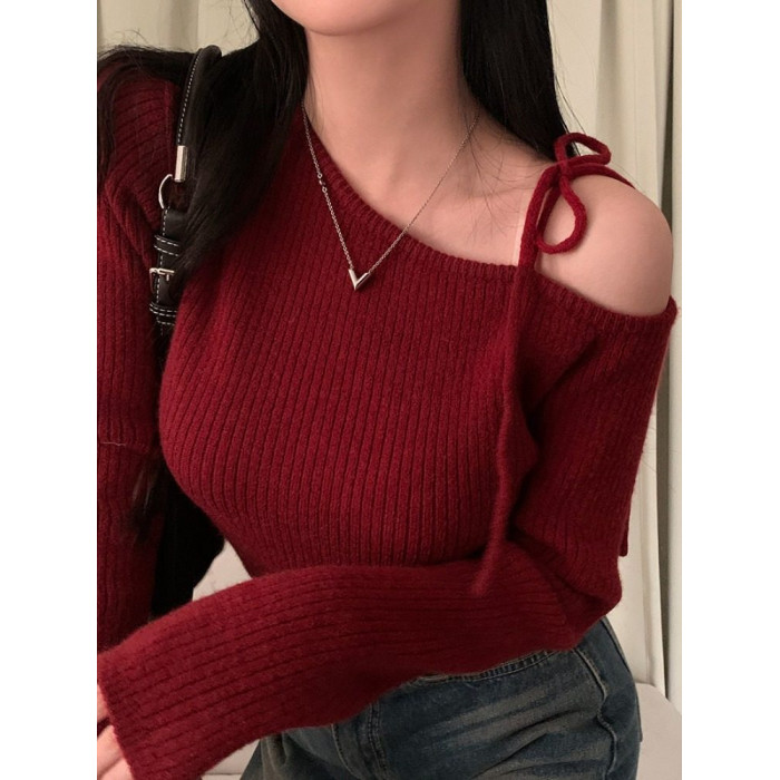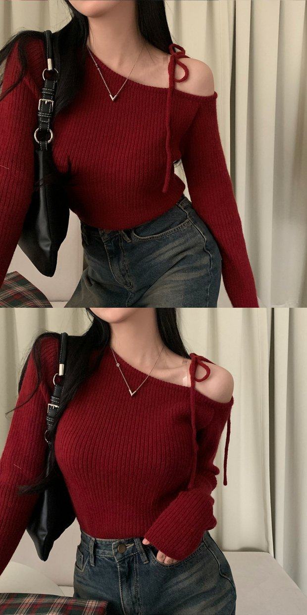 韓國chic早春設計款斜領系帶露肩新年紅毛衣修身顯瘦長袖針織衫女