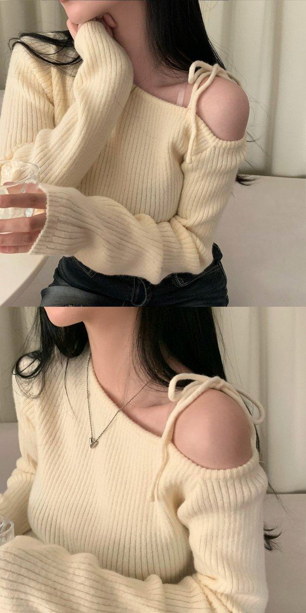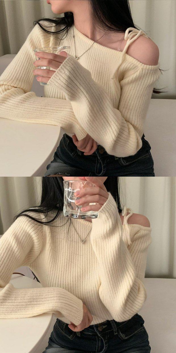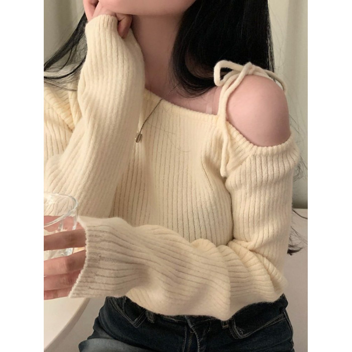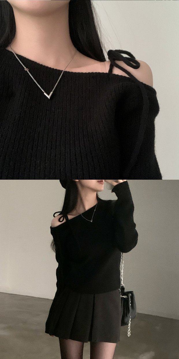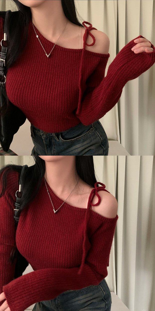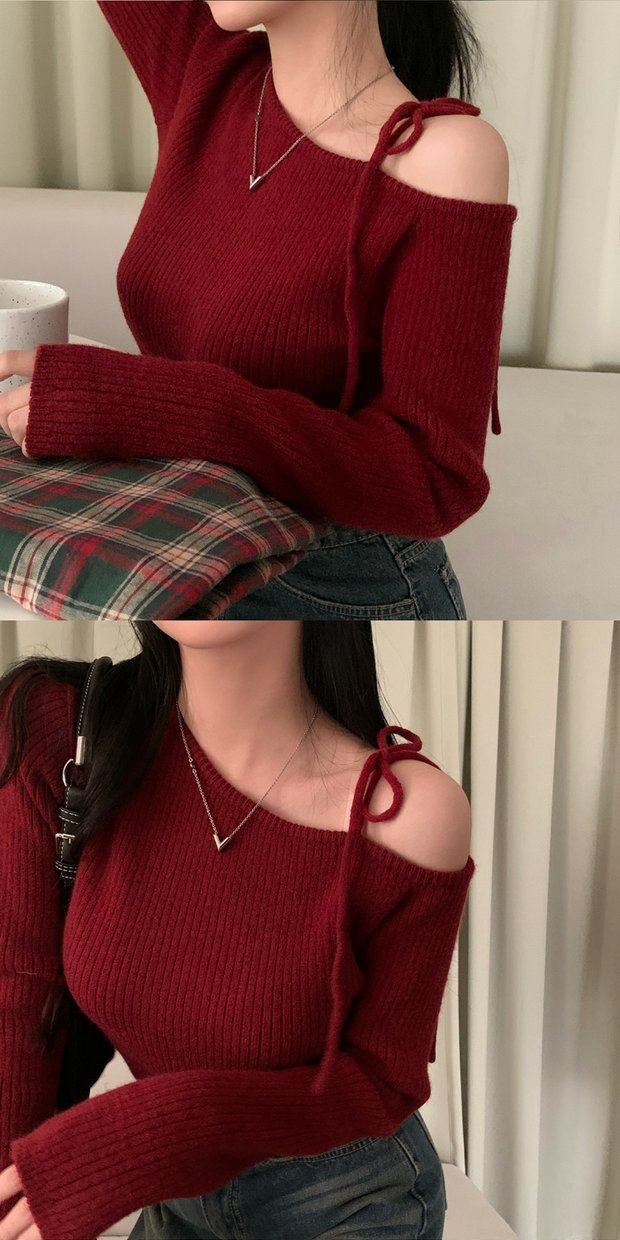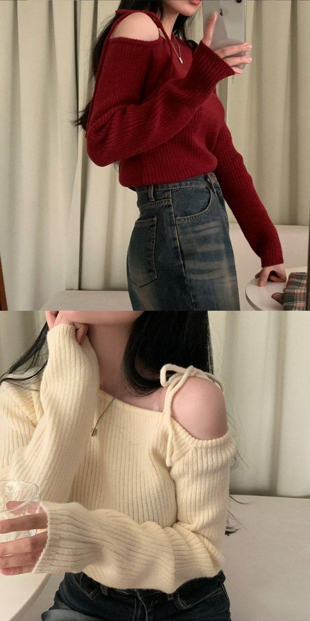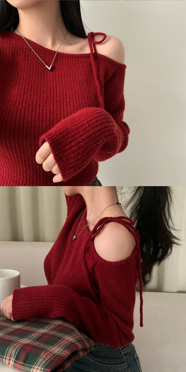 韓國chic早春設計款斜領系帶露肩新年紅毛衣修身顯瘦長袖針織衫女