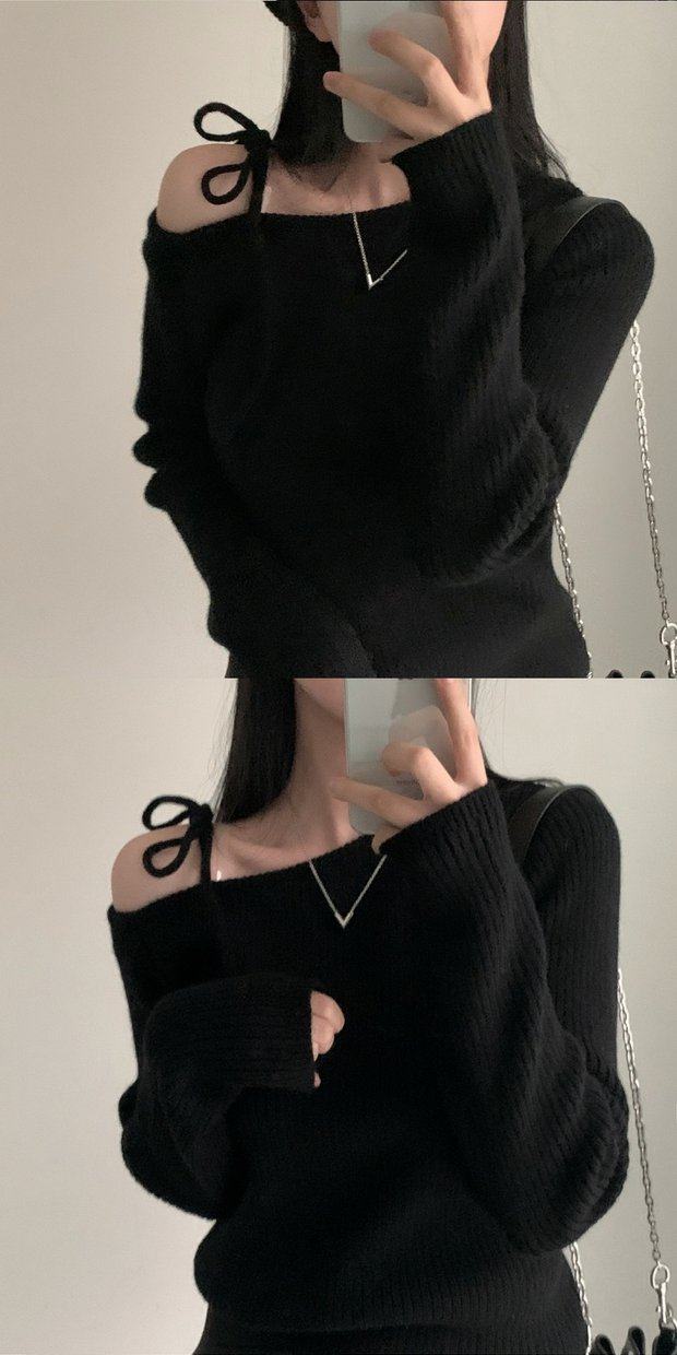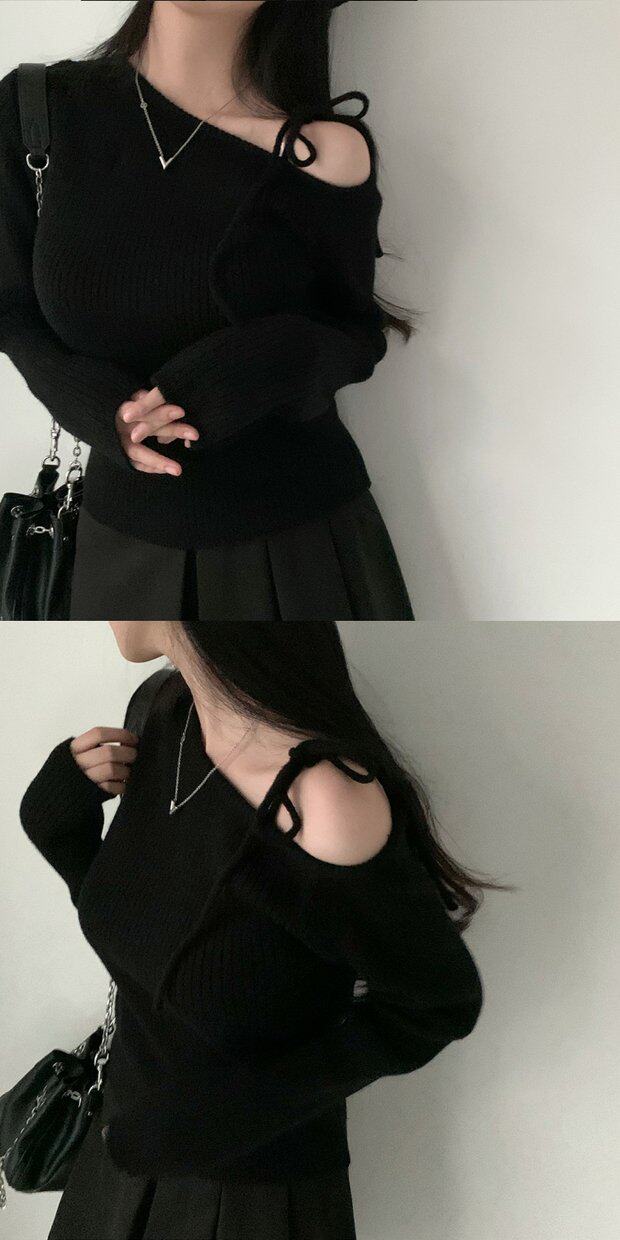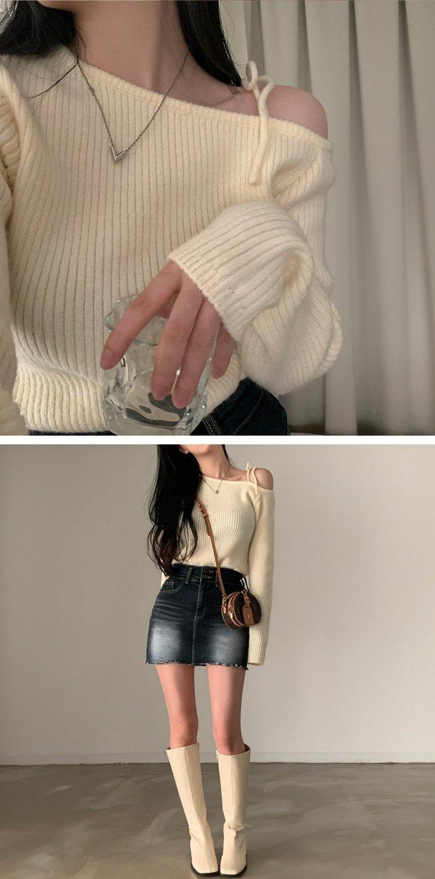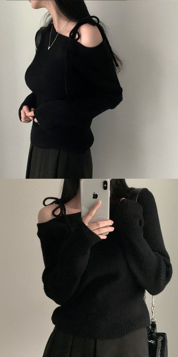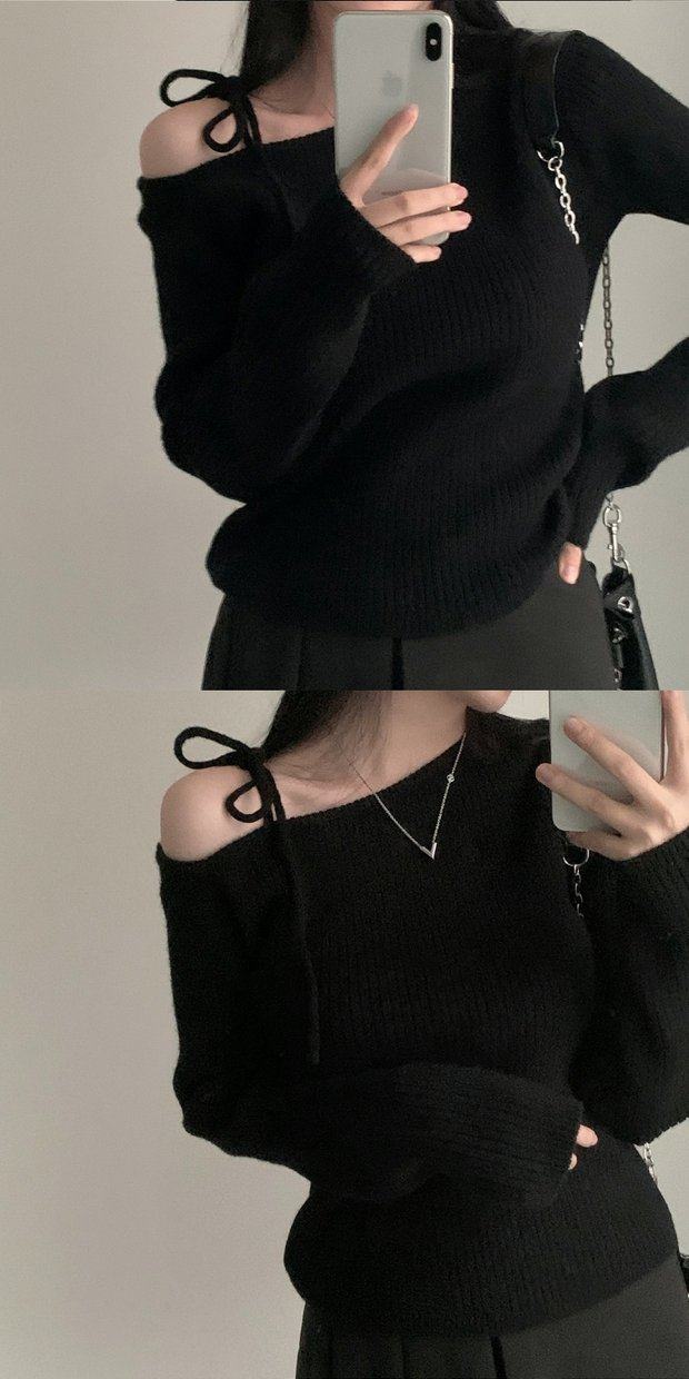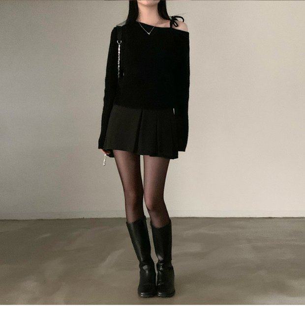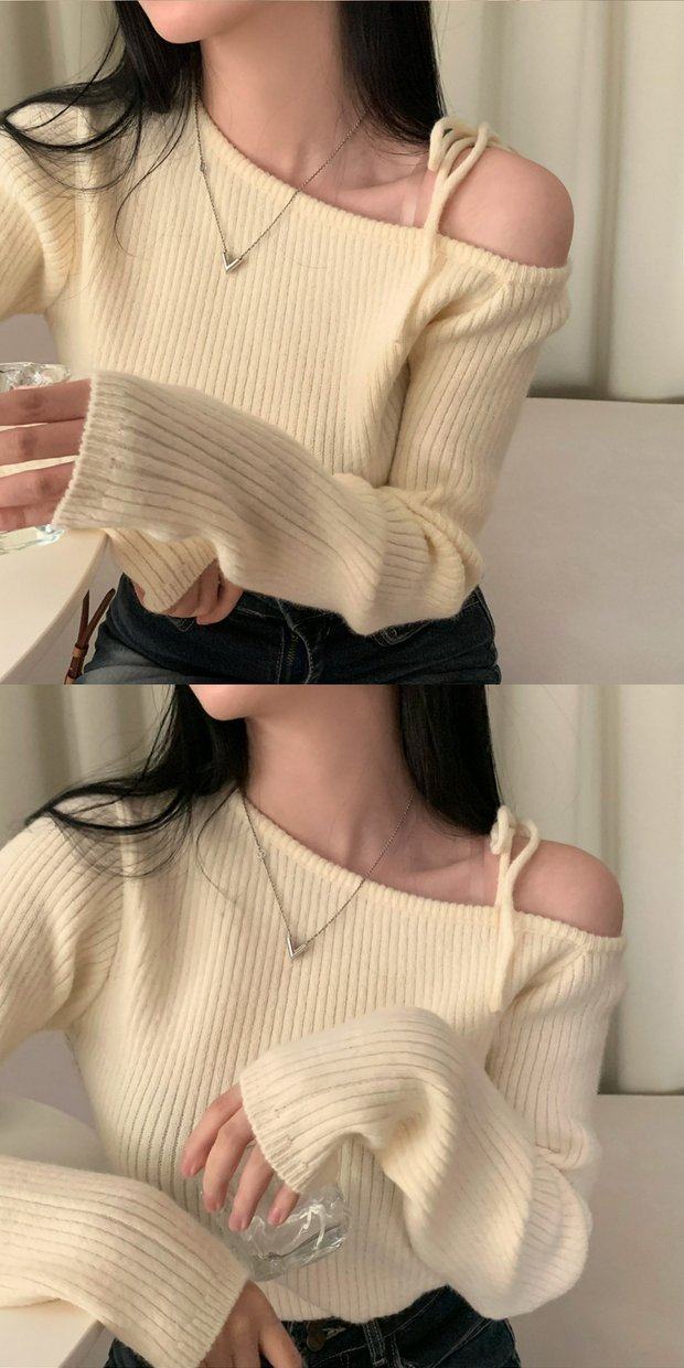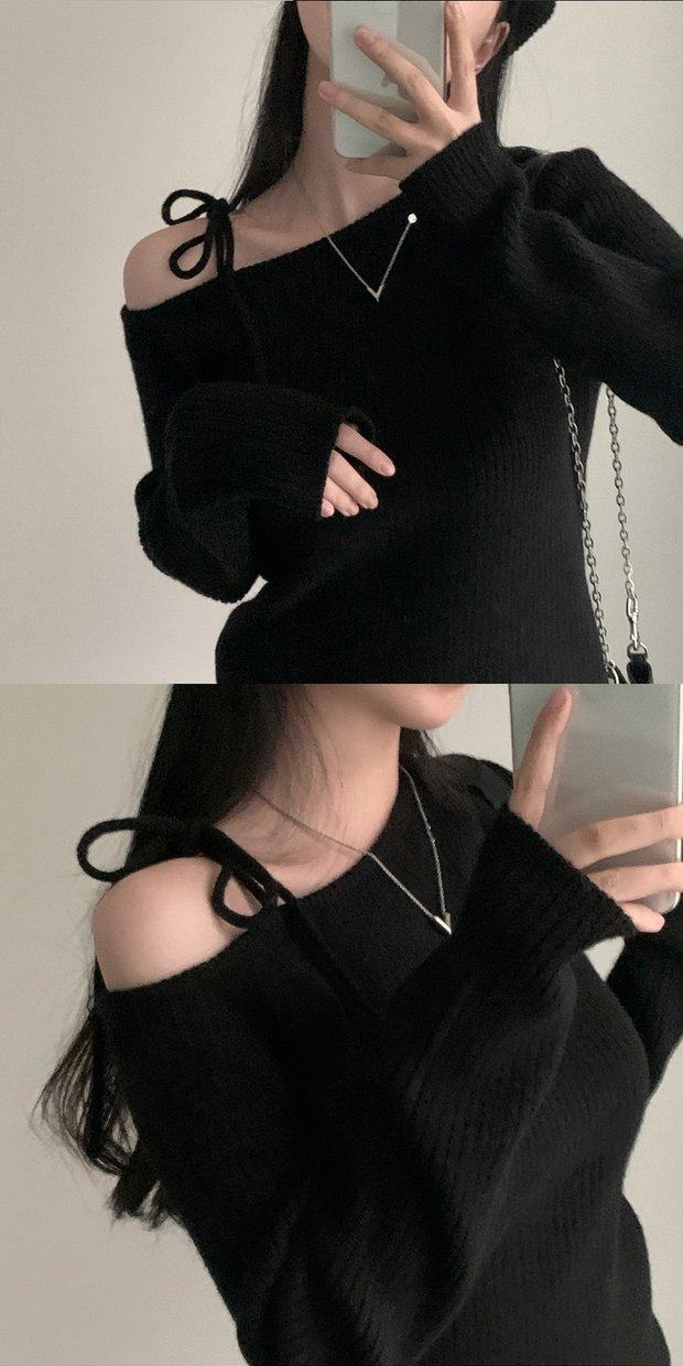 韓國chic早春設計款斜領系帶露肩新年紅毛衣修身顯瘦長袖針織衫女