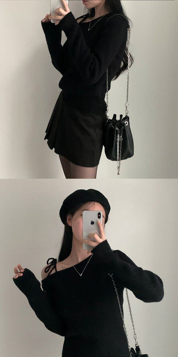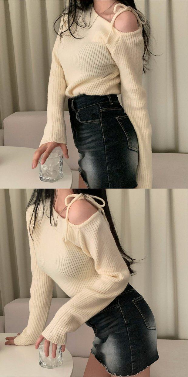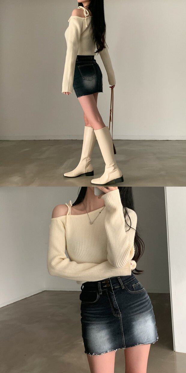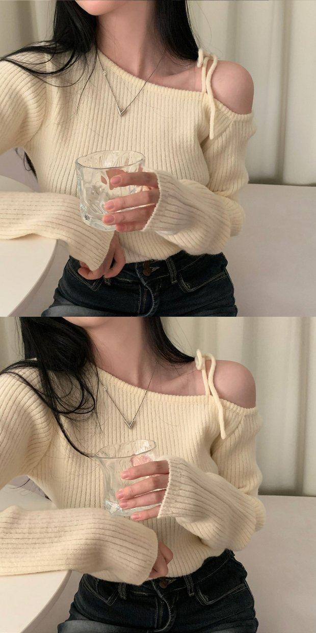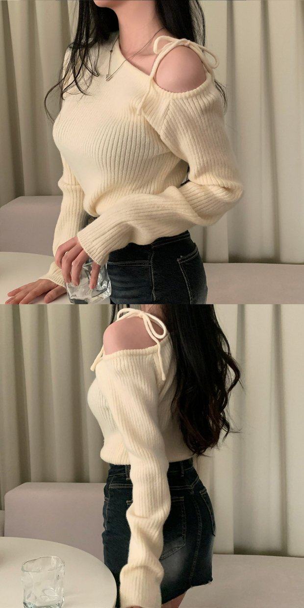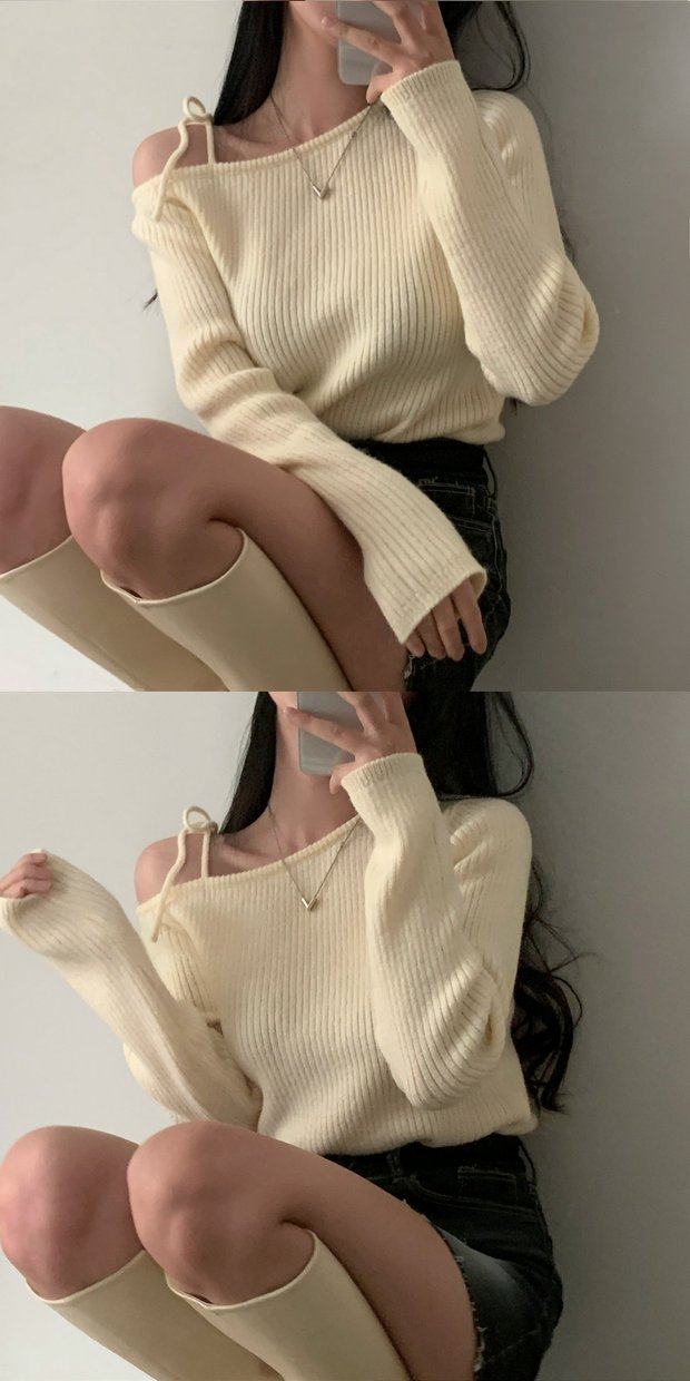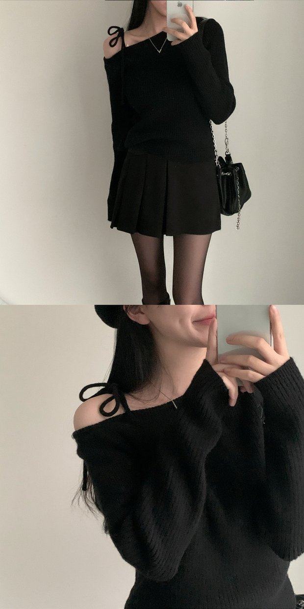 韓國chic早春設計款斜領系帶露肩新年紅毛衣修身顯瘦長袖針織衫女