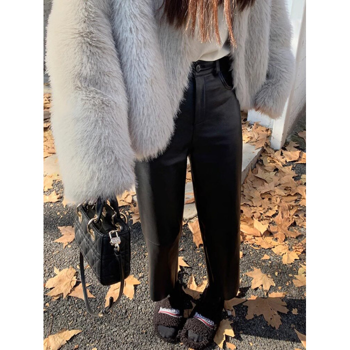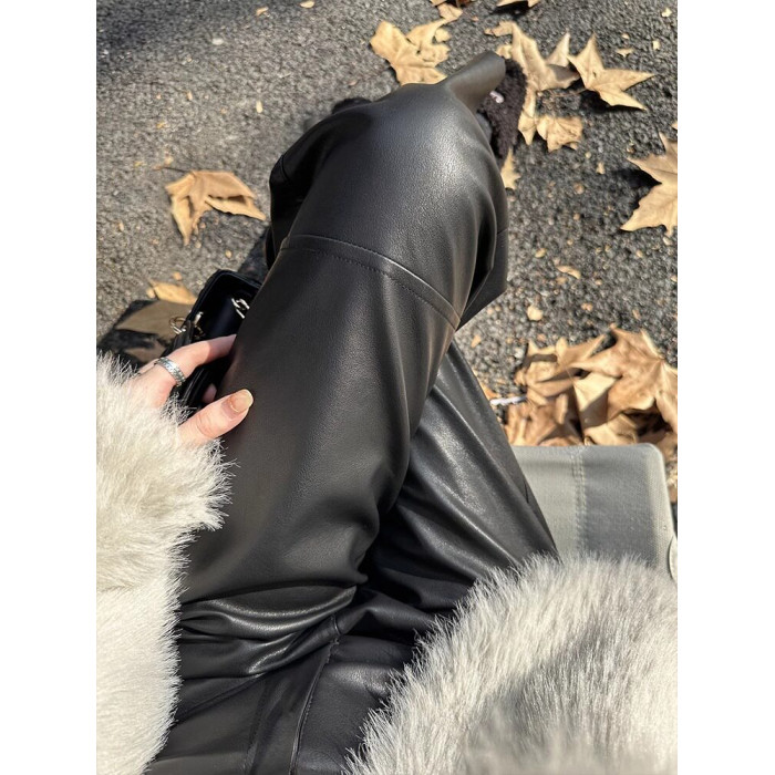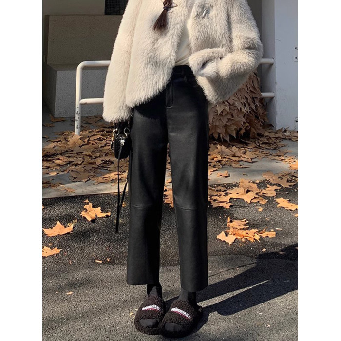 150小個子仿真柔軟小羊皮褲女新款145八分顯高直筒顯瘦PU皮休閒褲