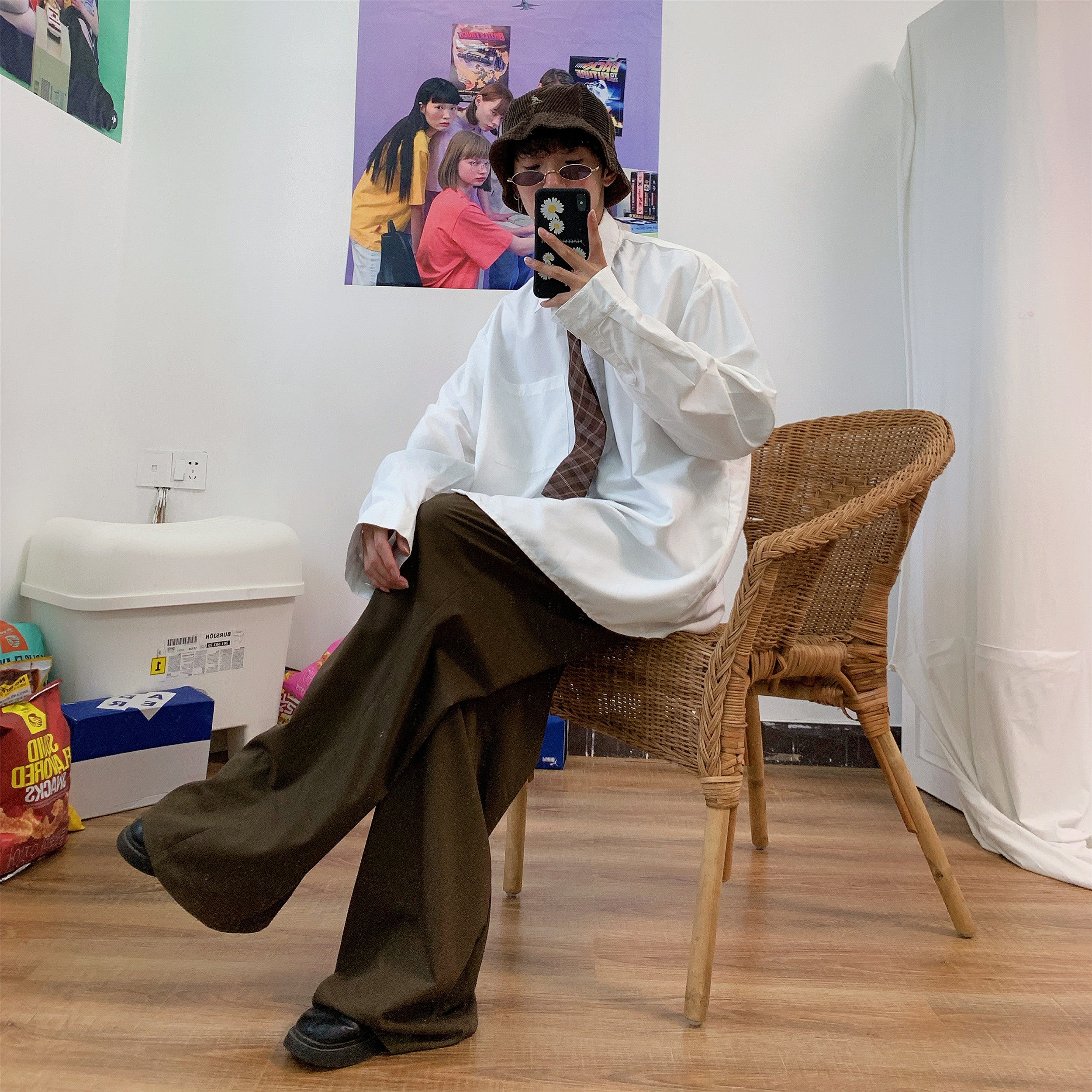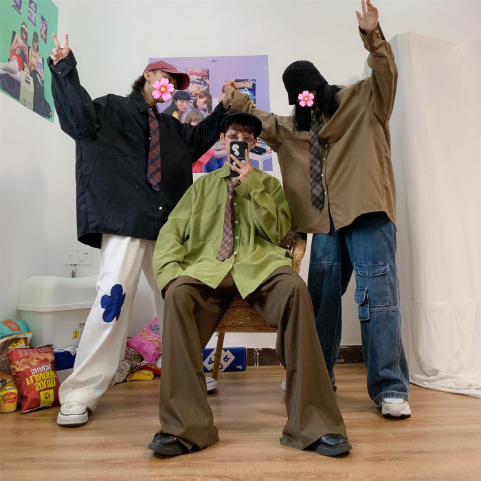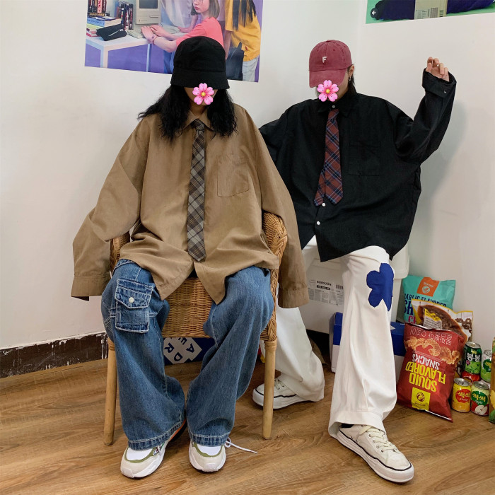 C2自製/春秋港風復古長袖襯衣情侶寬鬆oversize韓版內搭休閒襯衫
