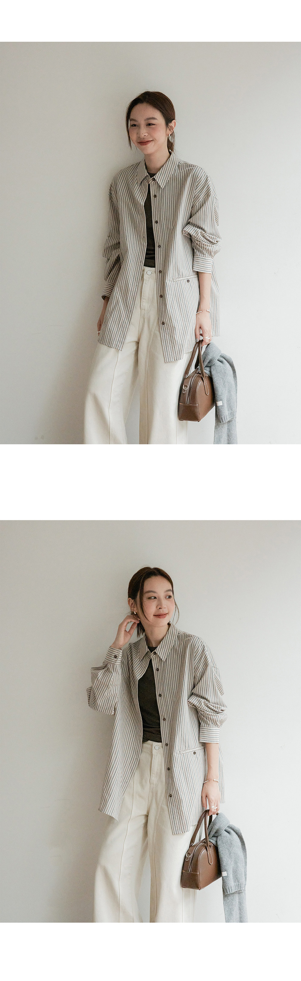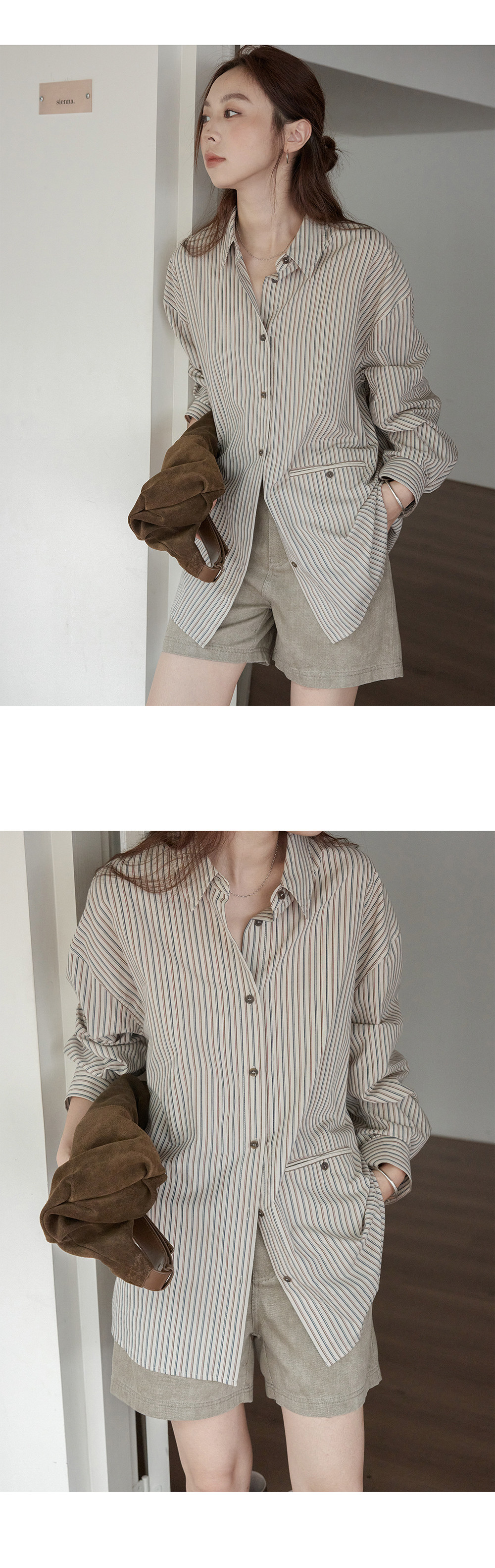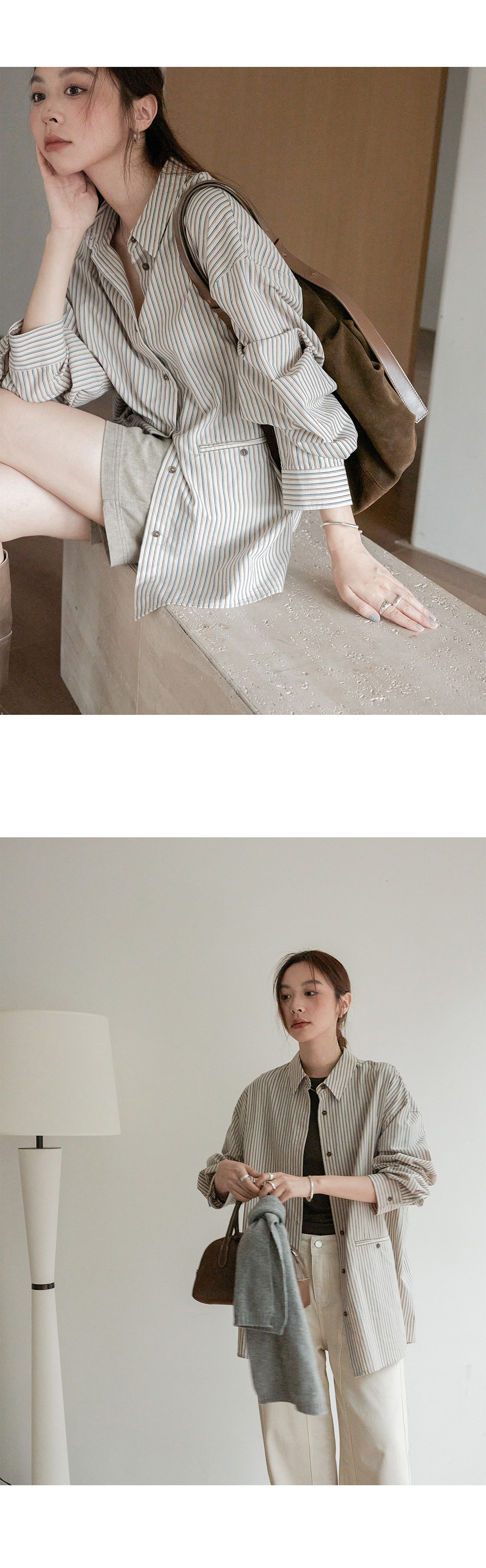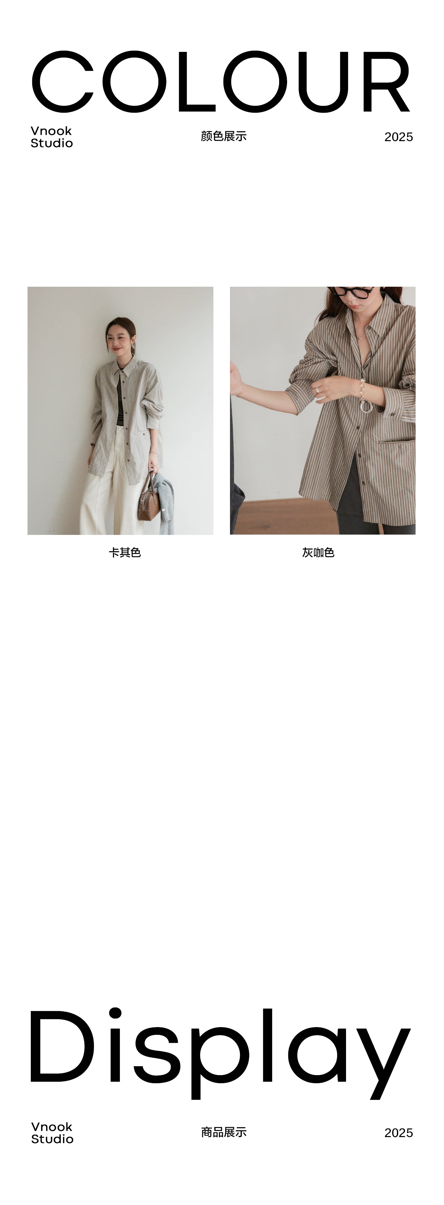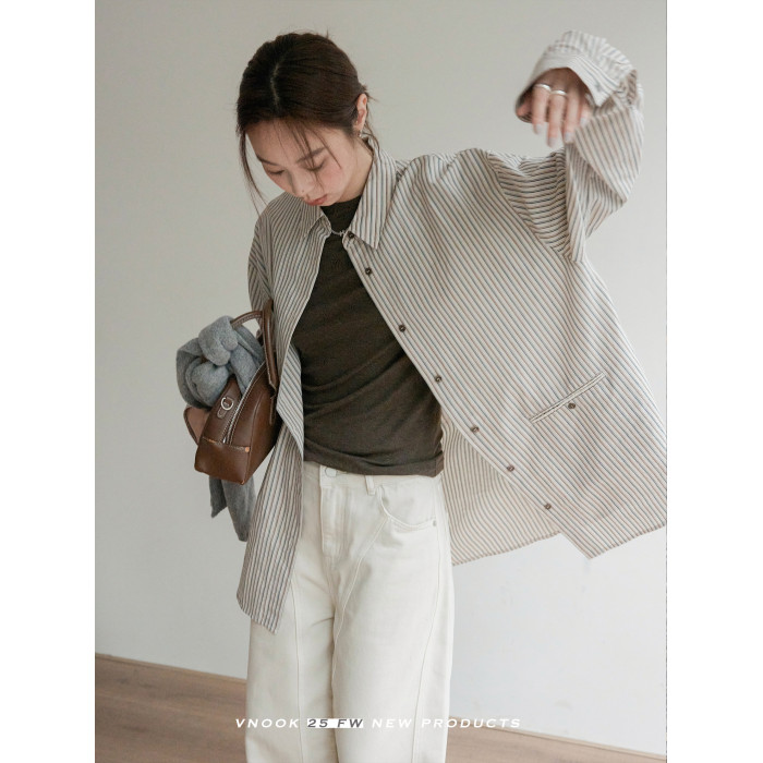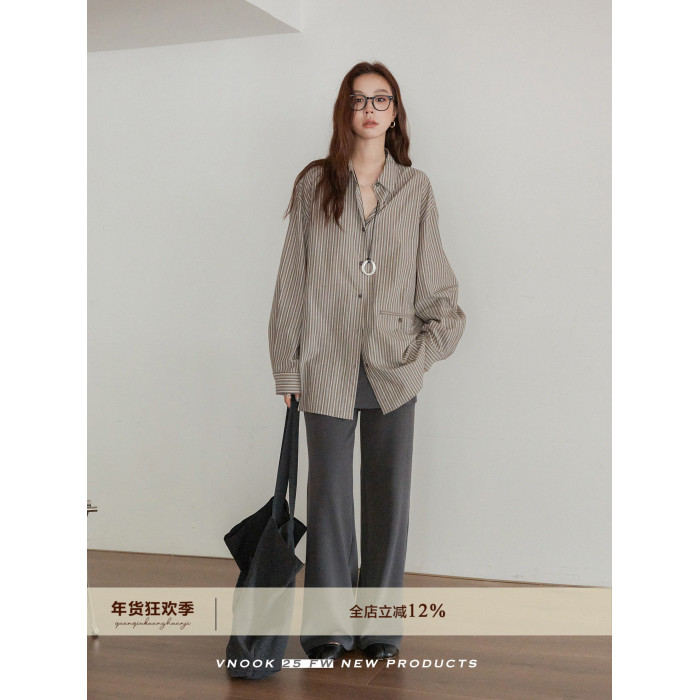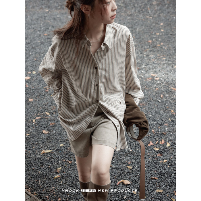 VNOOK 色織棉條紋長袖襯衫女秋季新款寬鬆設計感小衆上衣繙領襯衣