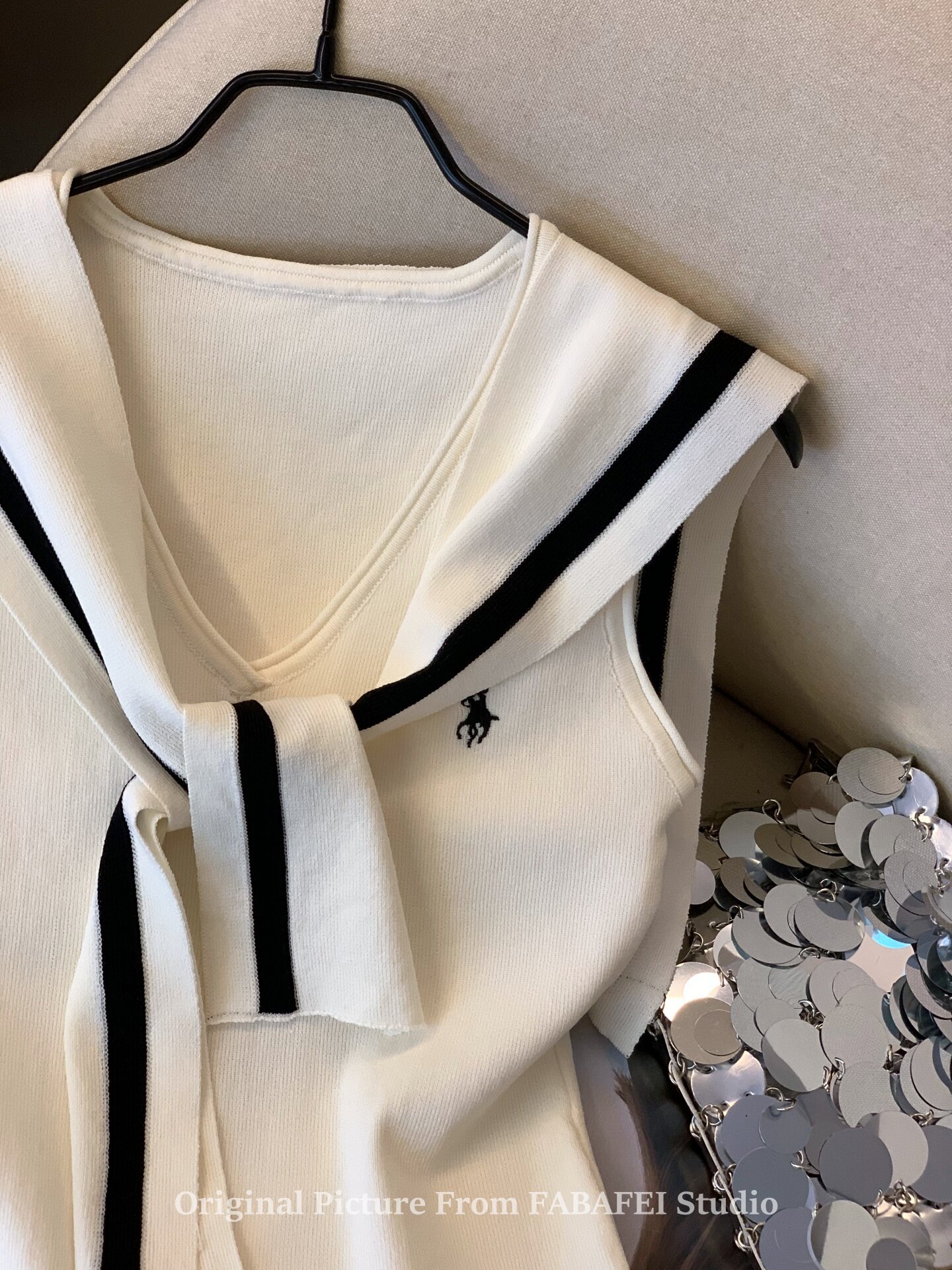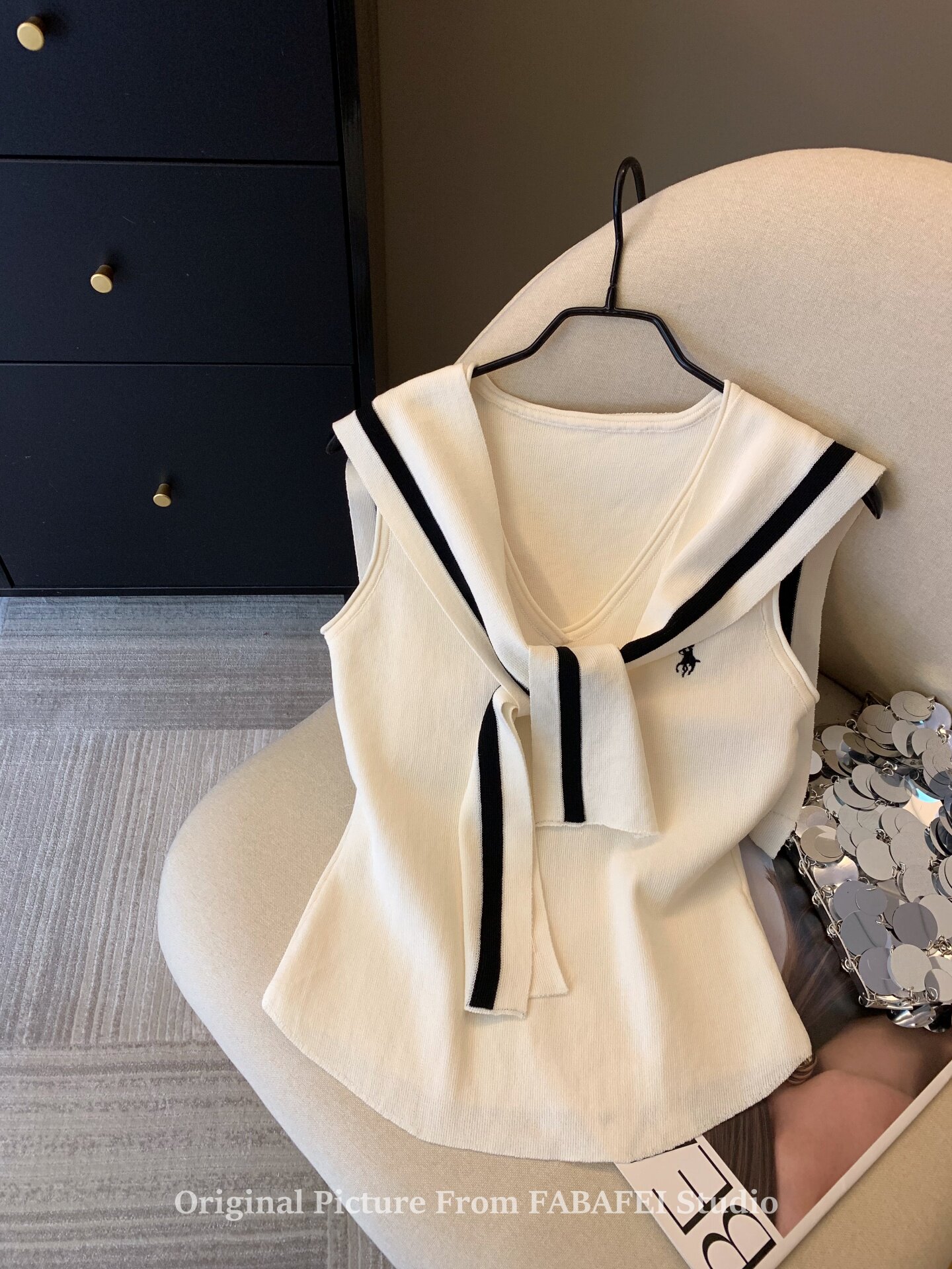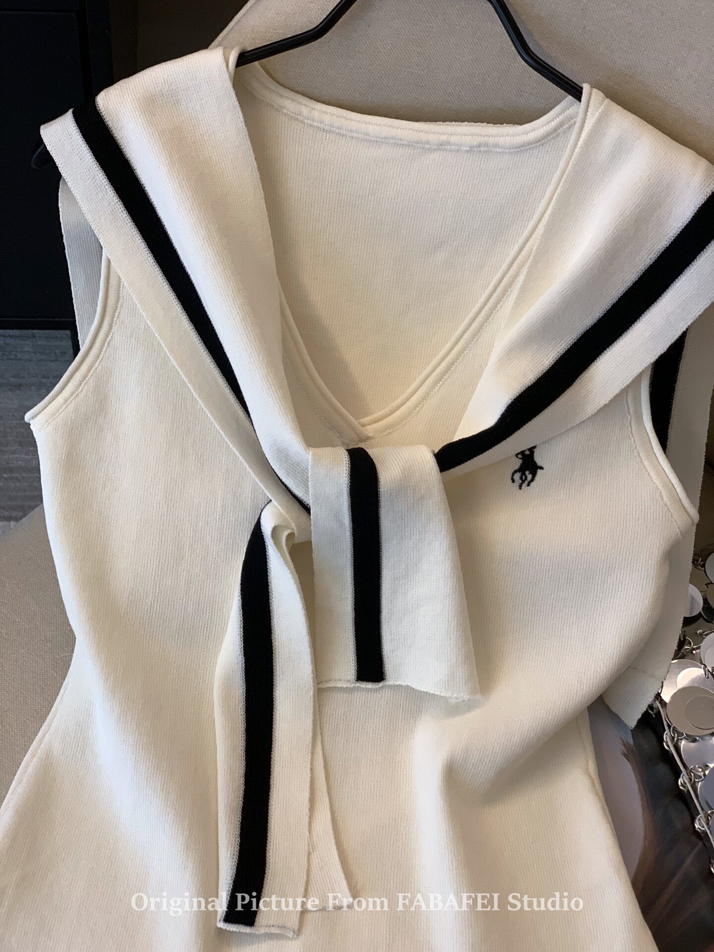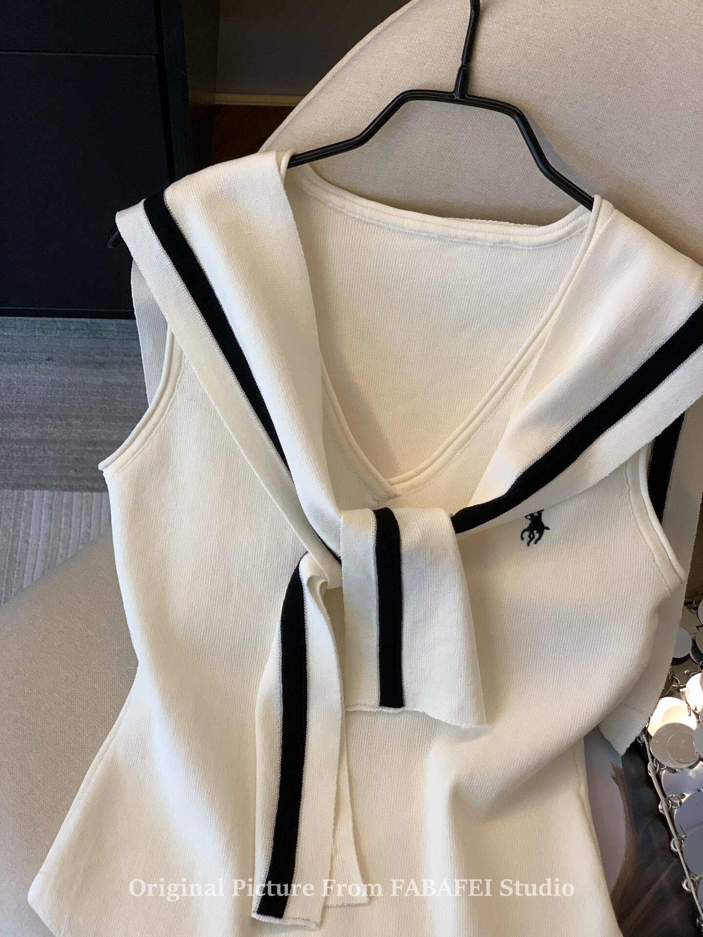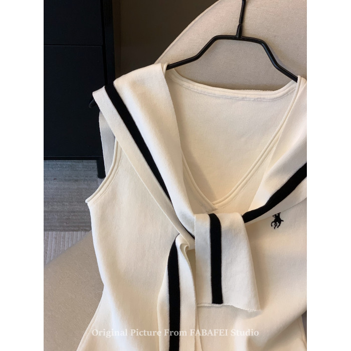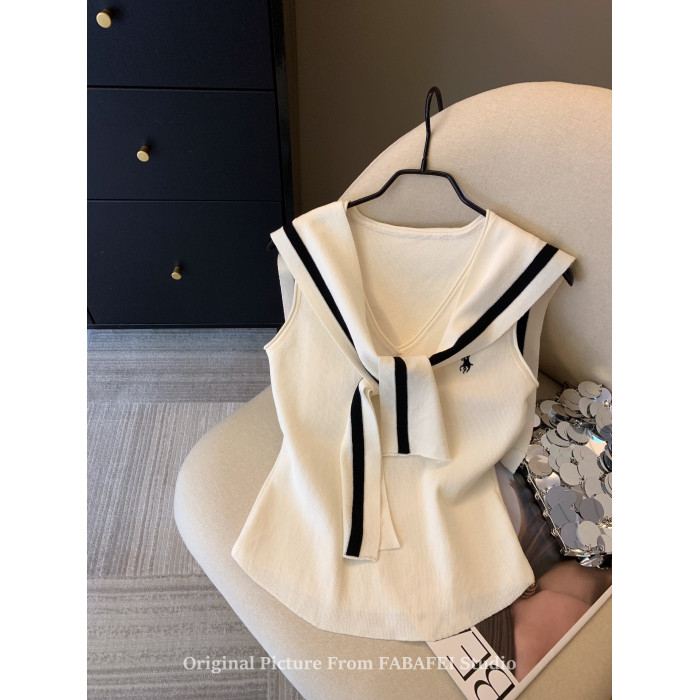 自畱爆款推薦~辣妹海軍領條紋針織背心女2026夏小馬刺綉披肩上衣
