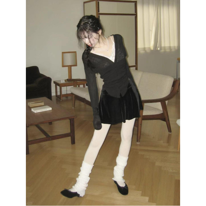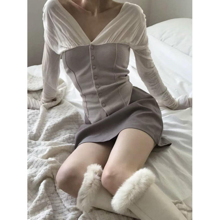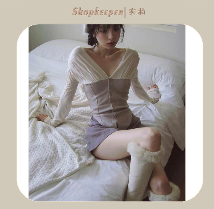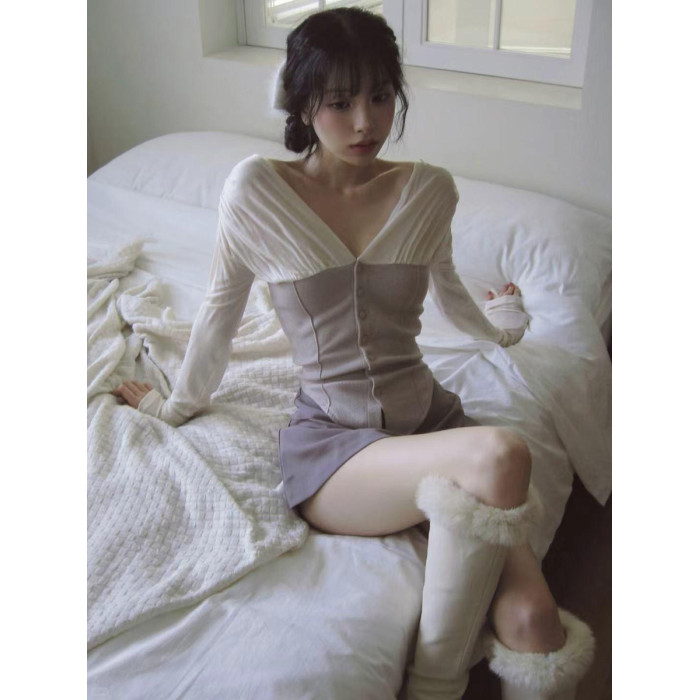 「」韓系溫柔褶皺V領顯瘦長袖襯衫女春裝新款百搭拼接上衣