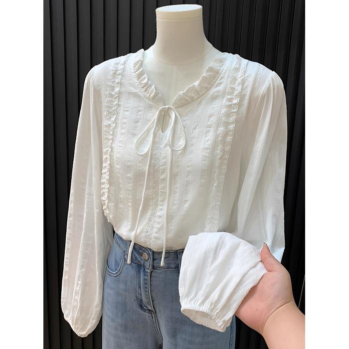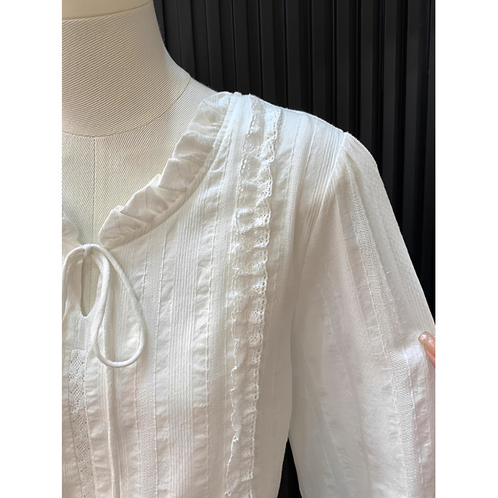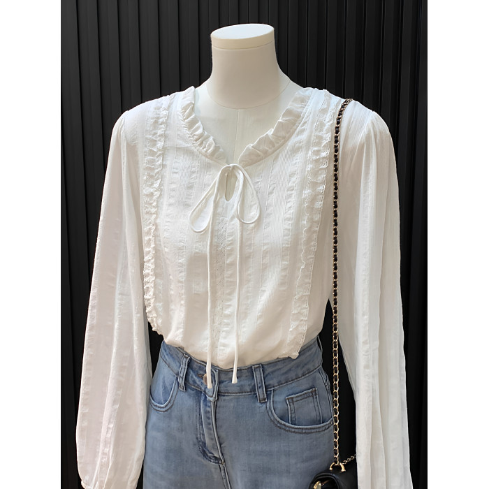 法式花邊領系帶白色襯衫女春秋新款高級感溫柔風氣質別致長袖上衣