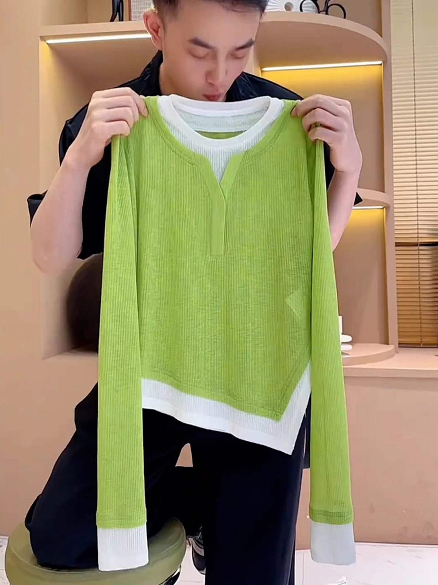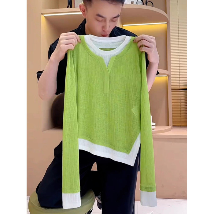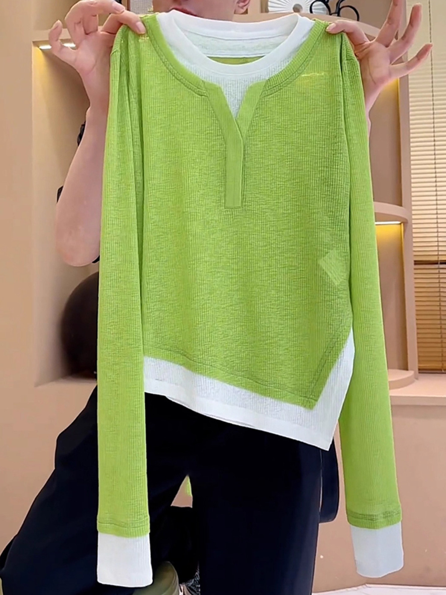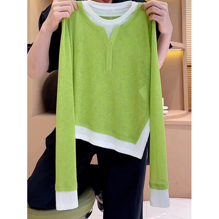 假兩件套頭2025秋季撞色防曬衣休閒長袖流行高級針織上衣t恤顯瘦