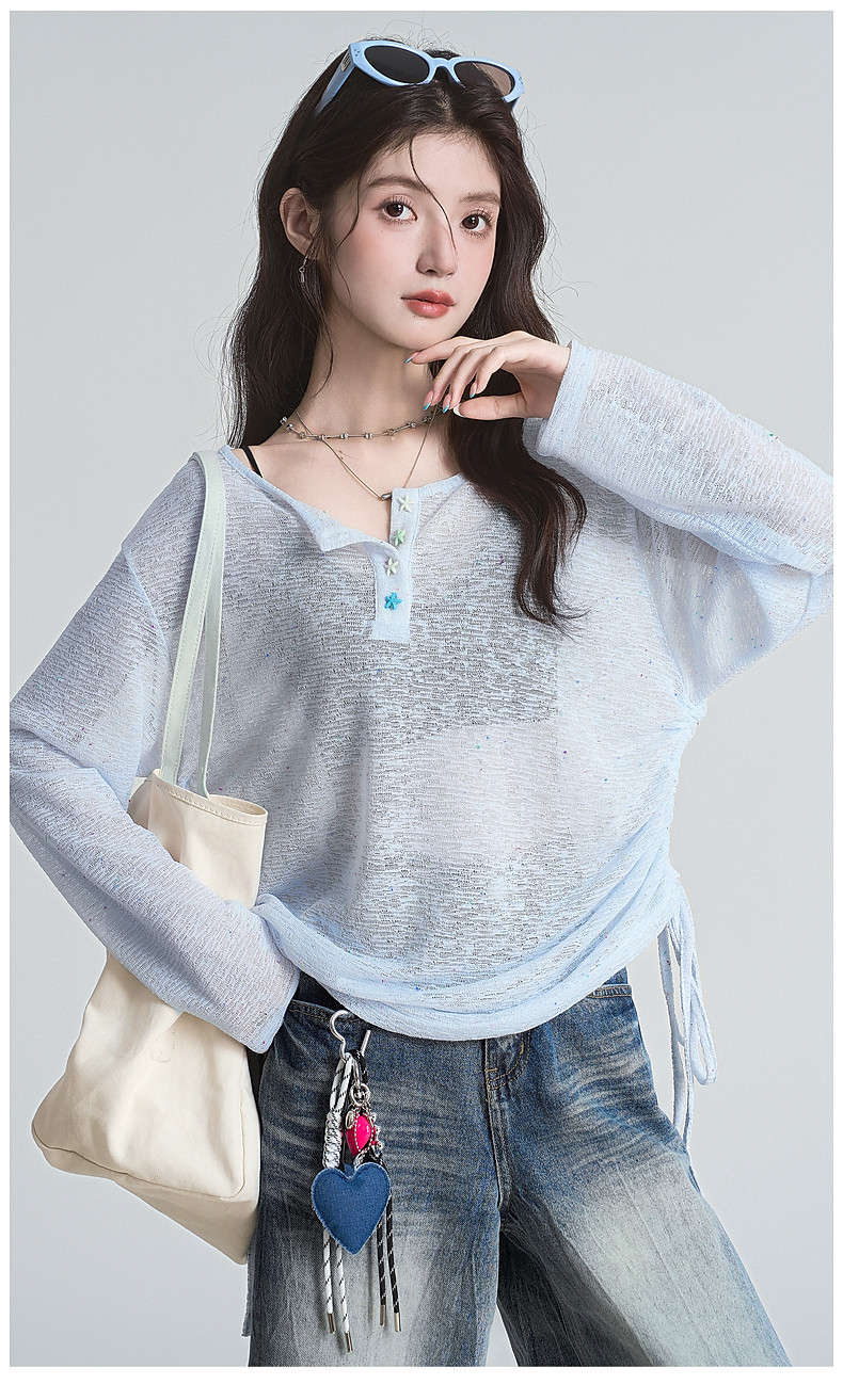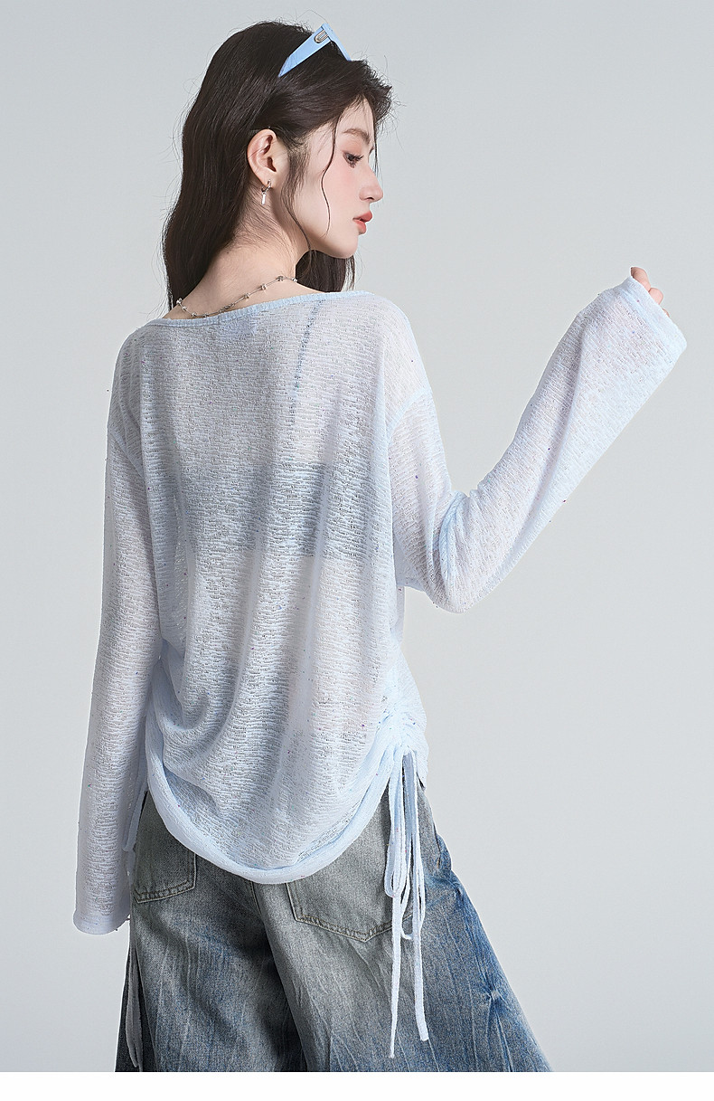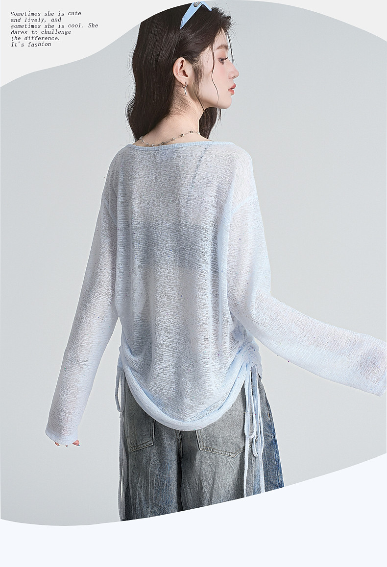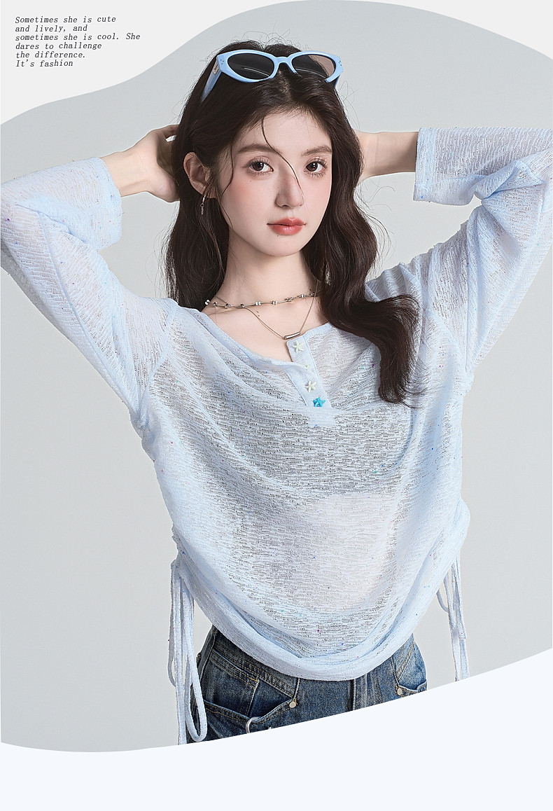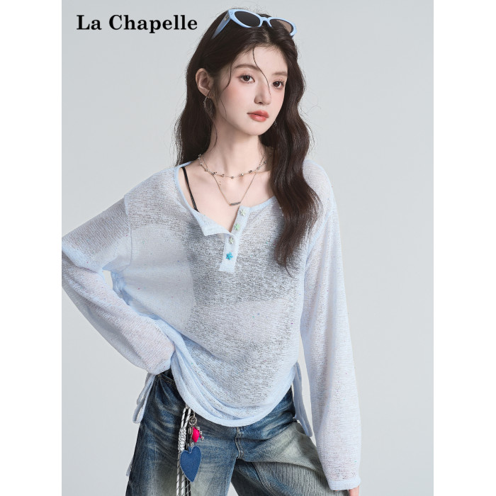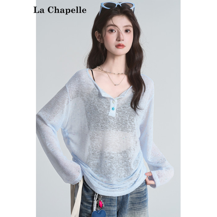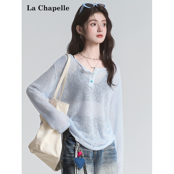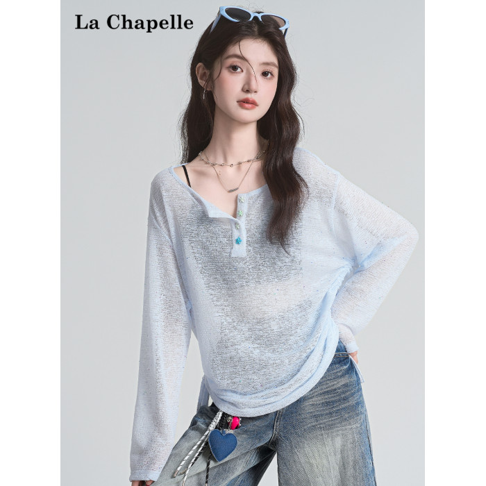 拉夏貝爾韓版長袖防曬罩衫女2025夏季新款抽繩設計薄款寬鬆T恤潮