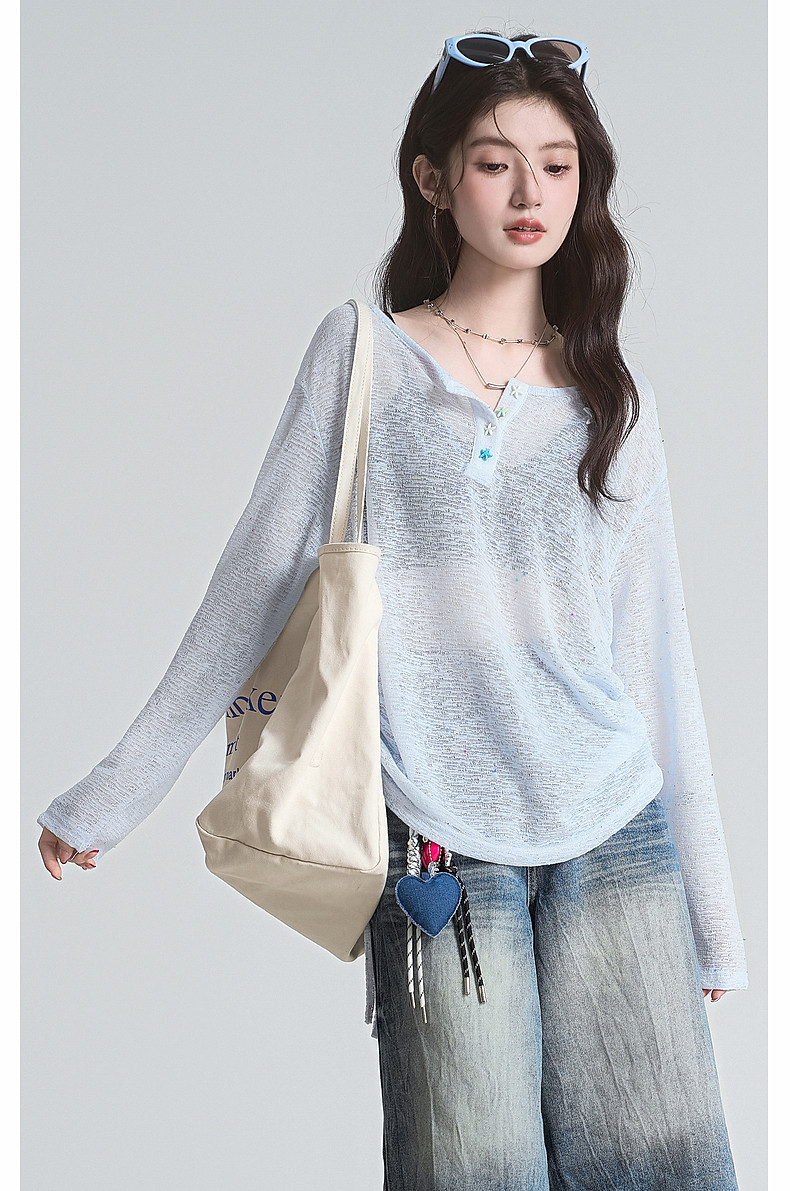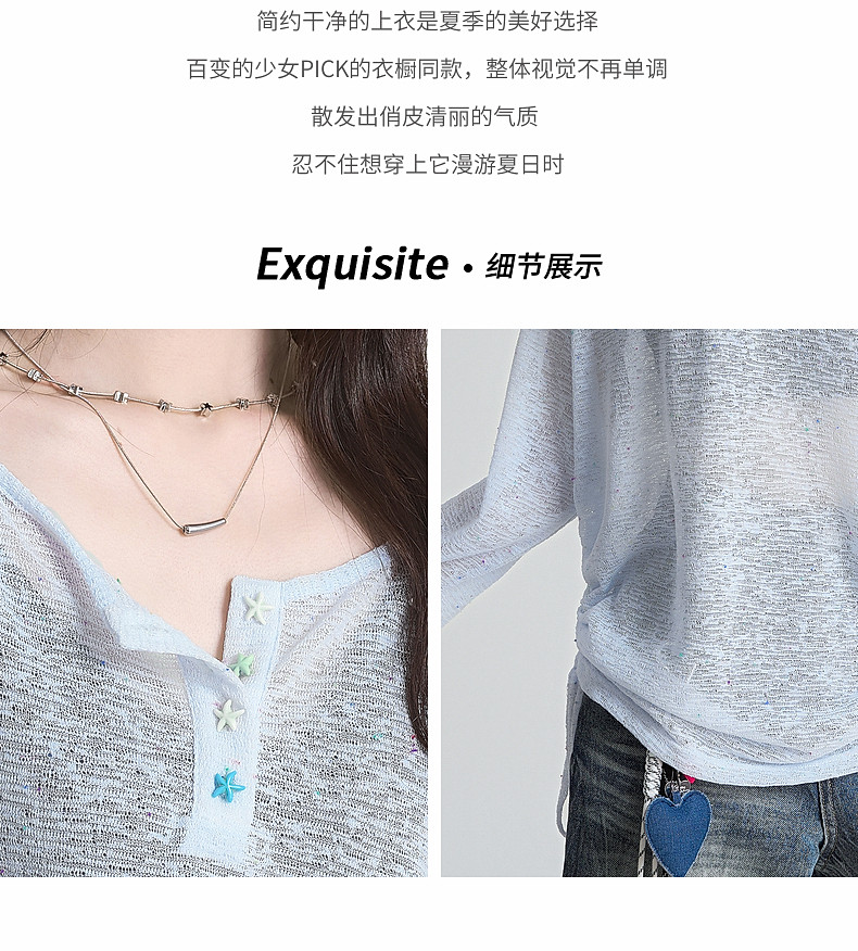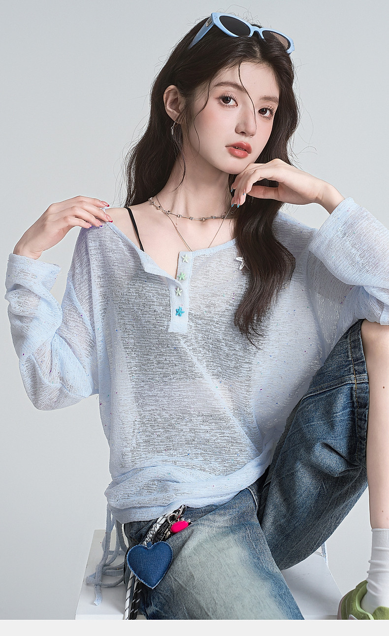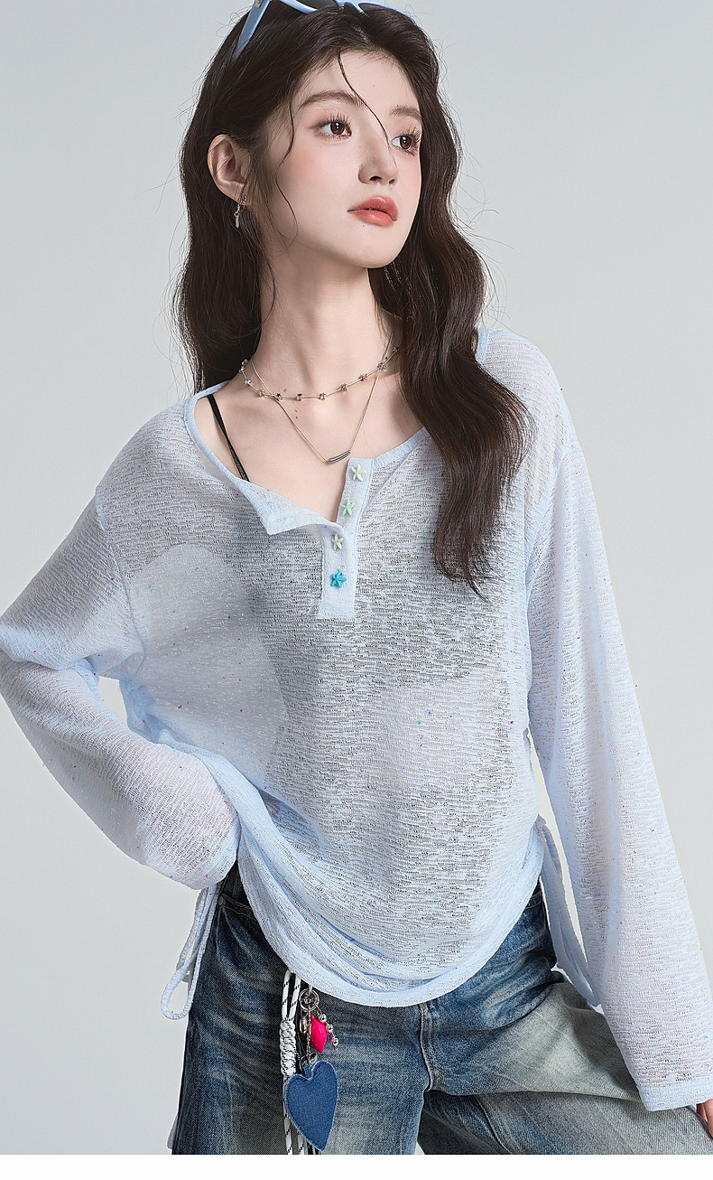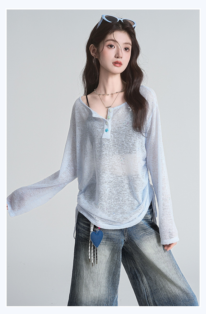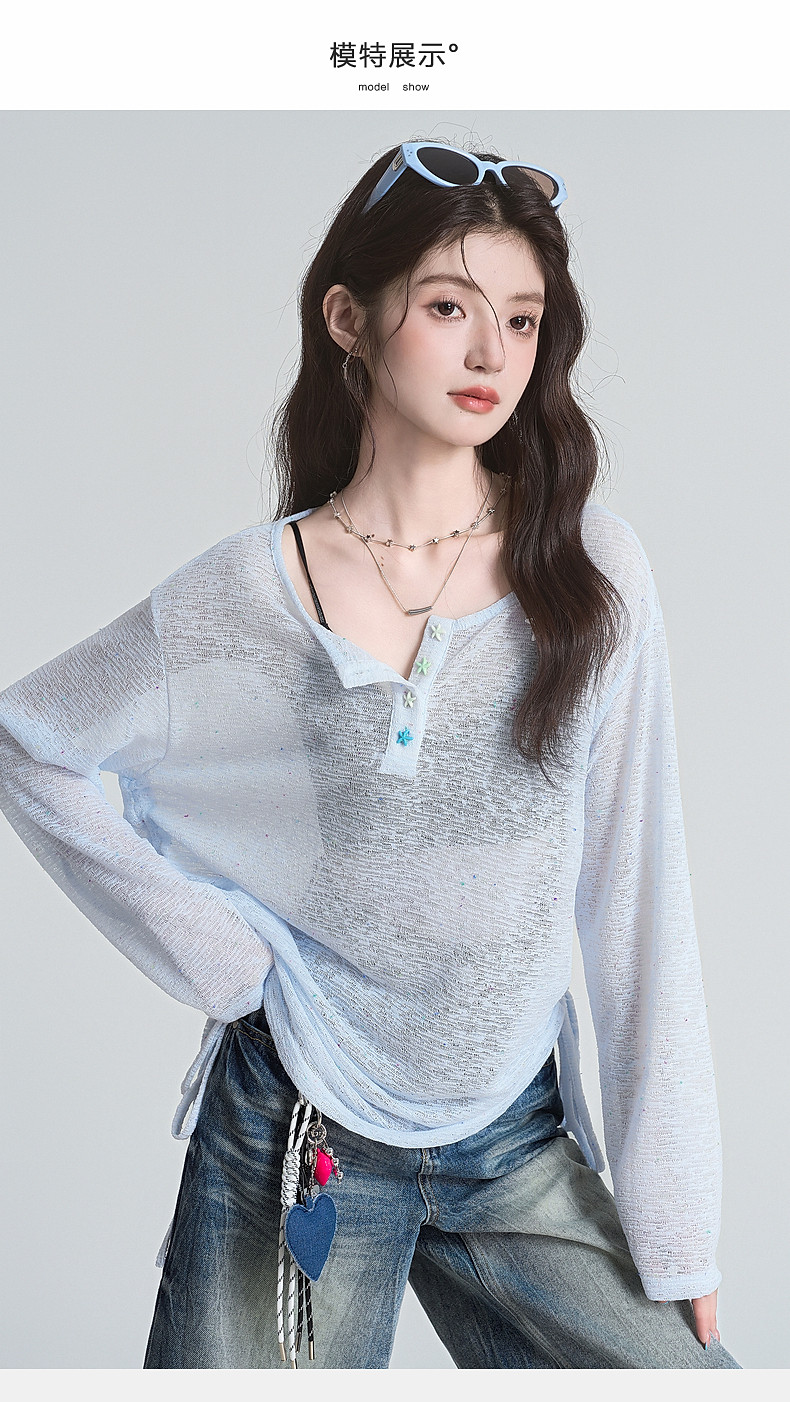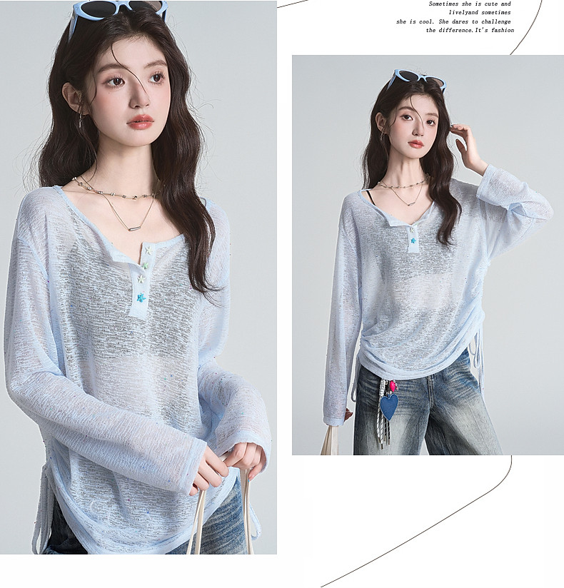拉夏貝爾韓版長袖防曬罩衫女2025夏季新款抽繩設計薄款寬鬆T恤潮