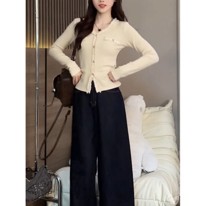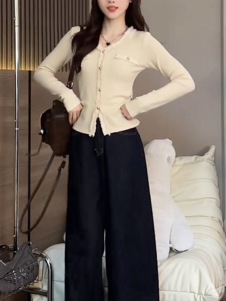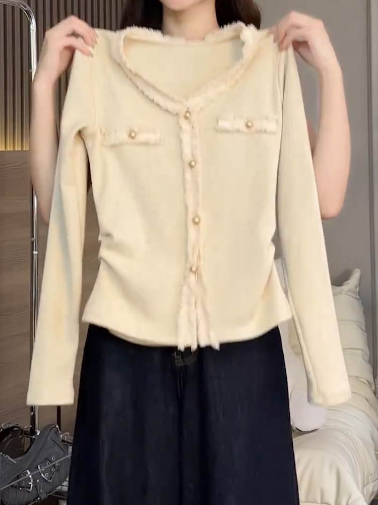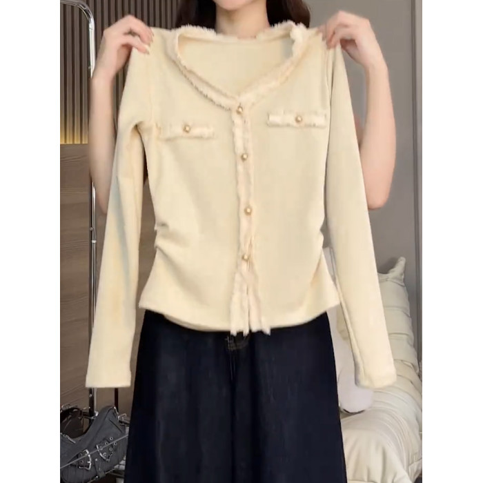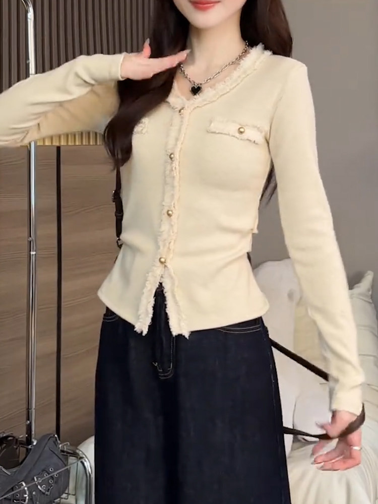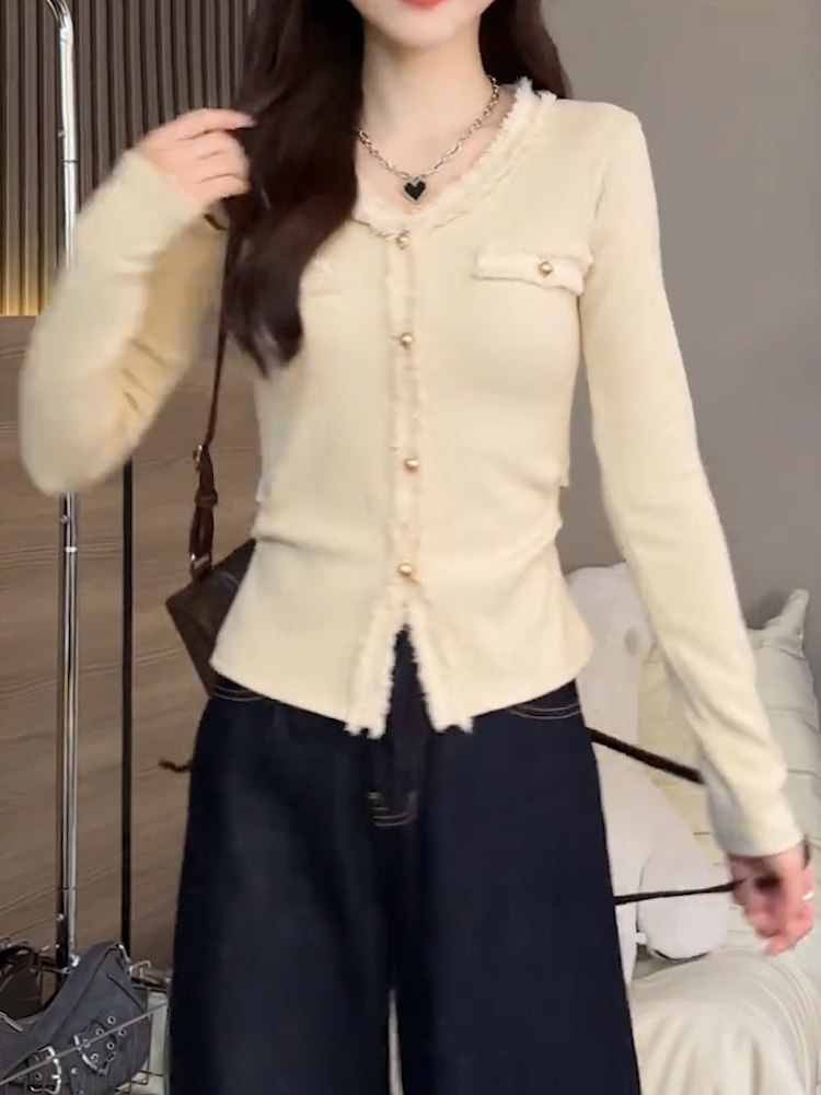 2026秋季新品杏色V領長袖T恤女純色高級氣質小衆質感顯瘦減齡上衣