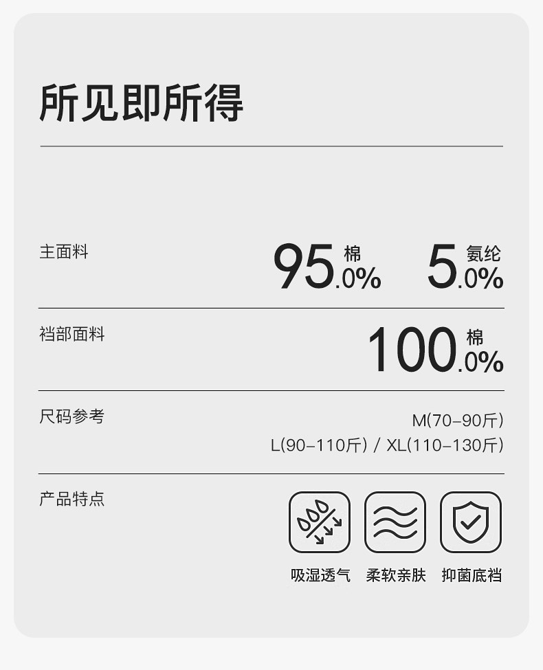 | 襠部材質成分 | 棉95.0% 聚氨酯彈性纖維(氨綸)5.0% |