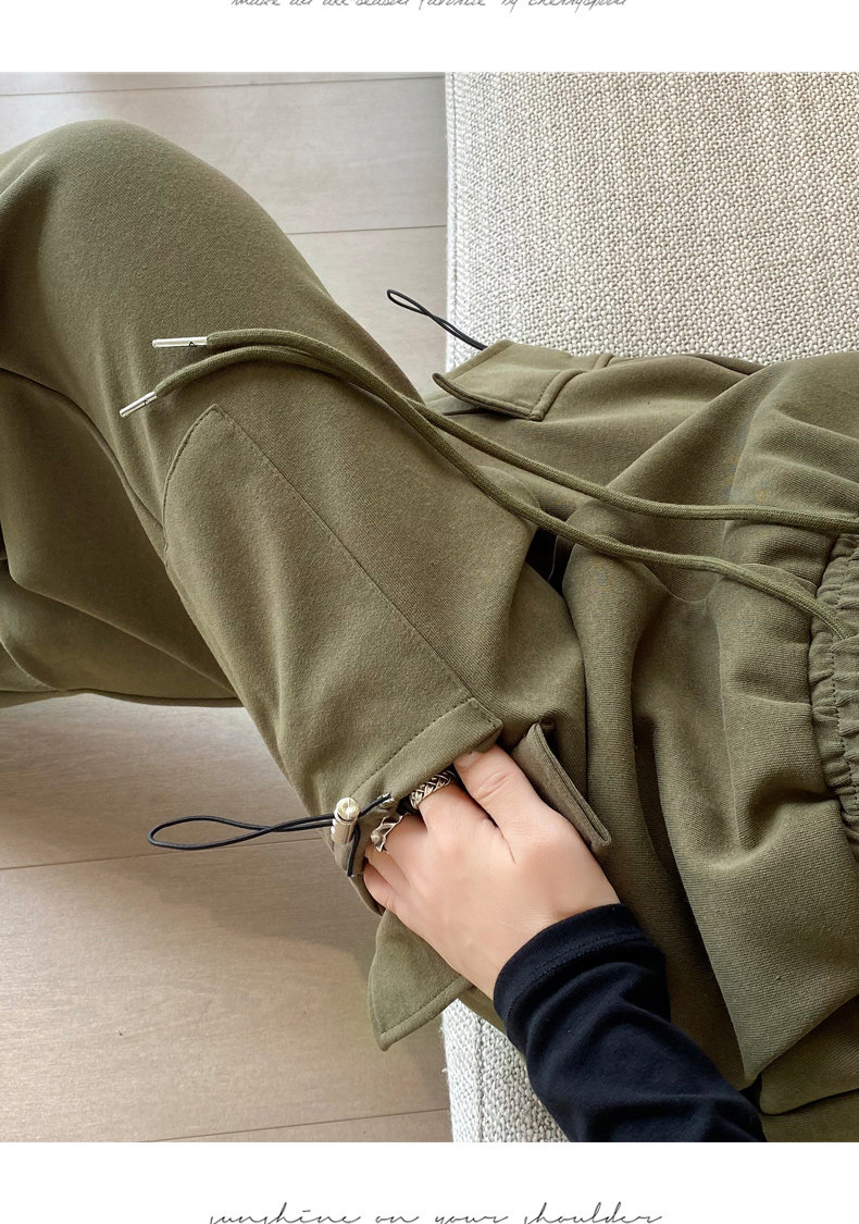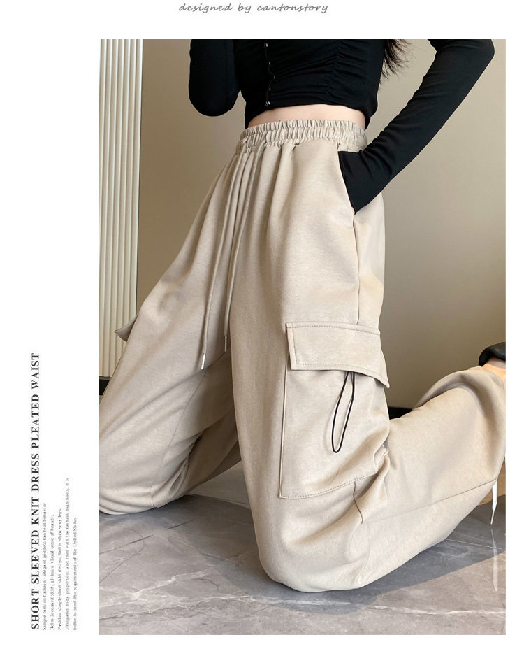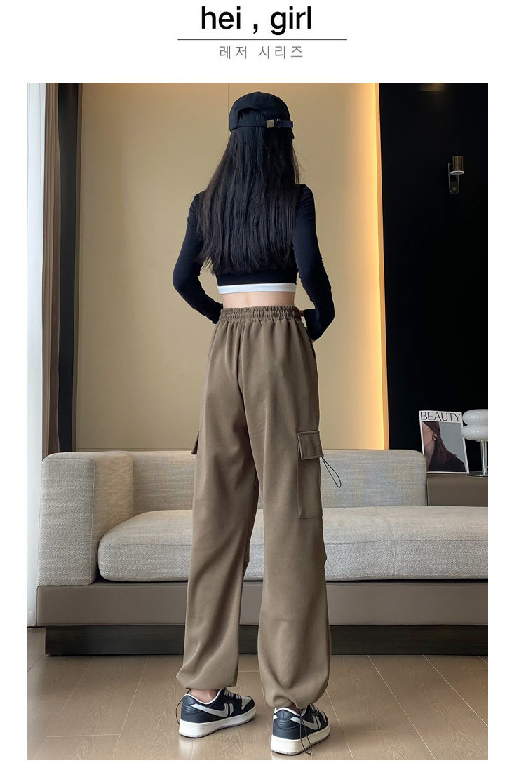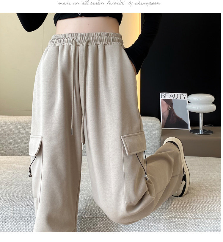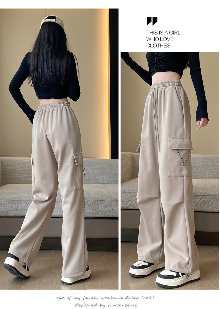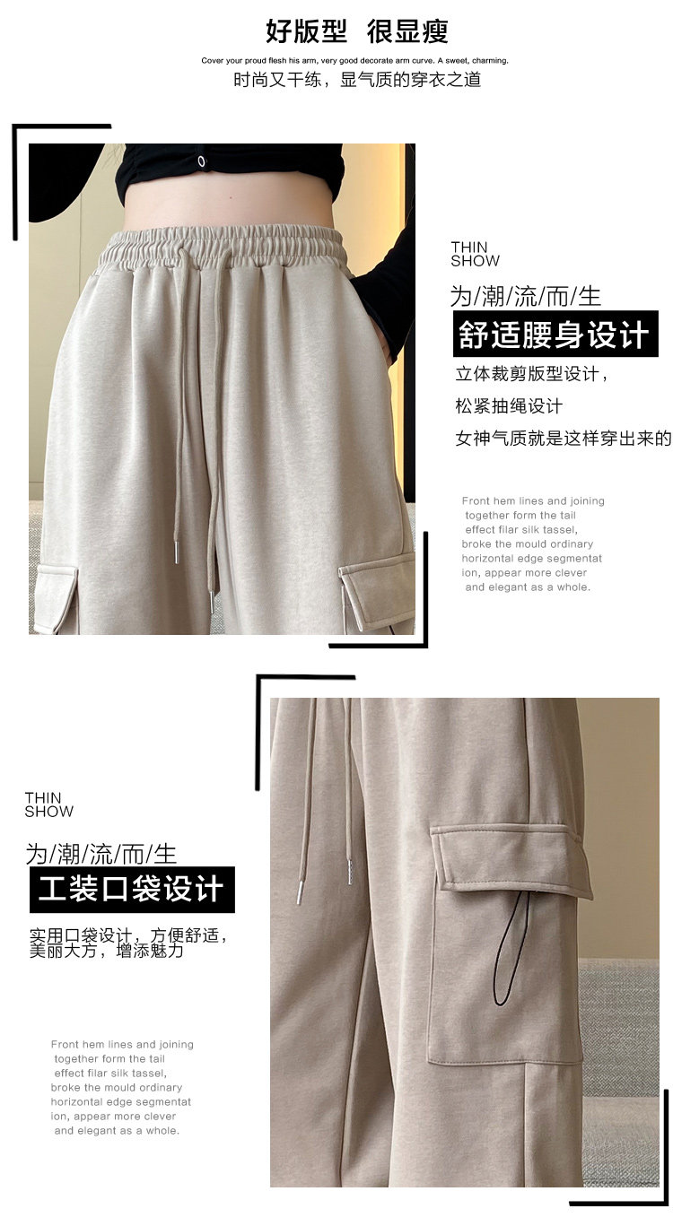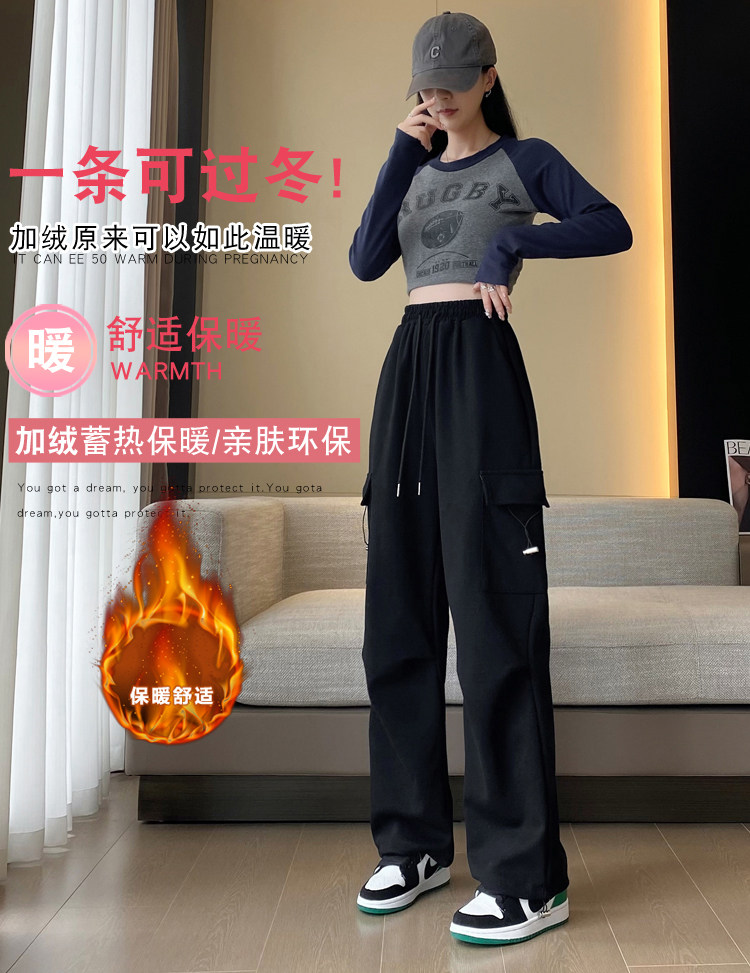 美式加絨工裝褲女秋冬高腰綁帶垂感直筒濶腿褲小個子休閒運動衛褲