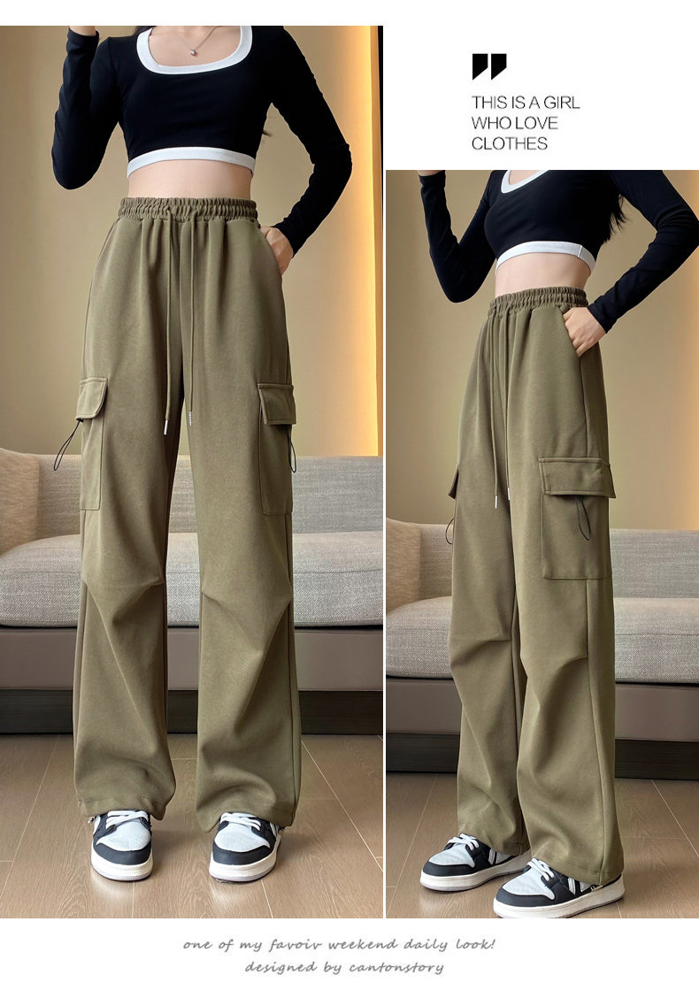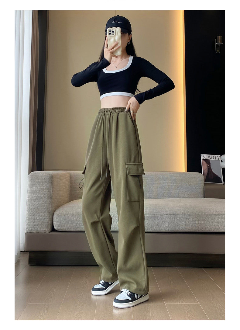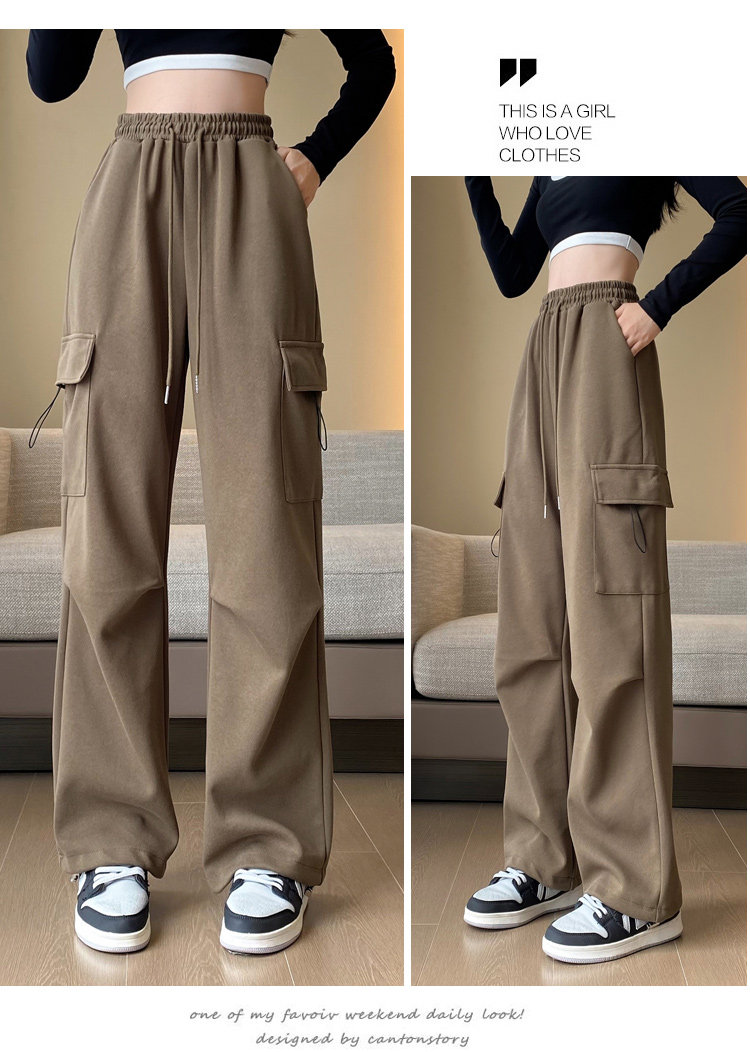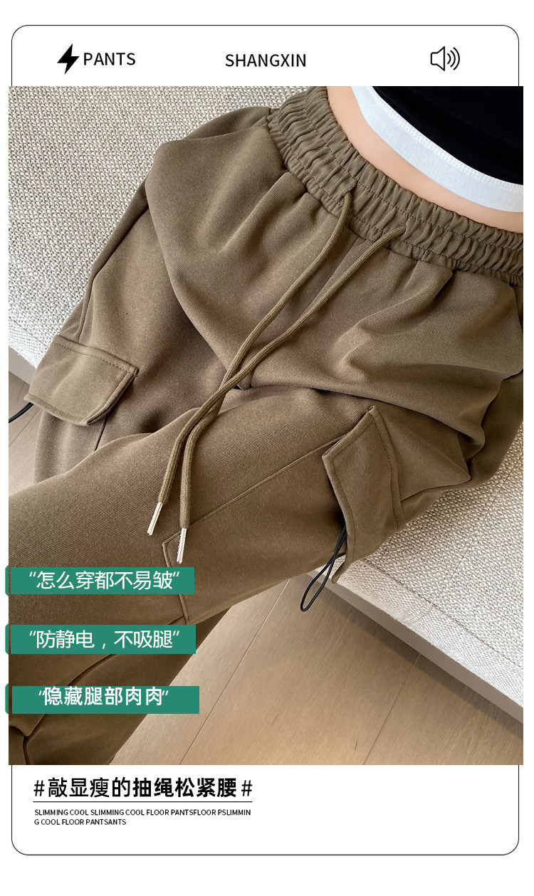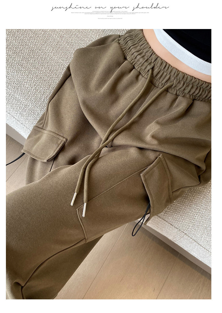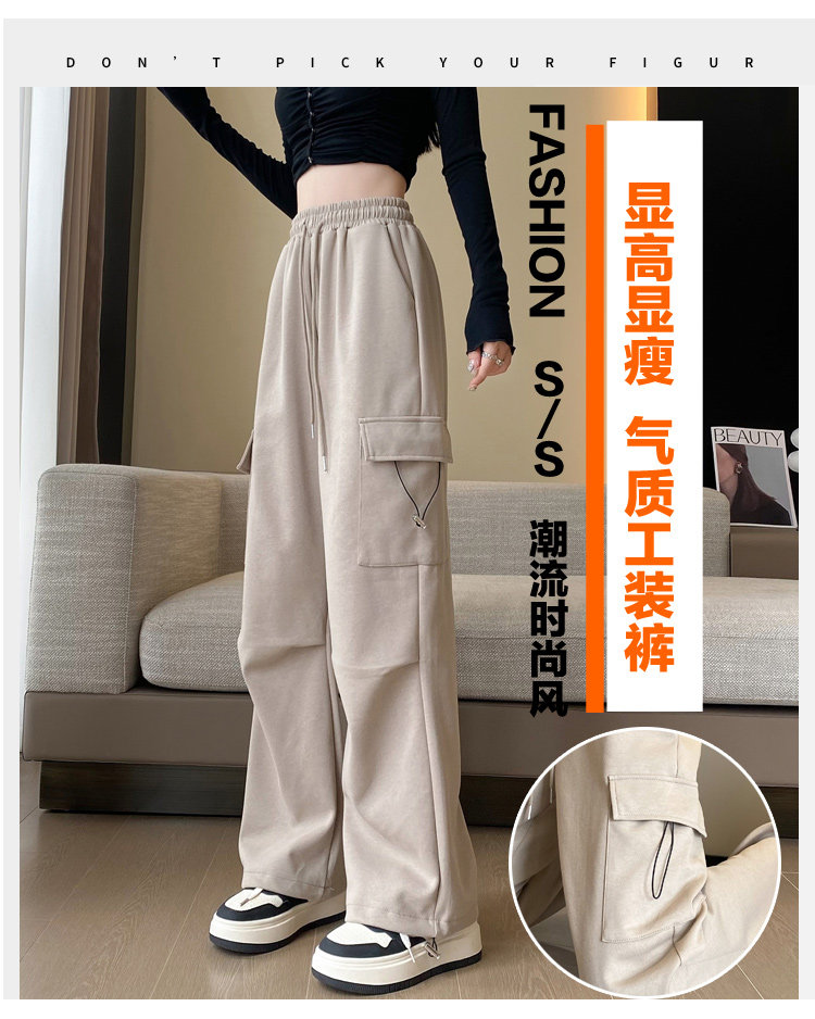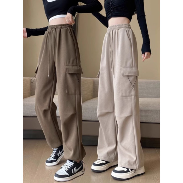 美式加絨工裝褲女秋冬高腰綁帶垂感直筒濶腿褲小個子休閒運動衛褲