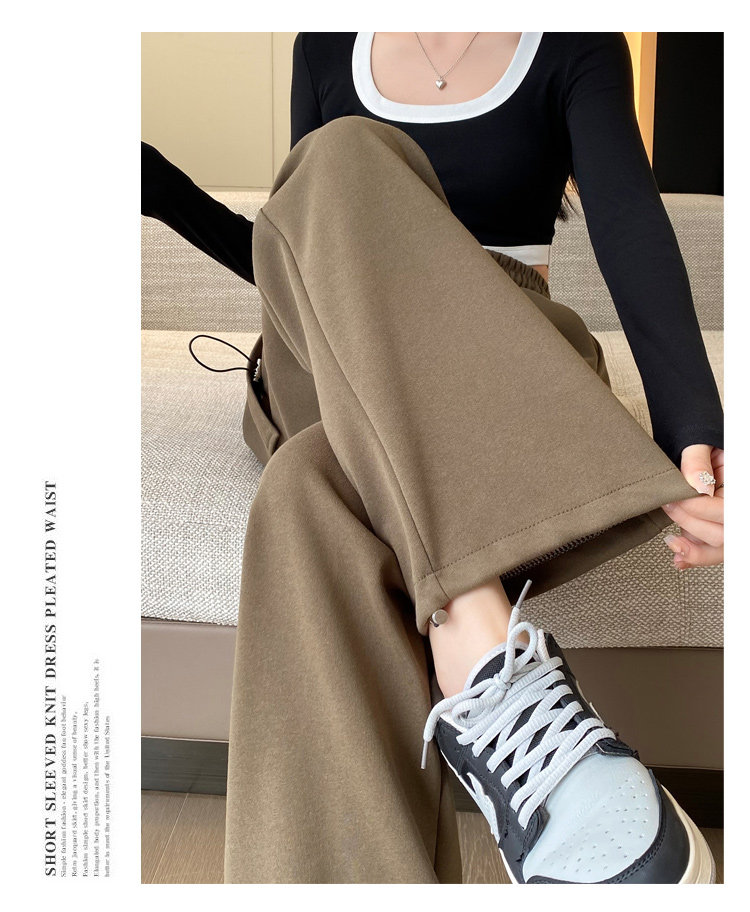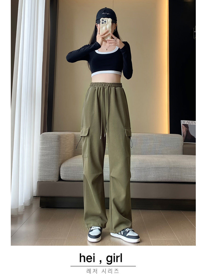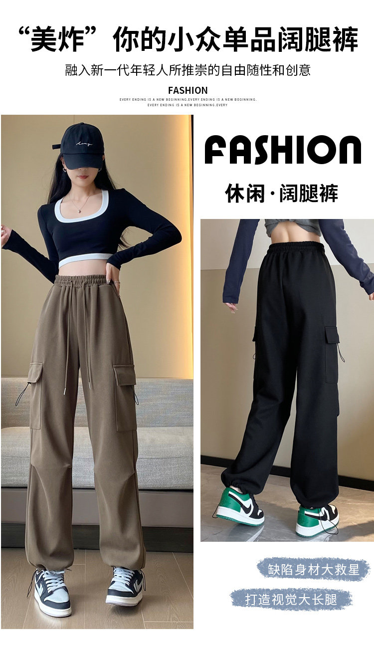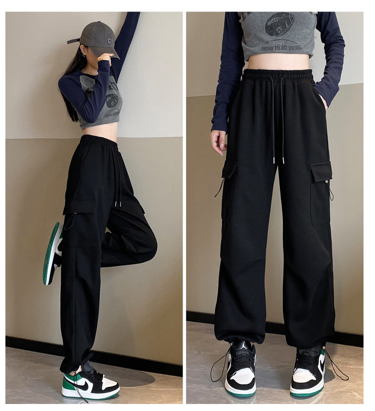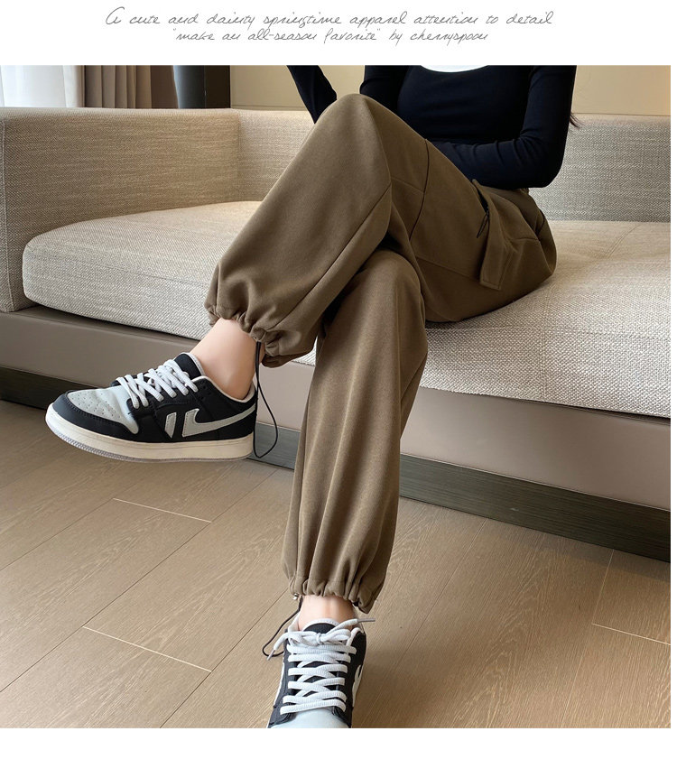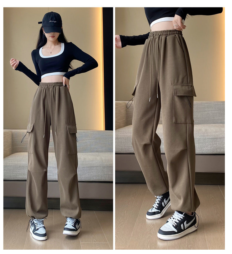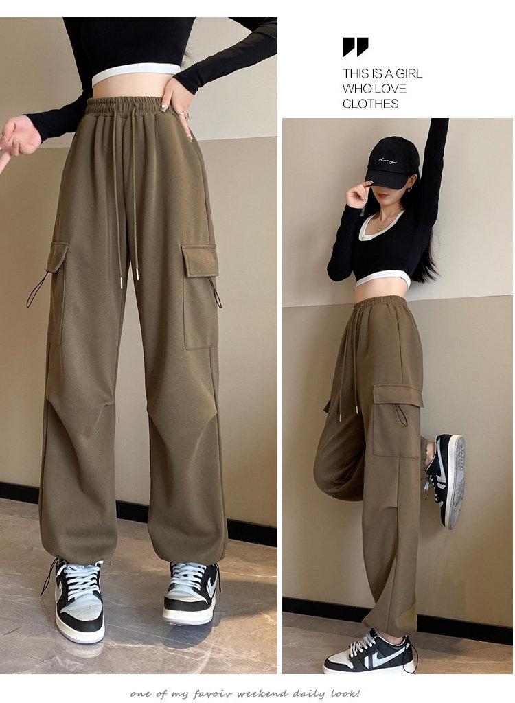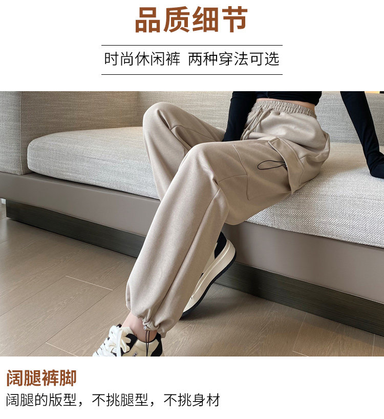 美式加絨工裝褲女秋冬高腰綁帶垂感直筒濶腿褲小個子休閒運動衛褲
