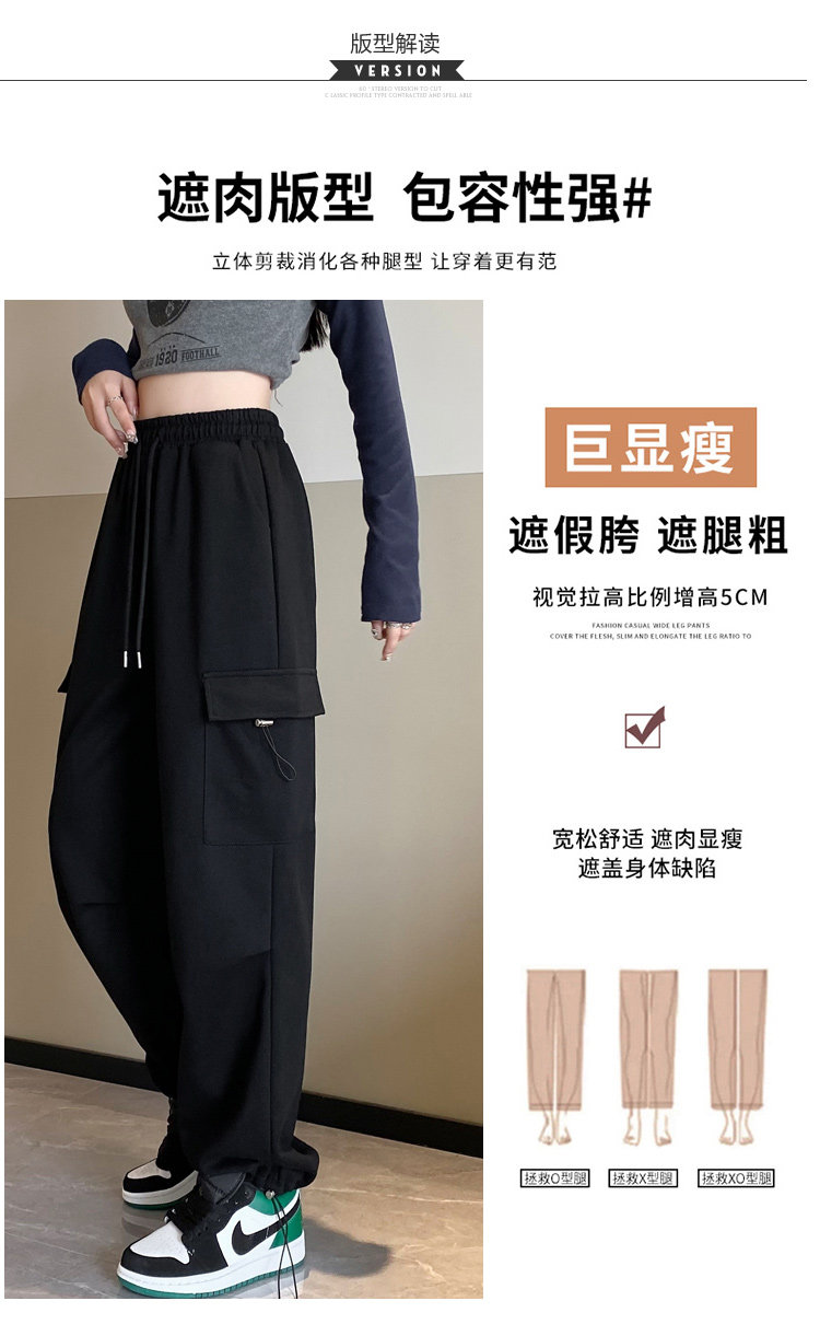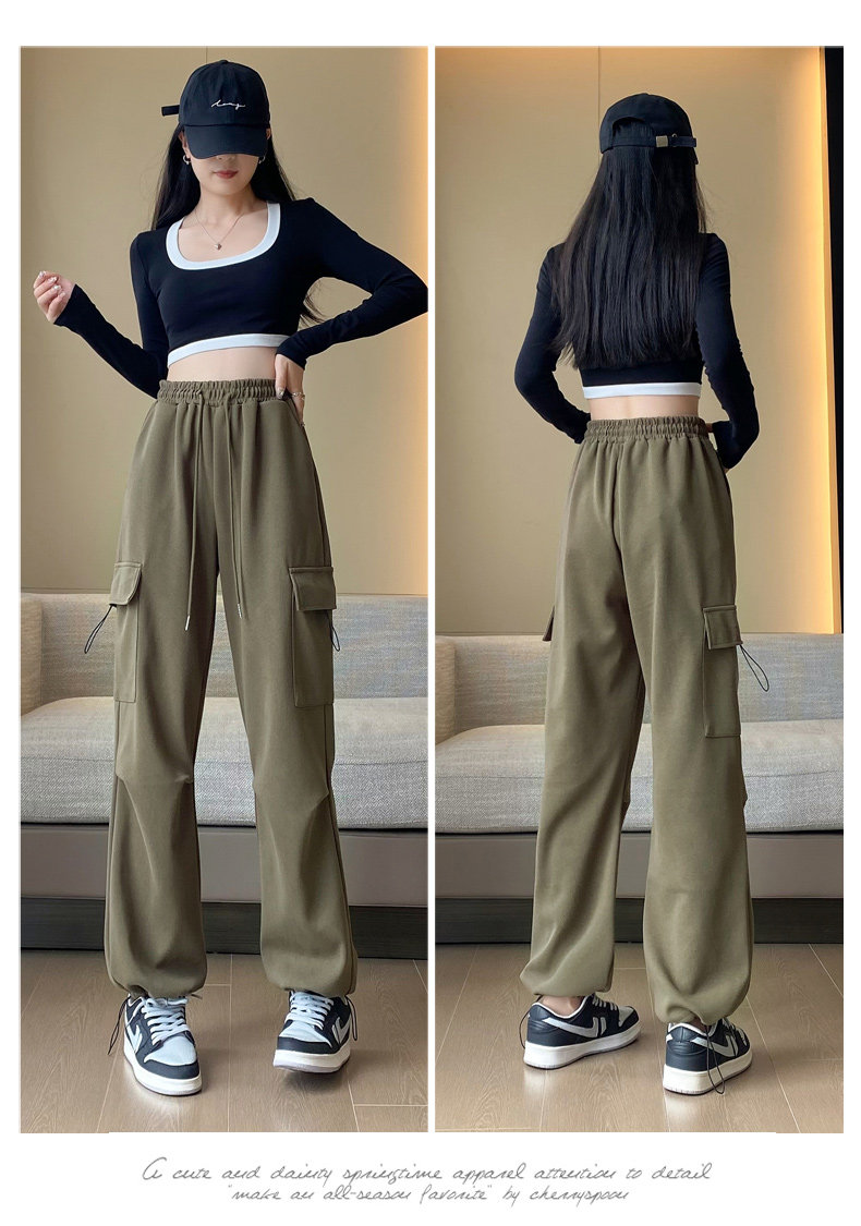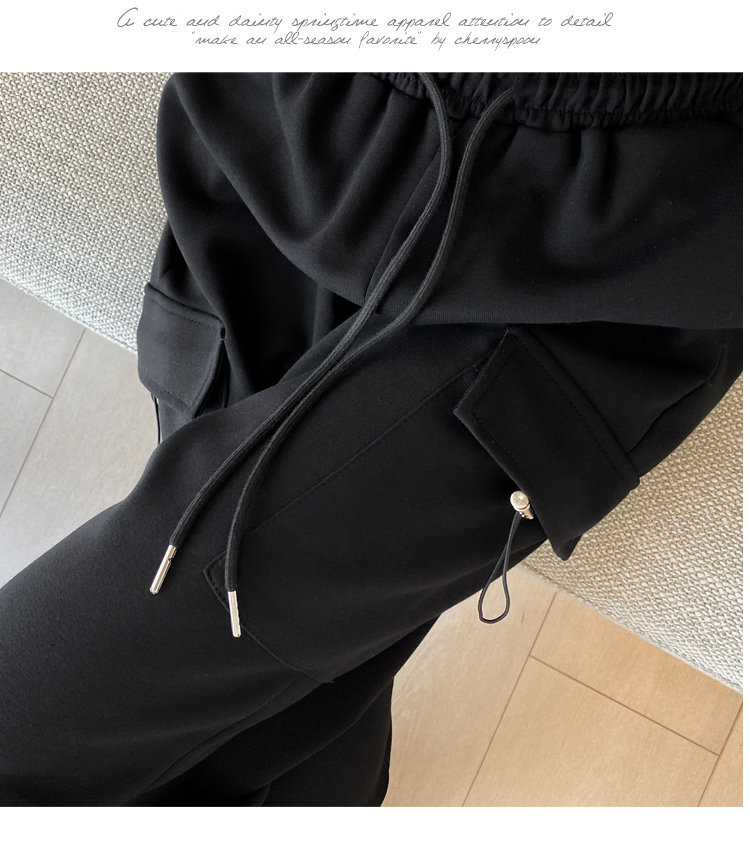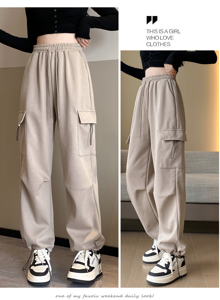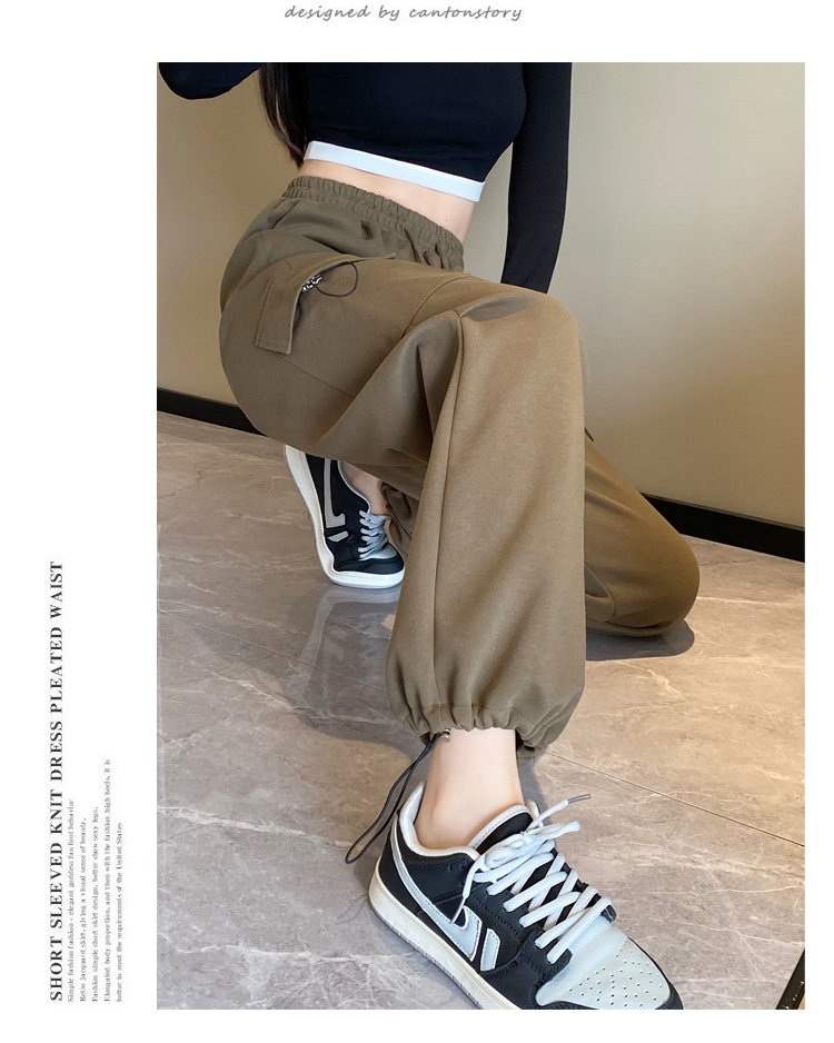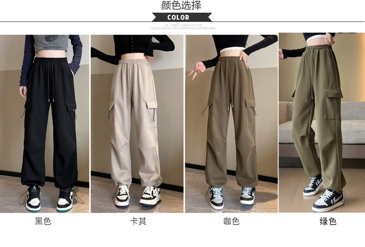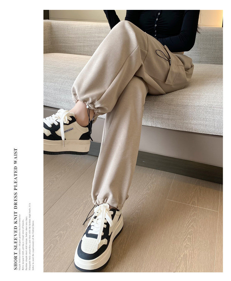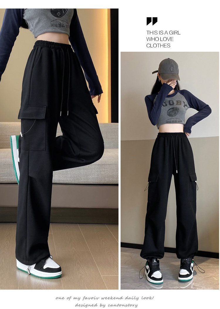 美式加絨工裝褲女秋冬高腰綁帶垂感直筒濶腿褲小個子休閒運動衛褲