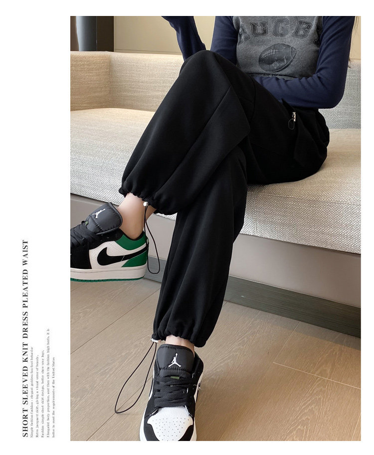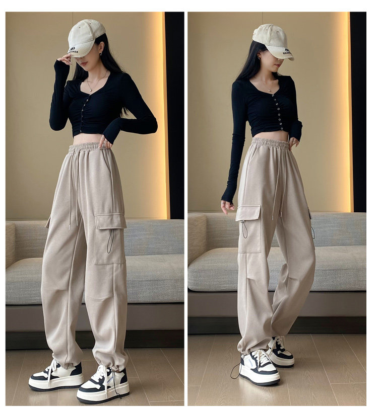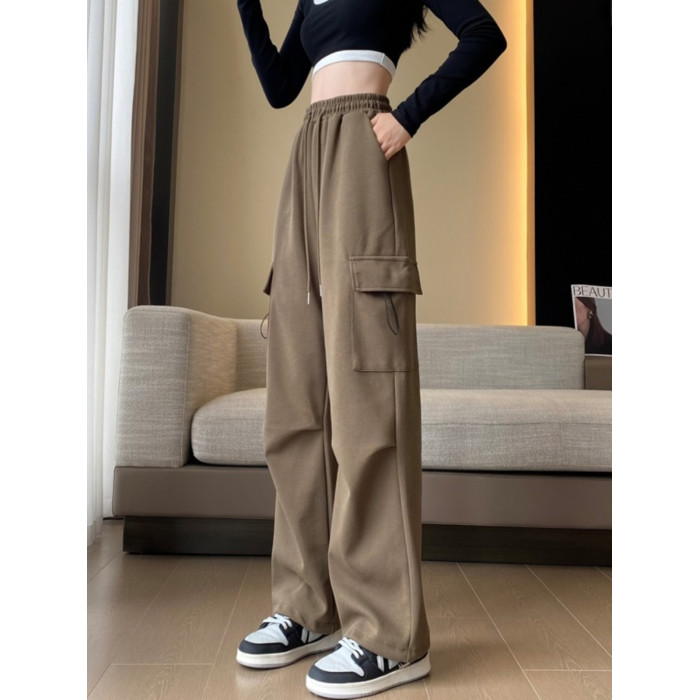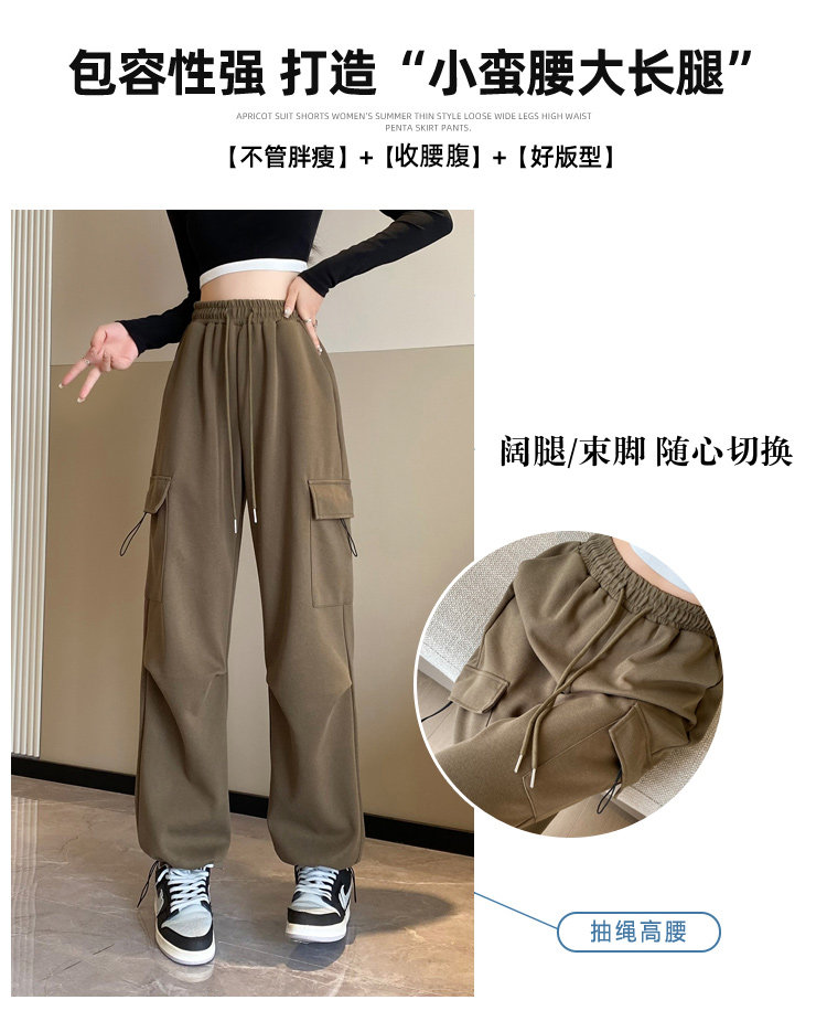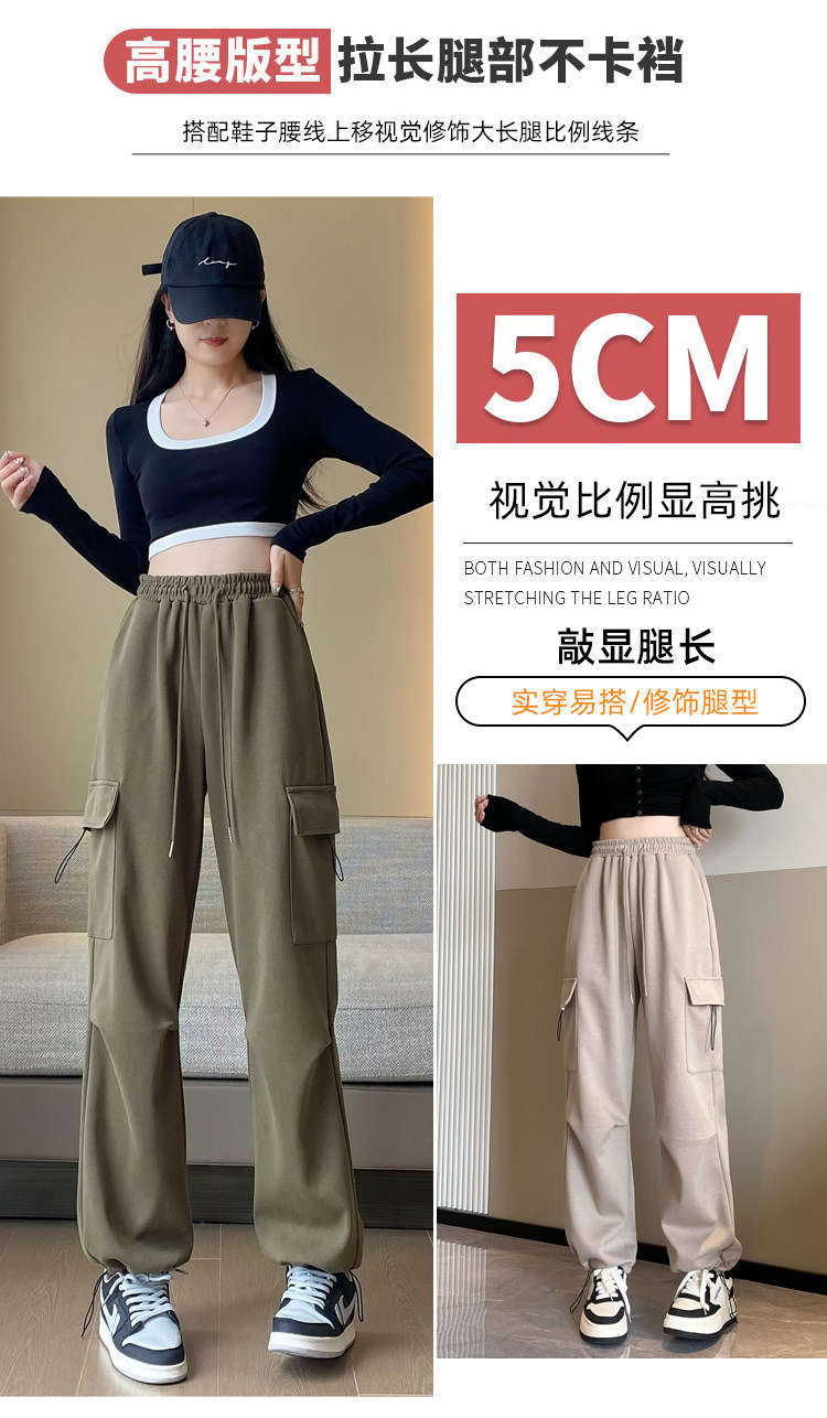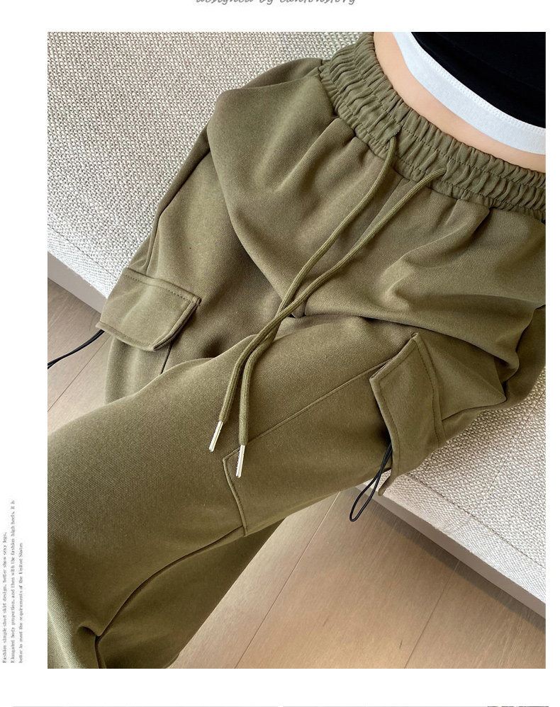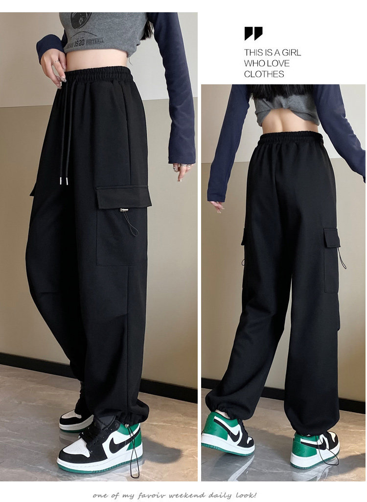 美式加絨工裝褲女秋冬高腰綁帶垂感直筒濶腿褲小個子休閒運動衛褲